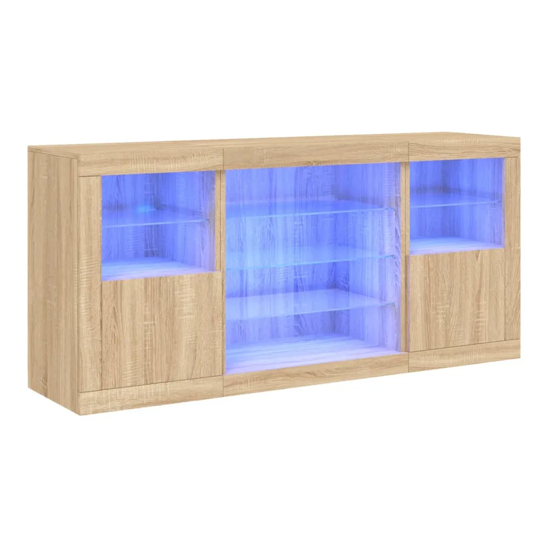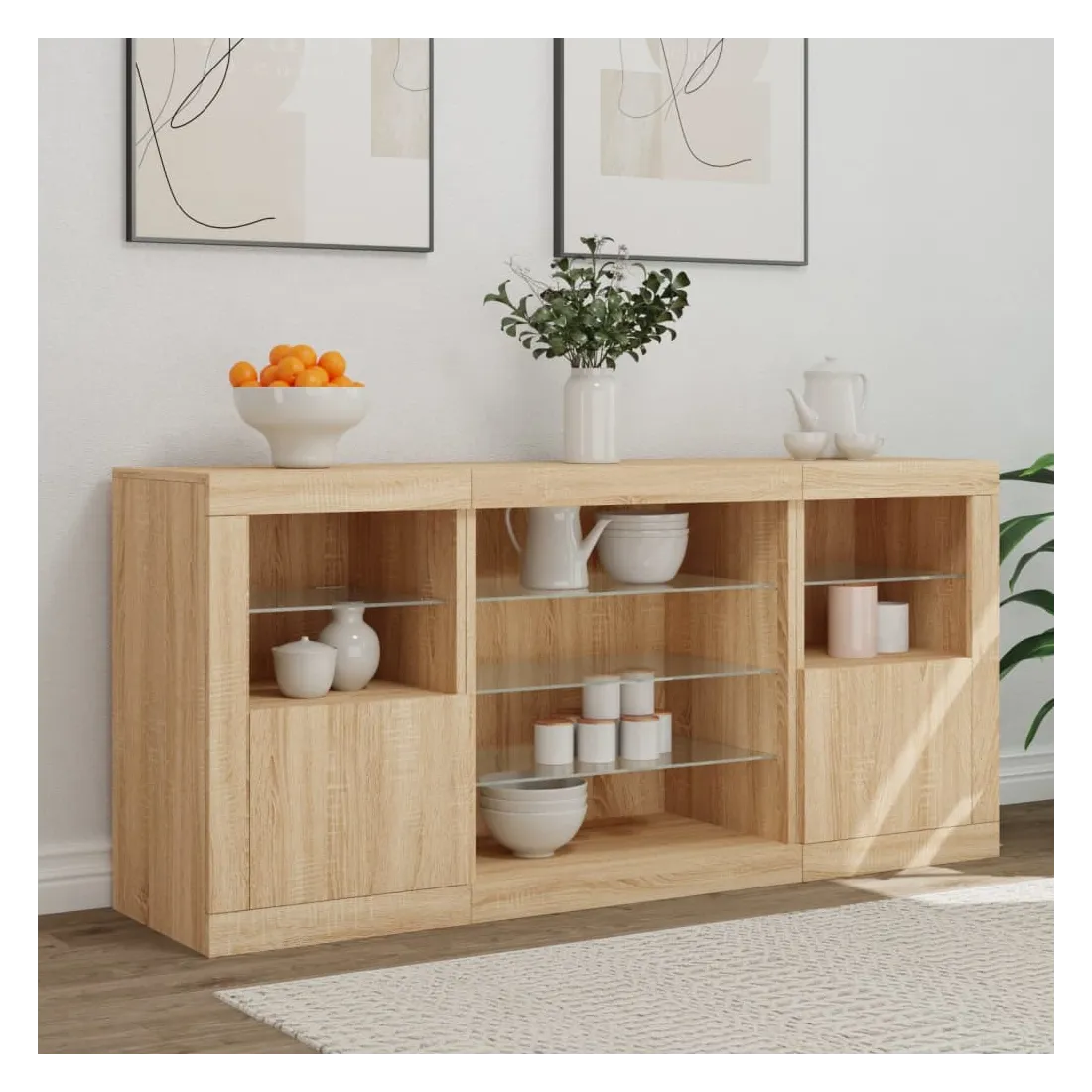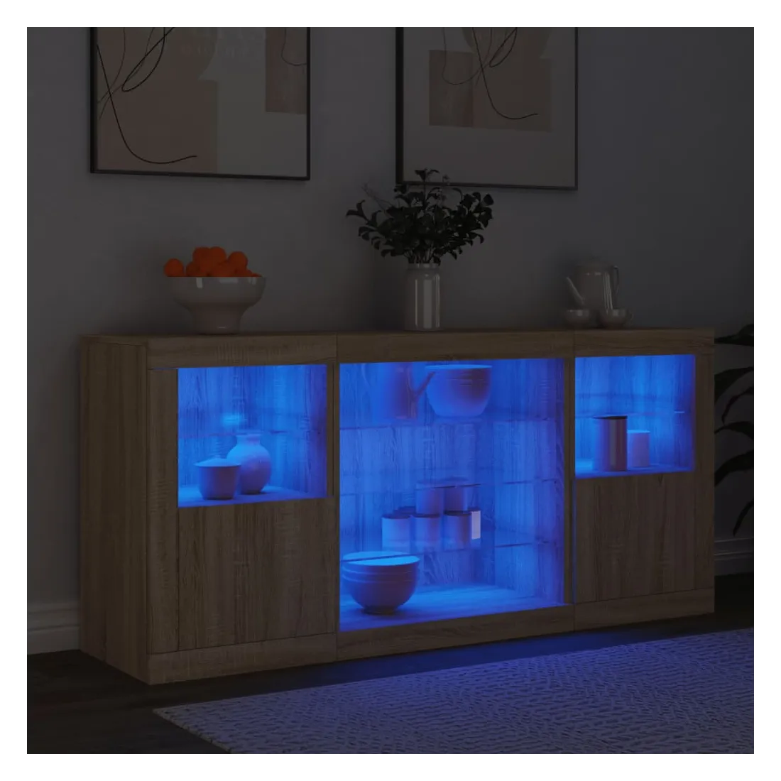 Décorez votre pièce avec ce buffet moderne avec éclairage LED, il s'harmonise facilement avec les meubles de tout style de votre maison. Matériau durable : le bois d'ingénierie est d'une qualité exceptionnelle avec une surface lisse et présente également résistance, stabilité et résistance à l'humidité.Lumières LED RVB : le buffet est équipé de lumières LED RVB vibrantes. Avec divers menus personnalisables, vous pouvez changer sans effort la couleur des lumières et même les régler automatiquement. Ces lumières LED renforcent non seulement l'aspect contemporain du buffet, mais aussi son attrait pour la mode.Grand espace de rangement : l'armoire de rangement offre beaucoup d'espace pour garder vos objets du quotidien bien rangés et facilement accessibles.Fonction d'exposition : la partie supérieure robuste de l'armoire d'entrée est idéale pour exposer des objets décoratifs, des cadres photo ou des plantes en pot.Porte pratiques : gardez vos essentiels à l'abri de la poussière en les cachant derrière les portes de l'armoire latérale. Bon à savoir :Ce produit est doté d'un connecteur USB qui nécessite une source d'alimentation USB de 5V certifiée (non incluse). Attention :Pour éviter qu'il ne soit renversé, ce produit doit être utilisé avec le dispositif de fixation au mur fourni.