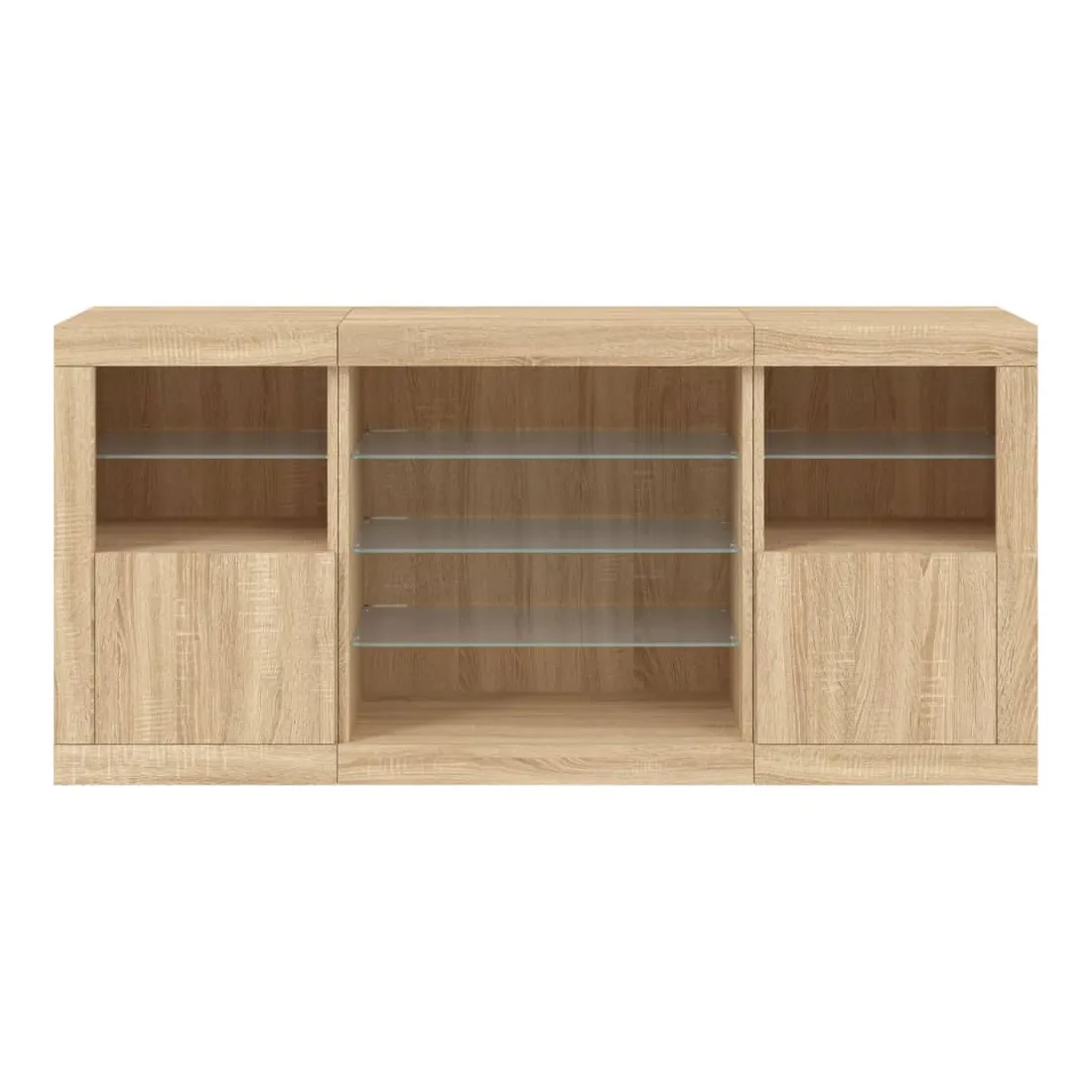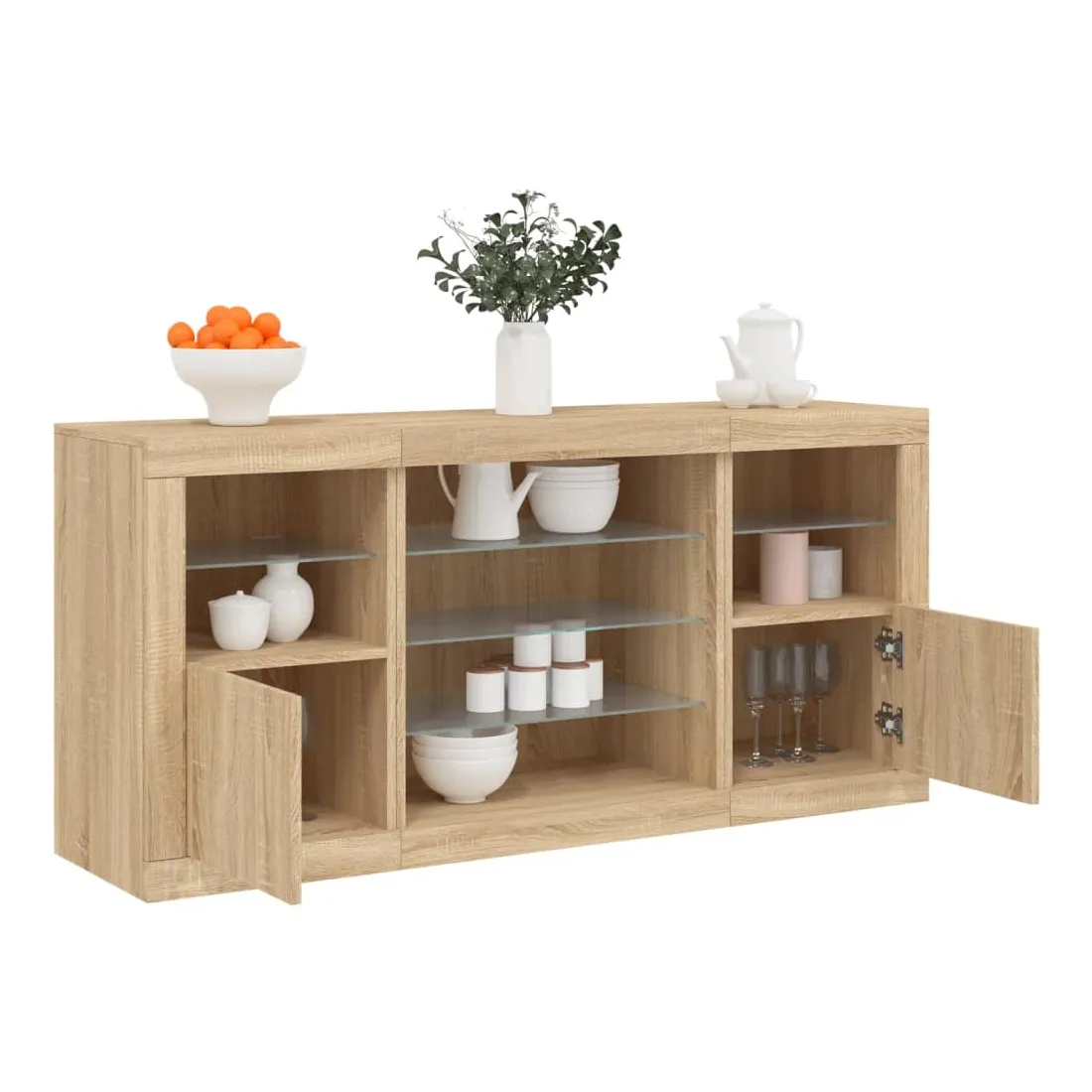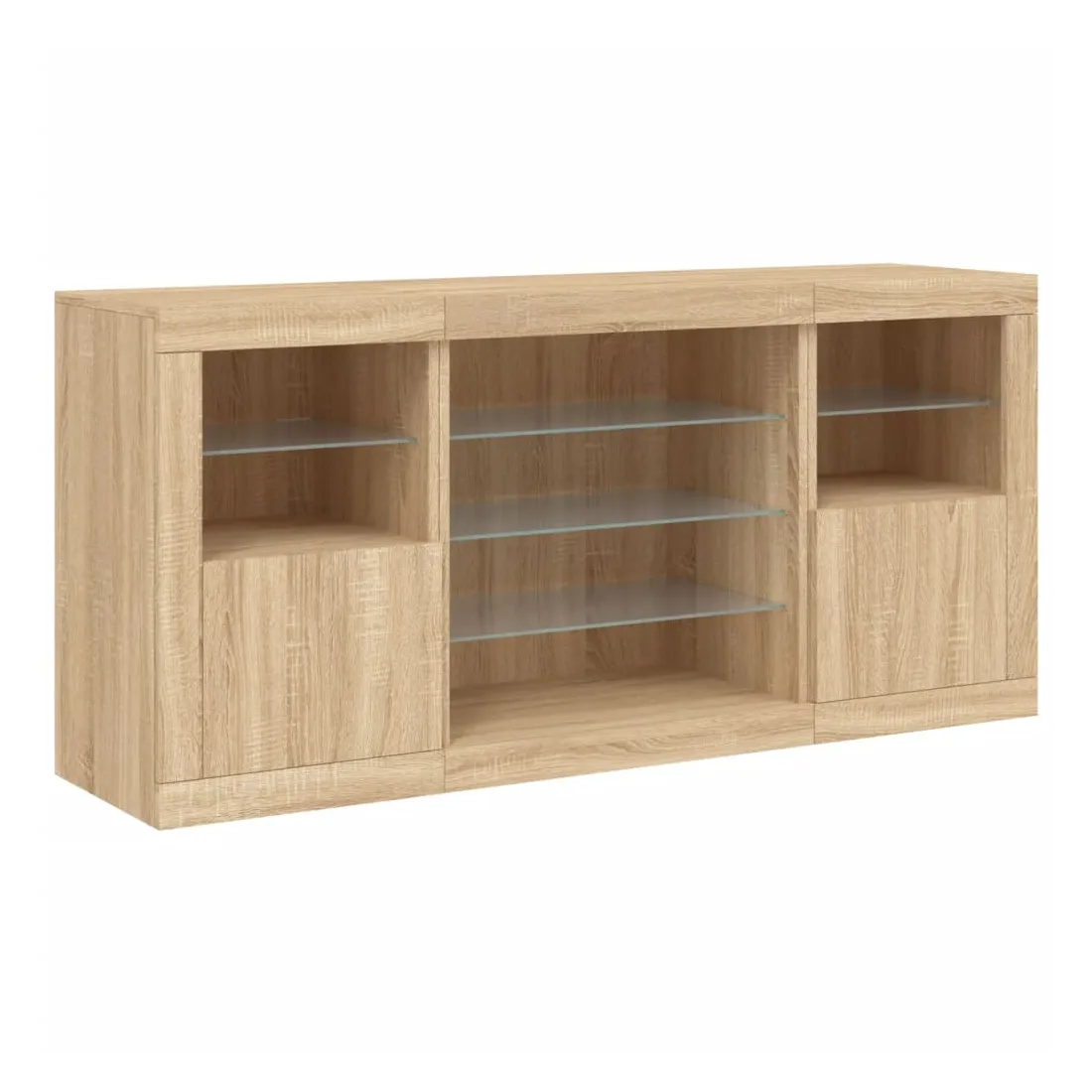 Décorez votre pièce avec ce buffet moderne avec éclairage LED, il s'harmonise facilement avec les meubles de tout style de votre maison. Matériau durable : le bois d'ingénierie est d'une qualité exceptionnelle avec une surface lisse et présente également résistance, stabilité et résistance à l'humidité.Lumières LED RVB : le buffet est équipé de lumières LED RVB vibrantes. Avec divers menus personnalisables, vous pouvez changer sans effort la couleur des lumières et même les régler automatiquement. Ces lumières LED renforcent non seulement l'aspect contemporain du buffet, mais aussi son attrait pour la mode.Grand espace de rangement : l'armoire de rangement offre beaucoup d'espace pour garder vos objets du quotidien bien rangés et facilement accessibles.Fonction d'exposition : la partie supérieure robuste de l'armoire d'entrée est idéale pour exposer des objets décoratifs, des cadres photo ou des plantes en pot.Porte pratiques : gardez vos essentiels à l'abri de la poussière en les cachant derrière les portes de l'armoire latérale. Bon à savoir :Ce produit est doté d'un connecteur USB qui nécessite une source d'alimentation USB de 5V certifiée (non incluse). Attention :Pour éviter qu'il ne soit renversé, ce produit doit être utilisé avec le dispositif de fixation au mur fourni.