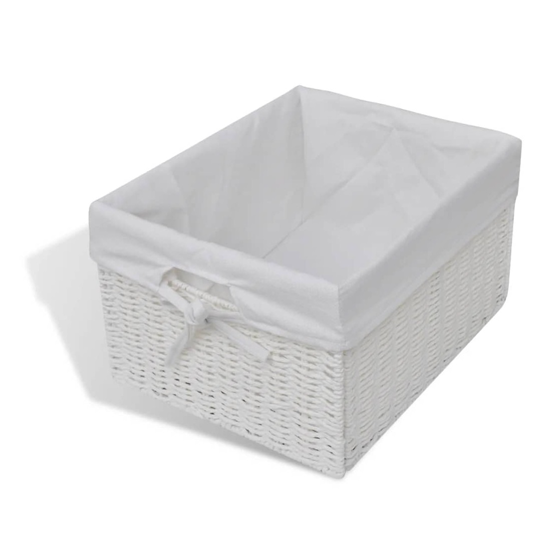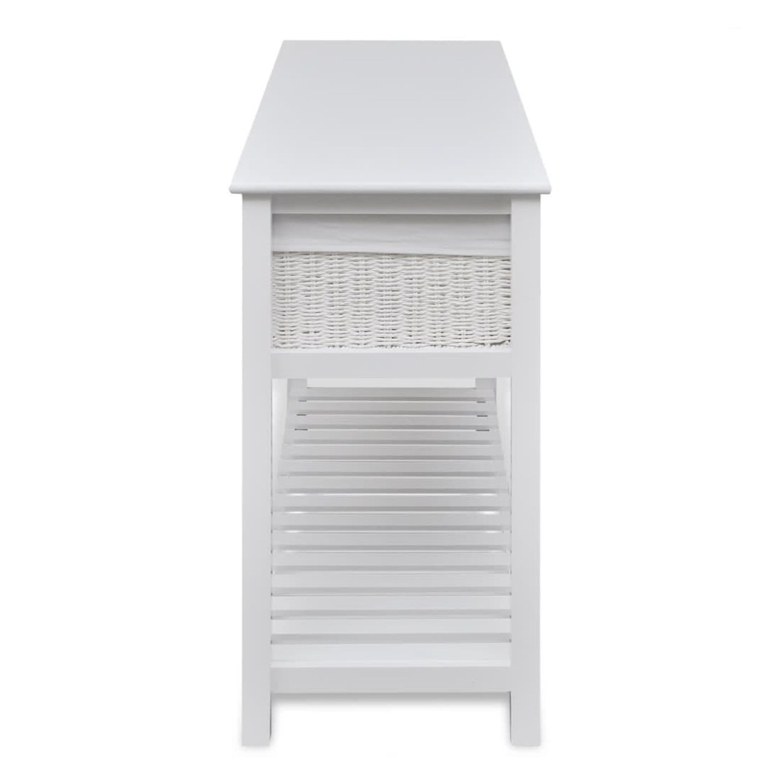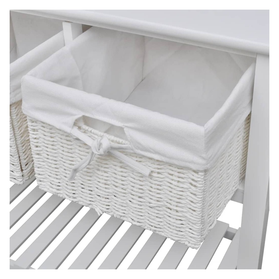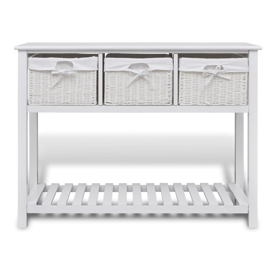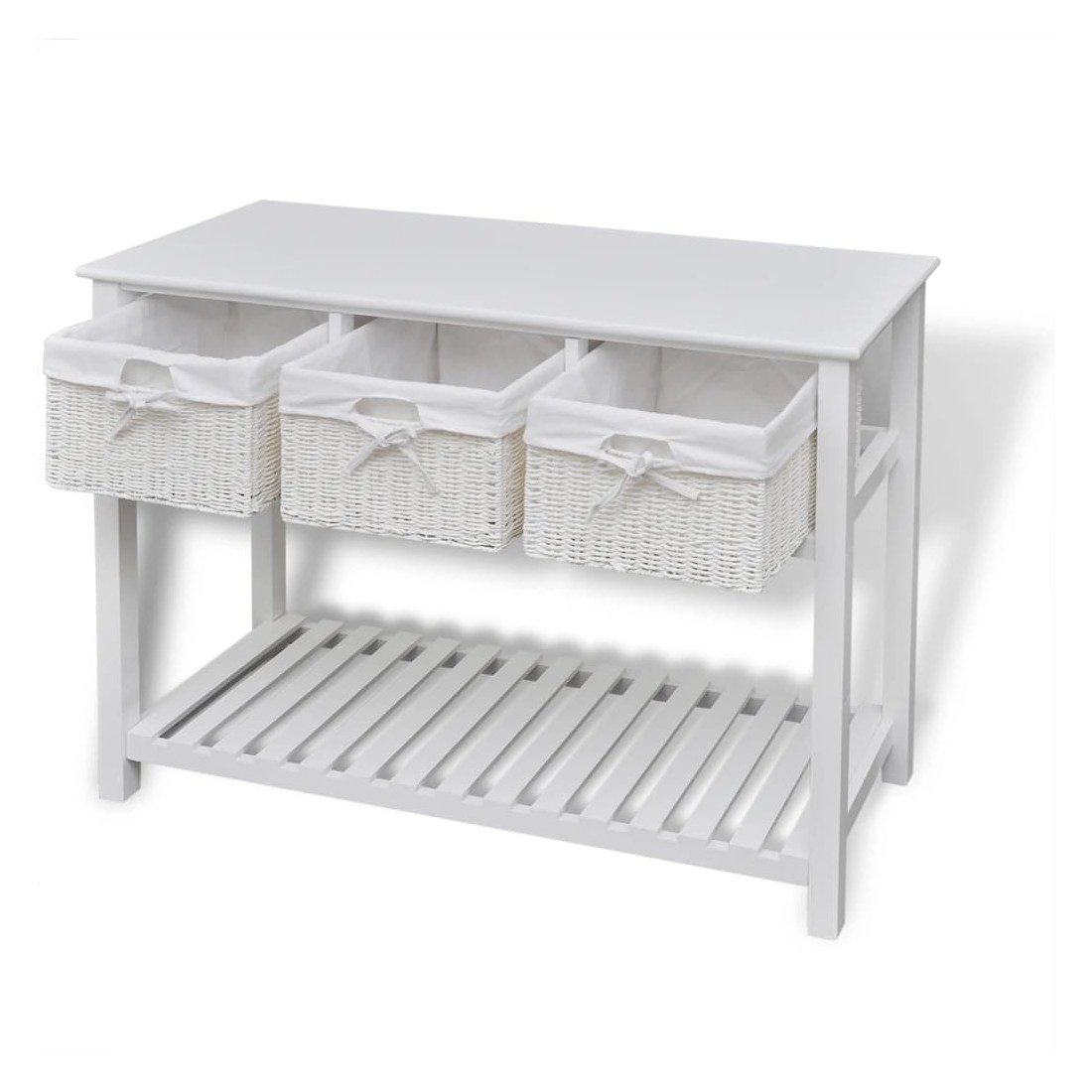 Ce buffet blanc de rangement, minimaliste romantique, avec paniers tissés présente une excellente solution de rangement pour la chambre à coucher, le couloir ou la salle de bain. Cette unité de stockage, faite de matériau de haute qualité, a trois paniers tissés et un niveau inférieur en lattes. Chaque panier a une doublure en tissu lavable. Les lattes aident à garder les articles stockés, ventilés et secs. Cette table d'appoint avec rangement en bois deviendra l'un de vos meubles préférés !