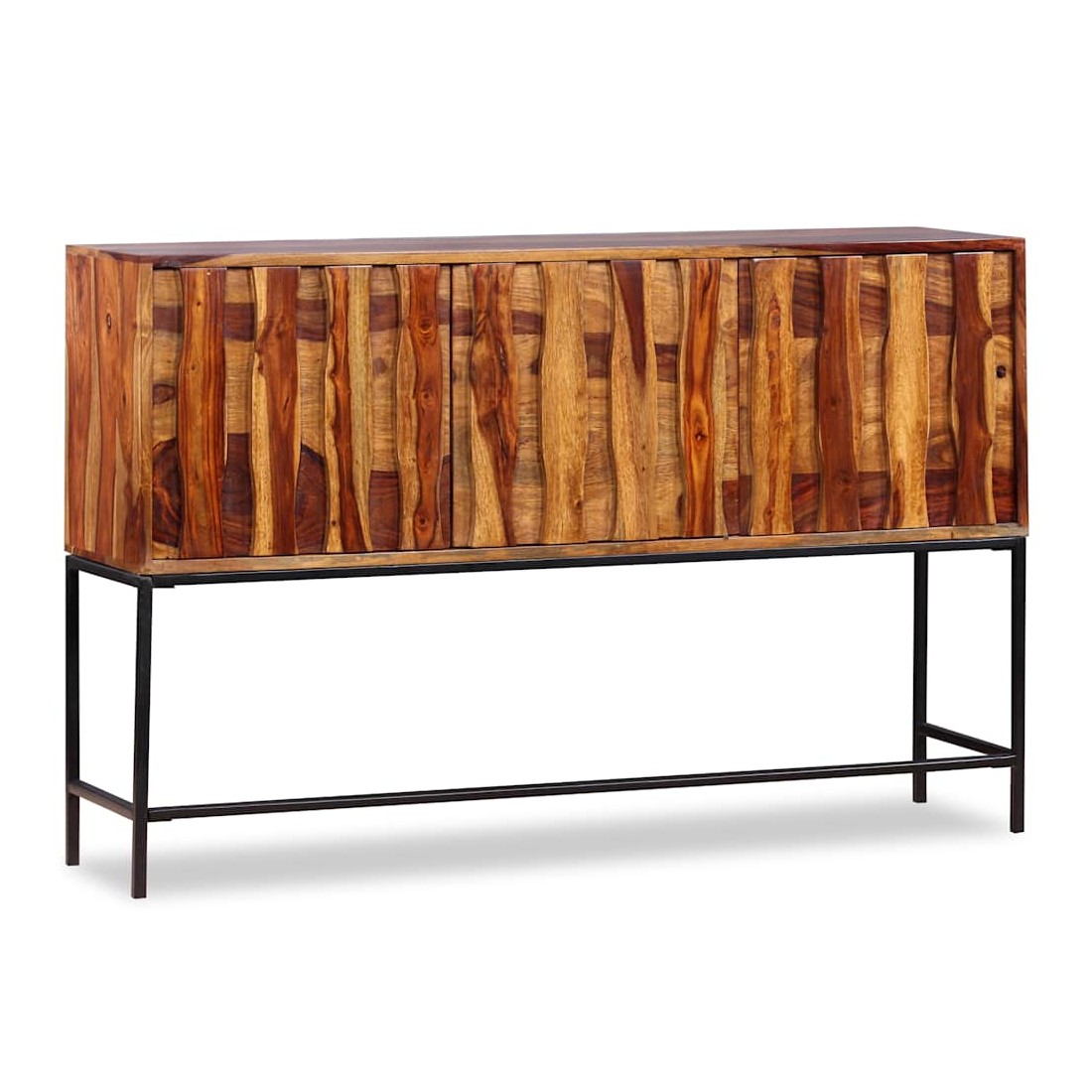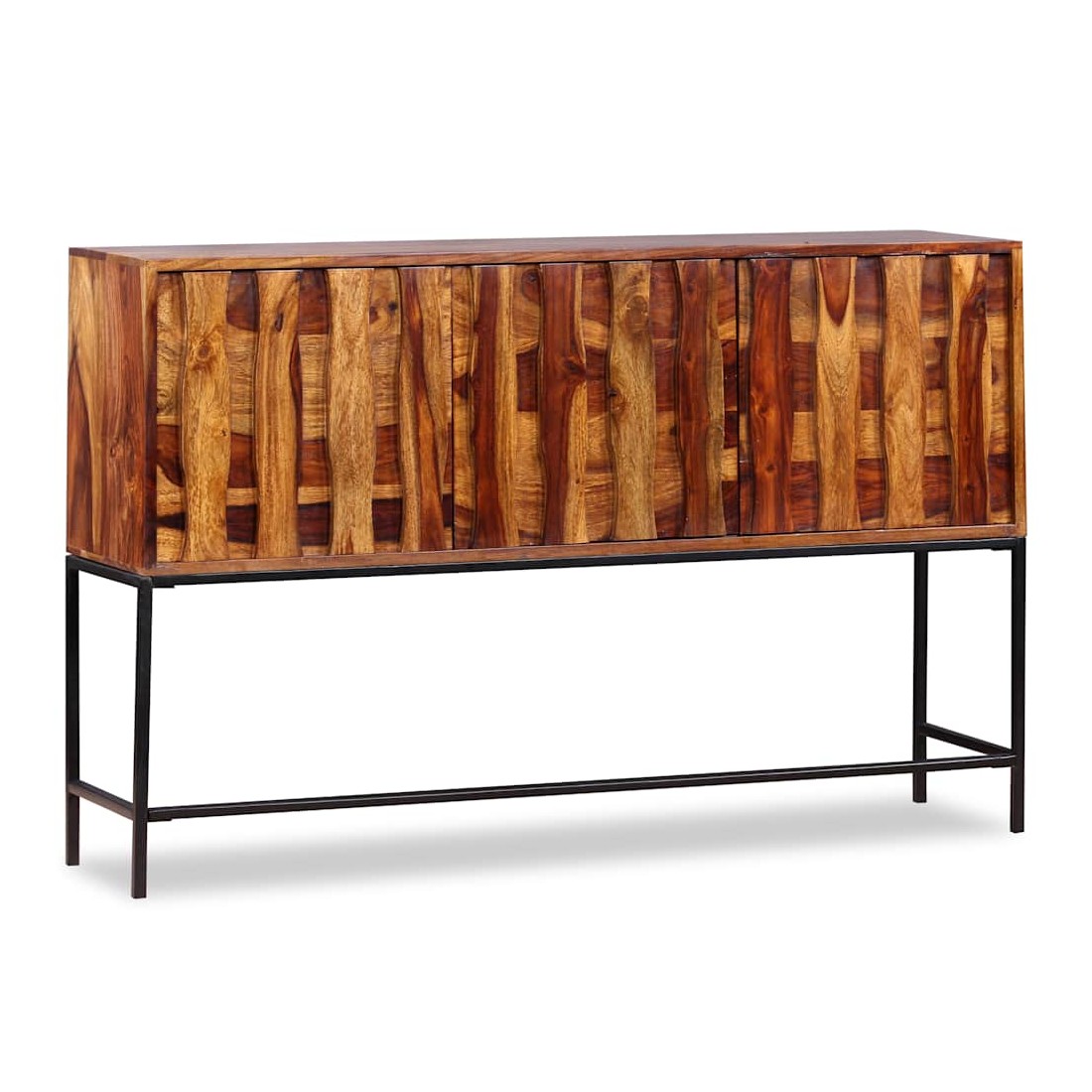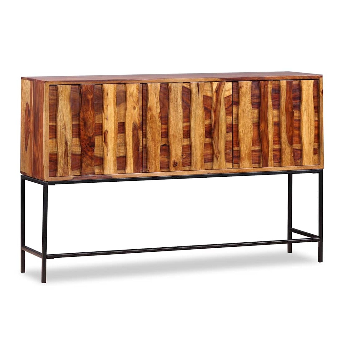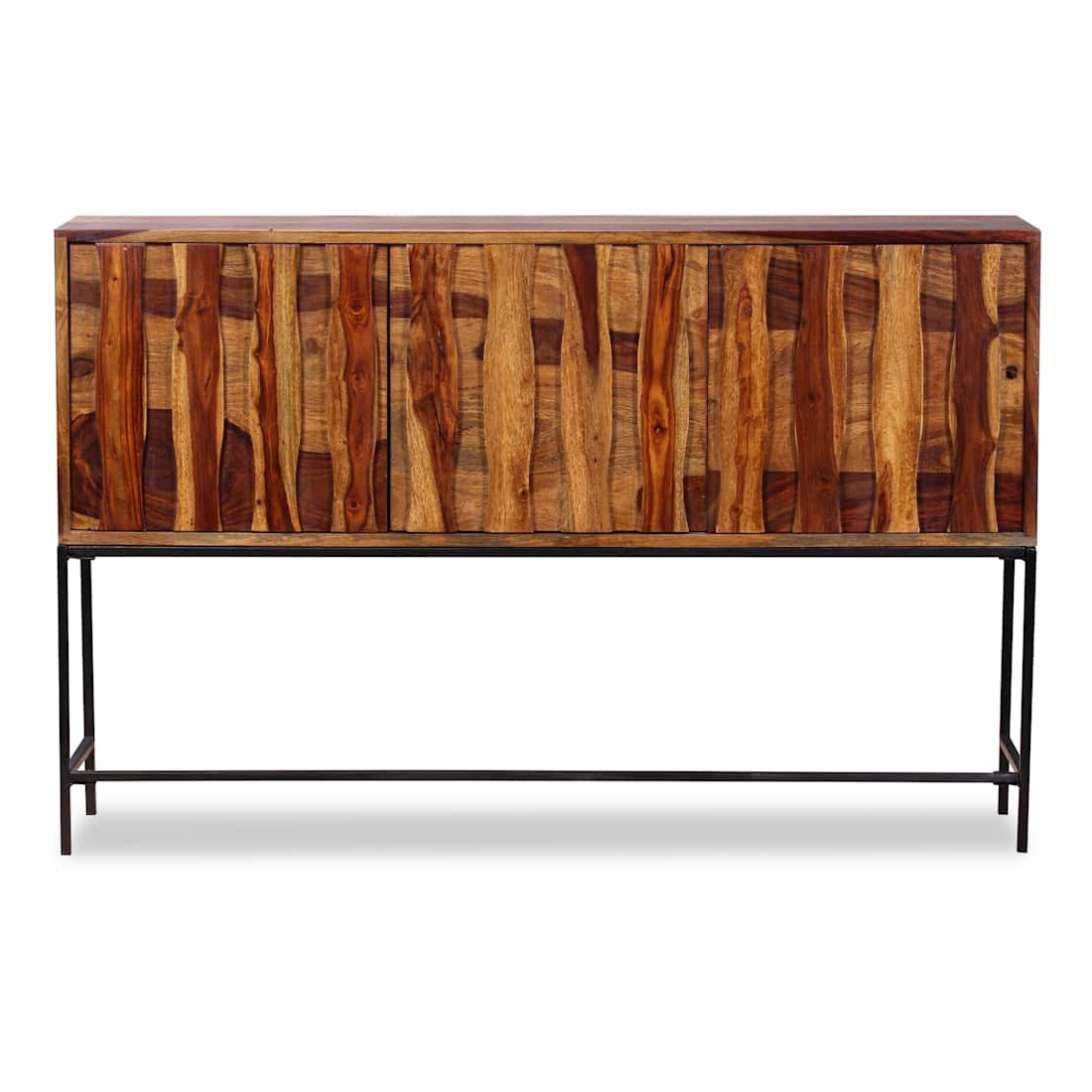 Ce buffet élégant et pratique sera un ajout intemporel au décor de votre maison. Il peut également être utilisé comme console ou table d'appoint. Ce buffet est fait de bois massif. Le bois, également connu sous le nom de palissandre ou bois de rose, est un bois dur tropical connu pour son grain riche. Ce buffet a un dessus robuste, sur lequel vous pouvez placer des articles décoratifs comme des paniers de fruits ou des vases, pendant que ses jambes fortes en fer forgé contribuent à la construction vigoureuse. Ses armoires offrent amplement d'espace pour garder toutes sortes de petits objets organisés et à portée de main. Il est entièrement fait à la main et les beaux grains de bois rendent chaque meuble unique et légèrement différent l'un de l'autre. Remarque importante : les couleurs varient d'une pièce à l'autre, rendant chaque pièce unique. La livraison est aléatoire, garantissant l'exclusivité et l'individualité de votre produit.