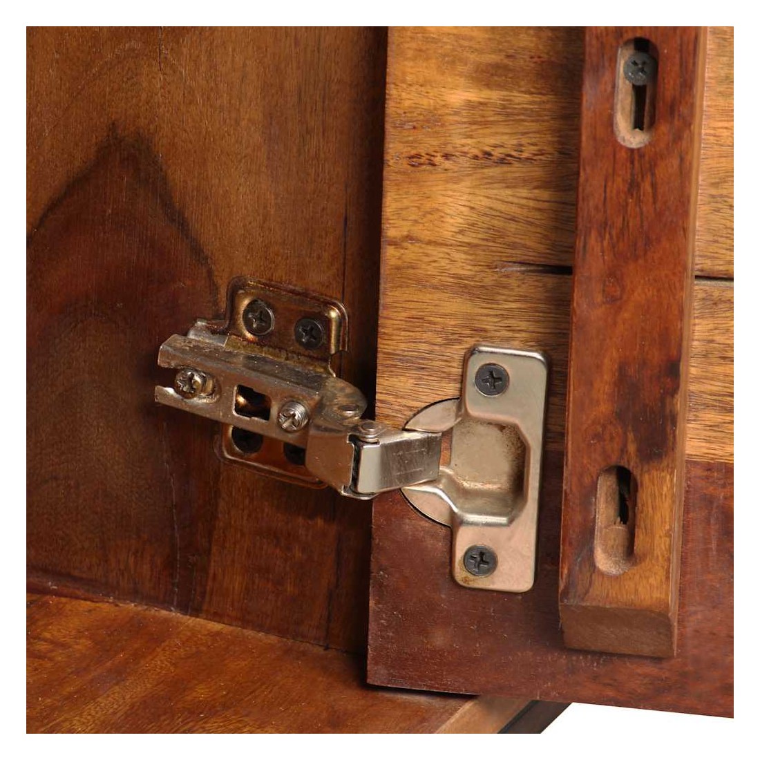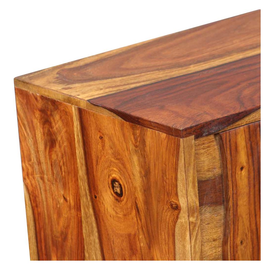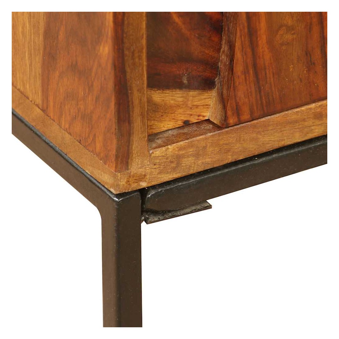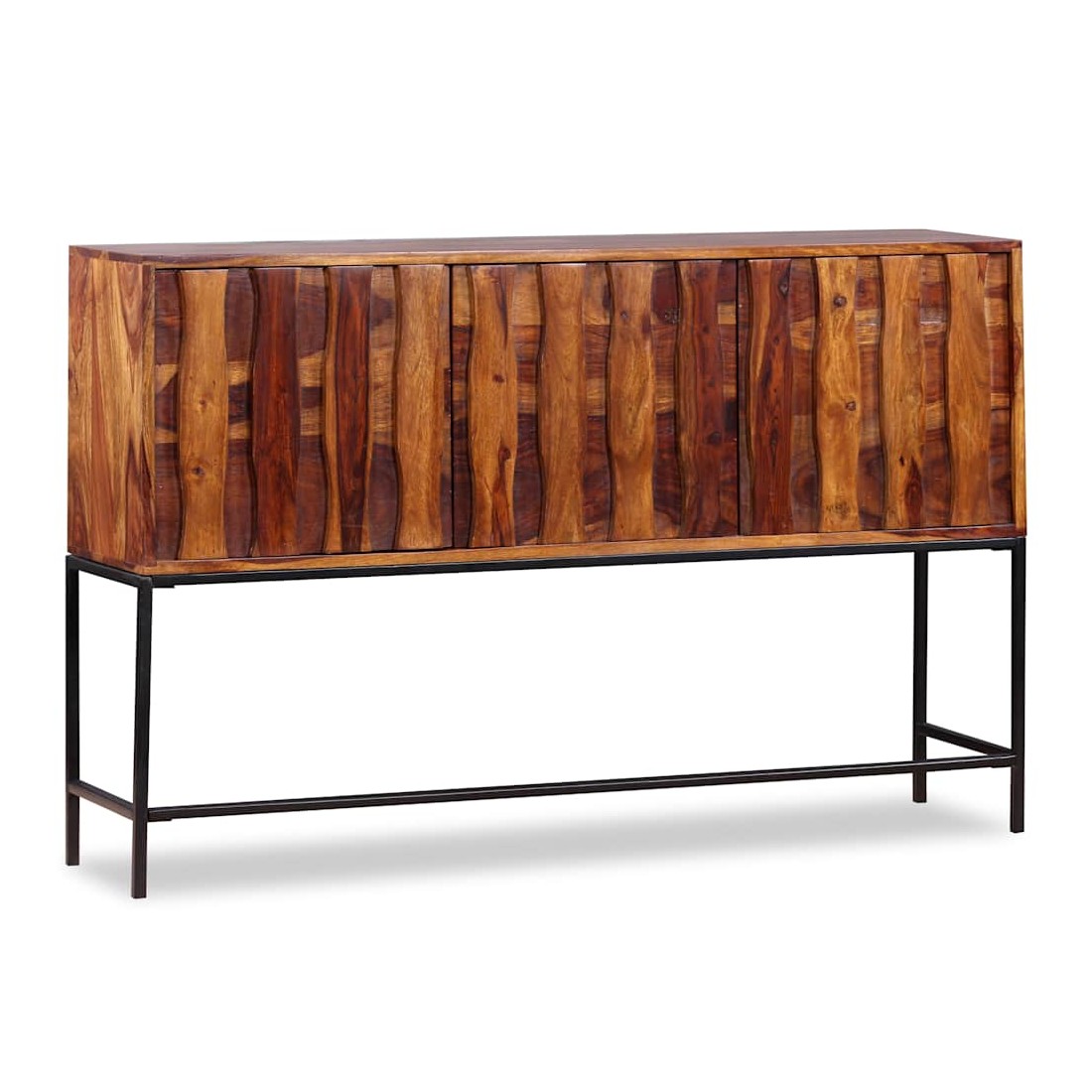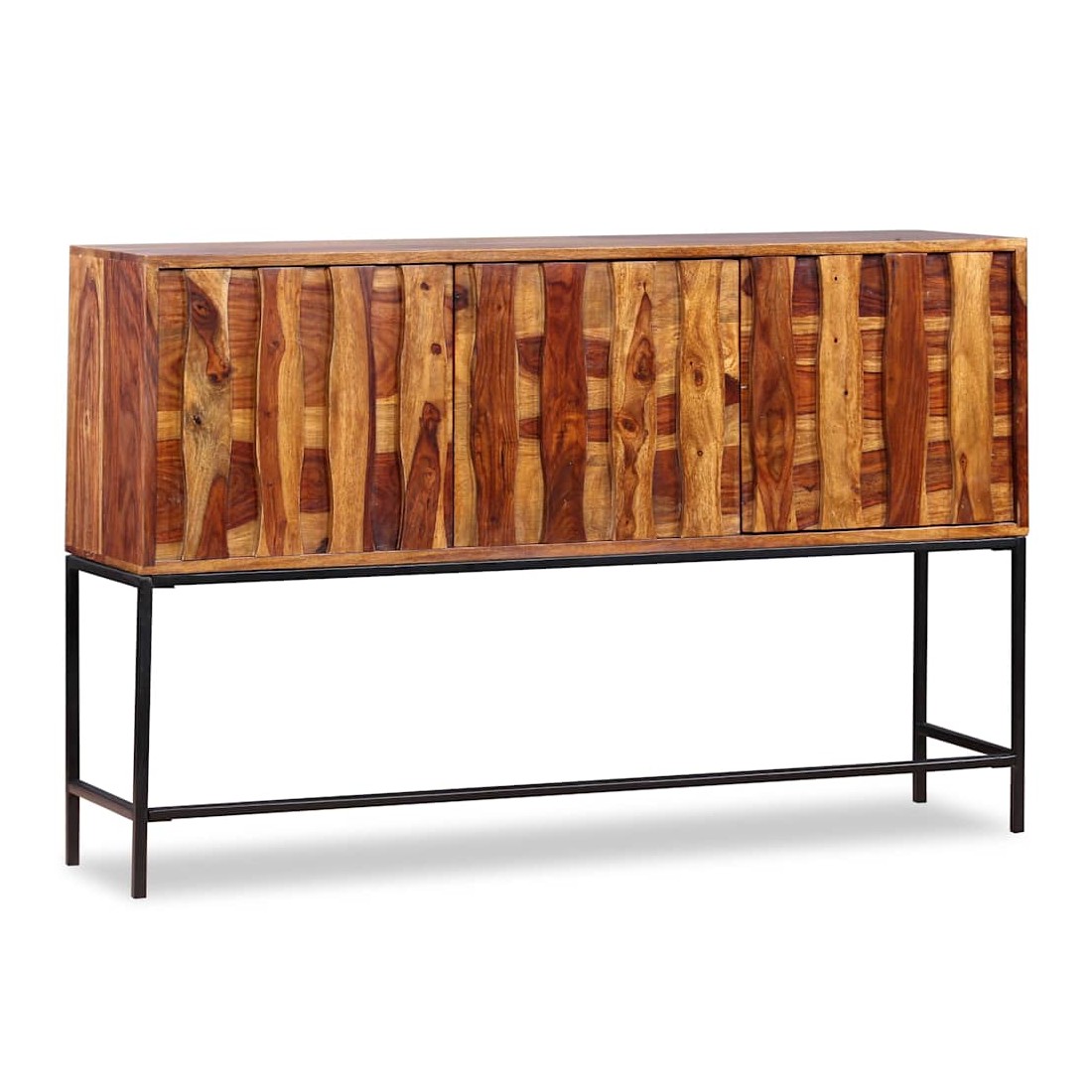 Ce buffet élégant et pratique sera un ajout intemporel au décor de votre maison. Il peut également être utilisé comme console ou table d'appoint. Ce buffet est fait de bois massif. Le bois, également connu sous le nom de palissandre ou bois de rose, est un bois dur tropical connu pour son grain riche. Ce buffet a un dessus robuste, sur lequel vous pouvez placer des articles décoratifs comme des paniers de fruits ou des vases, pendant que ses jambes fortes en fer forgé contribuent à la construction vigoureuse. Ses armoires offrent amplement d'espace pour garder toutes sortes de petits objets organisés et à portée de main. Il est entièrement fait à la main et les beaux grains de bois rendent chaque meuble unique et légèrement différent l'un de l'autre. Remarque importante : les couleurs varient d'une pièce à l'autre, rendant chaque pièce unique. La livraison est aléatoire, garantissant l'exclusivité et l'individualité de votre produit.