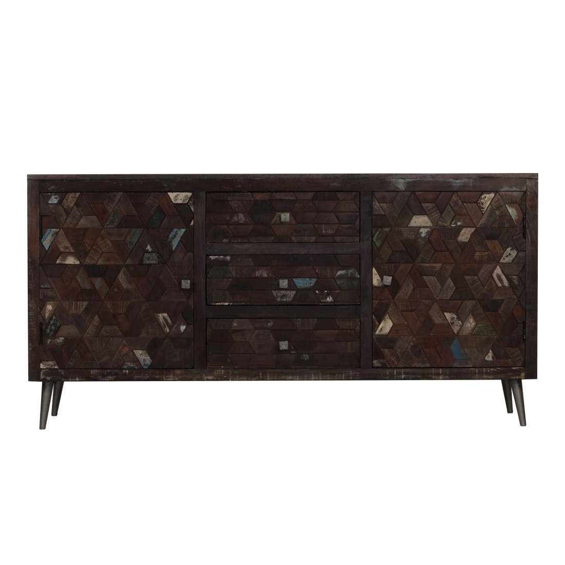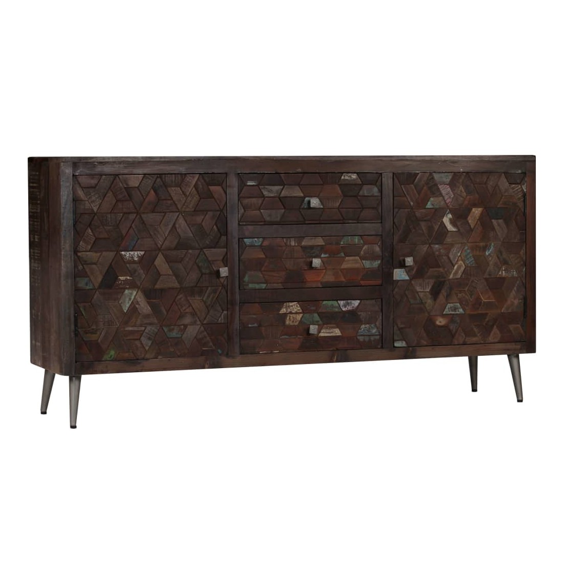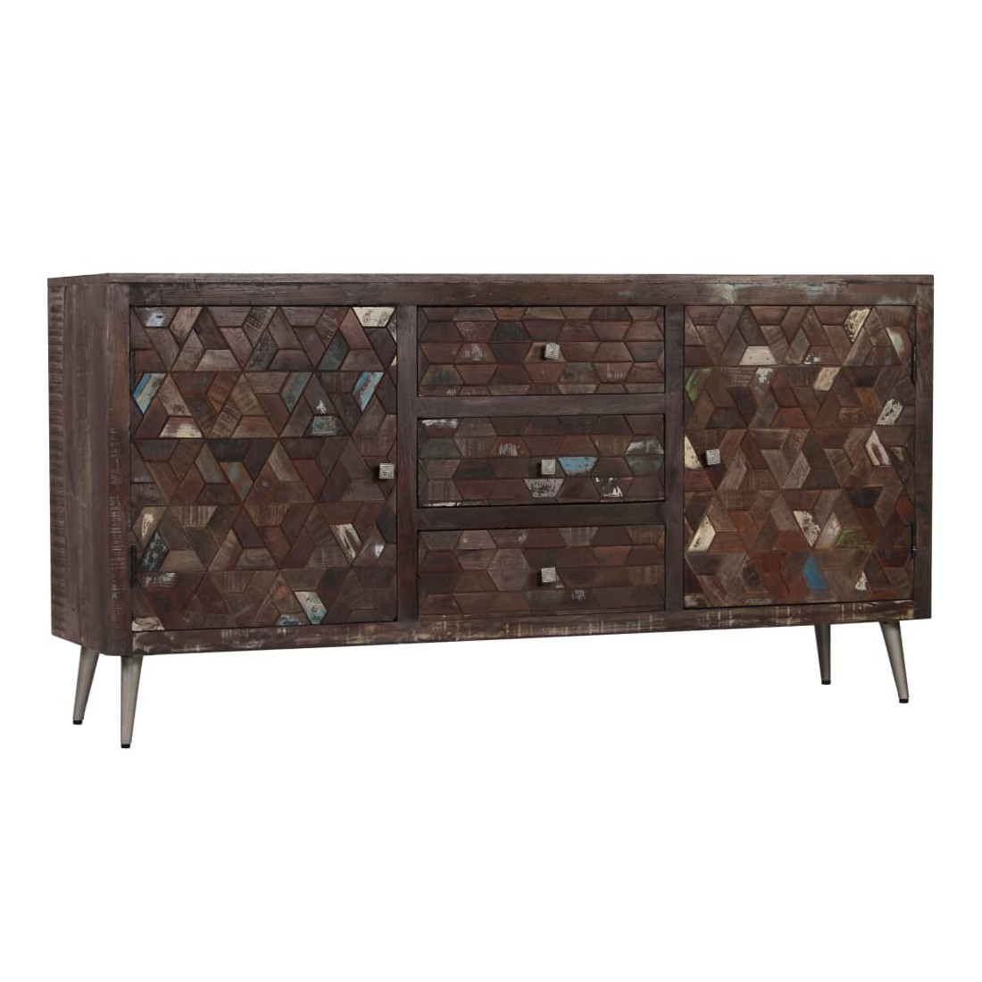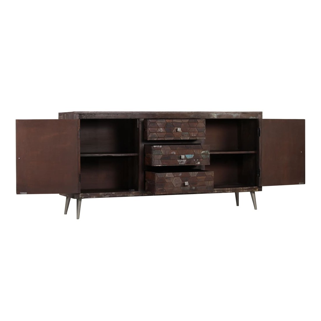Ce buffet en bois massif sera un supplément décoratif ainsi que pratique à votre décoration. L'armoire est faite de bois de récupération massif provenant de solives, de planchers et de poutres de soutien de vieux bâtiments démolis et peut être composée de différents types de bois comme pin, teck, hêtre, chêne, cèdre, bois de manguier, acacia, etc. Cela signifie que le bois de récupération conserve les caractéristiques de ces différents types de bois. Le bois de récupération est déjà vieilli, patiné et séché, donc il ne rétrécit pas et ne se plie pas. Les belles veines de bois rendent chaque meuble unique et légèrement différent l'un de l'autre. Les signes d'usure et la structure du grain visible témoignent de la riche histoire du bois et donnent au meuble un aspect chaleureux et authentique. Chaque étape du processus est réalisée avec le plus grand soin, que ce soit le polissage, la peinture ou le laquage. Conçu avec un grand espace de rangement, le buffet garde vos magazines, livres, DVD et appareils multimédias bien organisés et à portée de main. Ses pieds en acier ajoutent également à sa robustesse et à son style industriel époustouflant. L'assemblage est facile. Note importante : les couleurs et les grains peuvent varier d'une pièce à l'autre, ce qui rend chacun de nos buffets unique. La livraison est aléatoire, ce qui garantit l'exclusivité et l'individualité de votre produit.