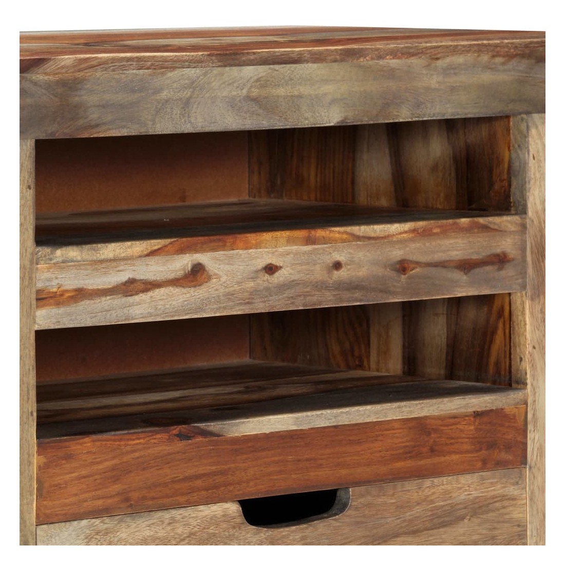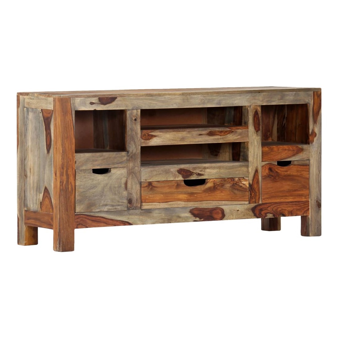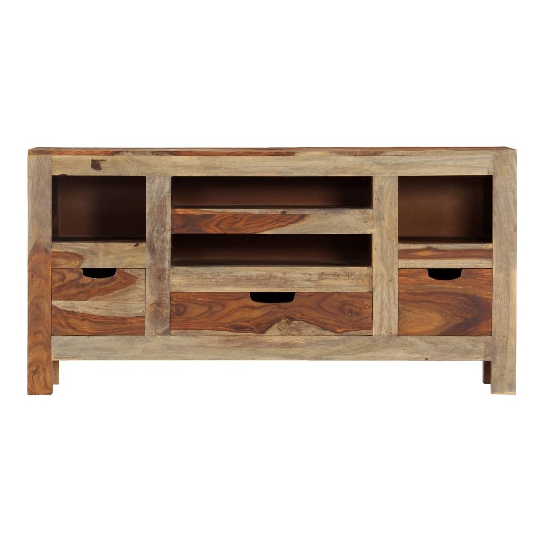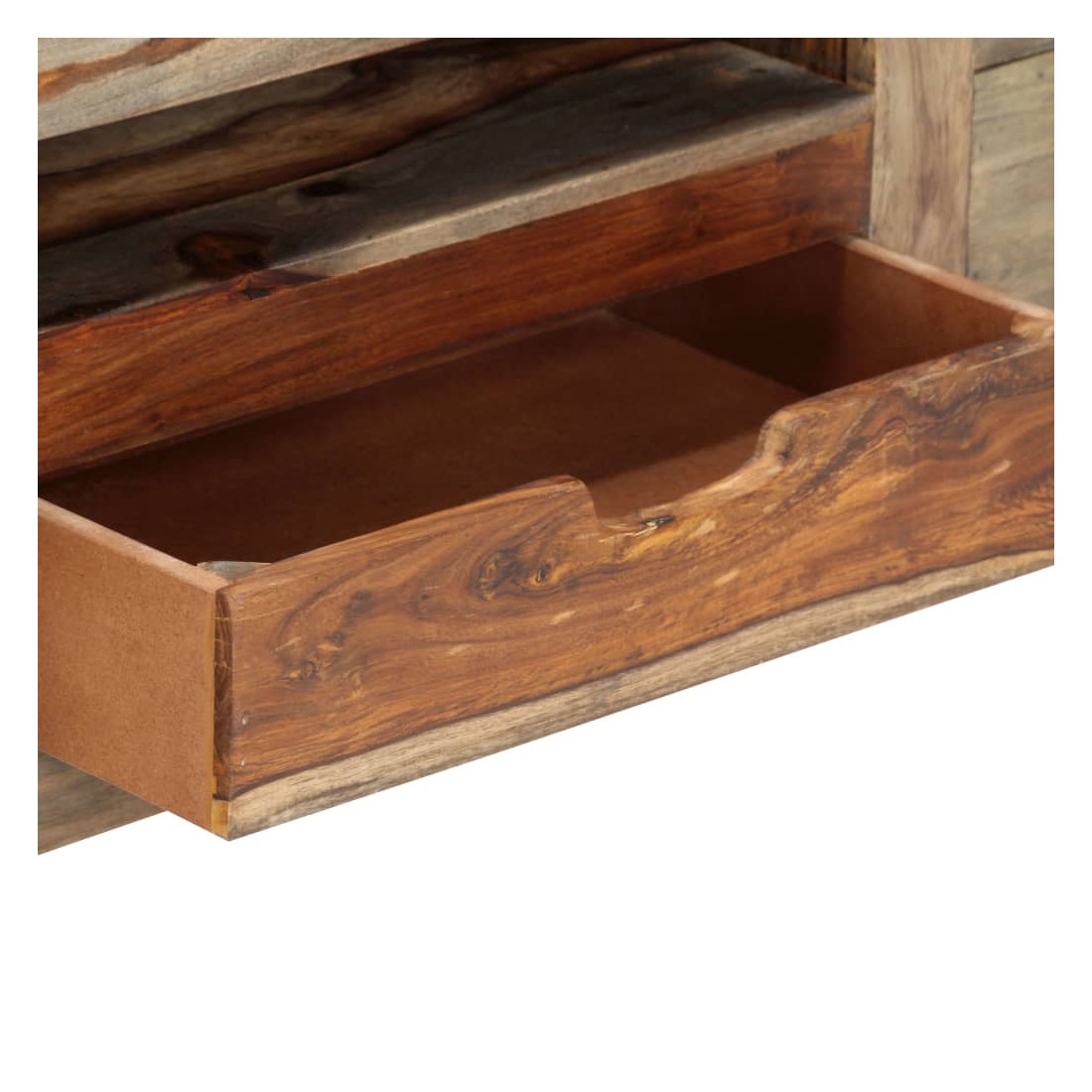 Introduisez une touche de charme rustique dans votre décoration intérieure avec notre élégant buffet en bois massif ! Le meuble est fait de bois massif , un bois dur tropical qui est célèbre pour ses grains naturels et sa texture lisse, également connu sous le nom de bois de rose ou palissandre. De plus, il ne se déforme pas, ne se fend pas et résiste à la pourriture naturelle. En conséquence, ce superbe meuble TV est extrêmement stable, durable et accrocheur. La fabrication exquise garantit que chaque étape du processus est réalisée avec le plus grand soin, que ce soit le polissage ou le laquage. Notre armoire en bois est entièrement fabriquée à la main et les grains de bois esthétiques rendent chaque pièce unique et légèrement différente l'une de l'autre. De plus, ce buffet dispose de 3 tiroirs et de 4 compartiments ouverts, offrant suffisamment d'espace pour ranger votre appareil multimédia, livres et autres articles divers. Remarque importante : les grains de bois varient d'une pièce à l'autre, rendant chaque pièce unique. La livraison est aléatoire, ce qui garantit l'exclusivité et l'individualité de votre produit.