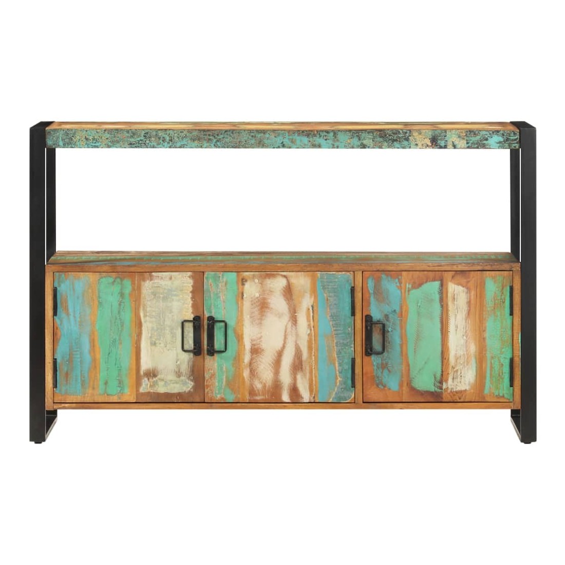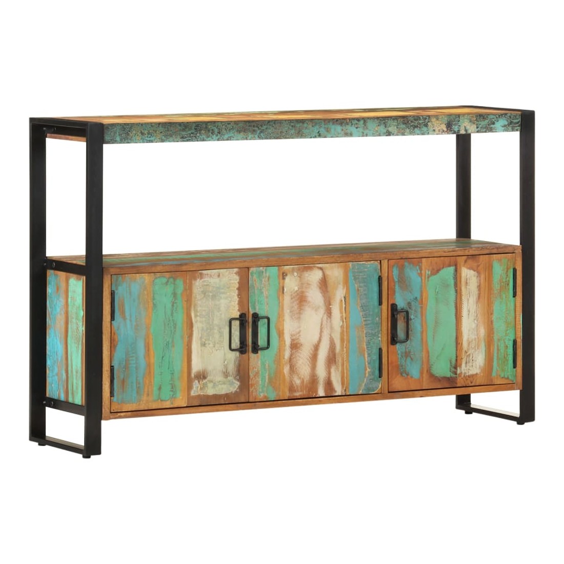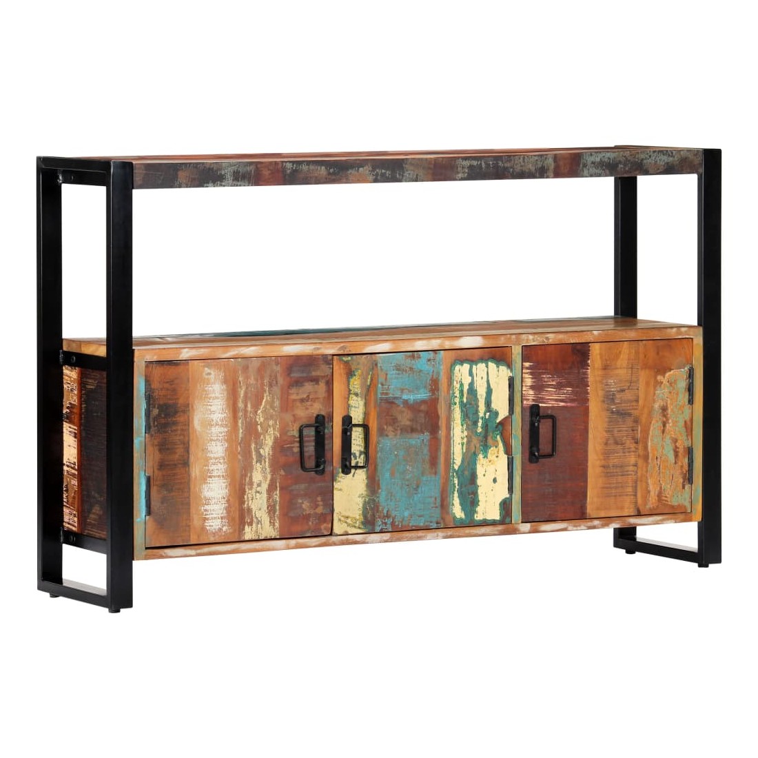 Sophistiqué et élégant, ce buffet en bois rappelle le charme vintage et le style industriel avec son cadre en acier enduit de poudre et son bois de récupération massif. Il sera certainement un supplément distinctif à votre maison. Cette table d'appoint est faite de bois de récupération solide provenant des solives, des planchers et des poutres de soutènement d'anciens bâtiments démolis et peut être composée de différents types de bois comme la pinède, le teck, le hêtre, le chêne, le cèdre, le bois de manguier, l'acacia, etc. Cela signifie que le bois de récupération conserve les caractéristiques de ces différents types de bois. Le bois de récupération est déjà vieilli, érodé et séché, donc il ne rétrécit ni se plie. Le savoir-faire exquis et les grains de bois esthétiquement attrayants