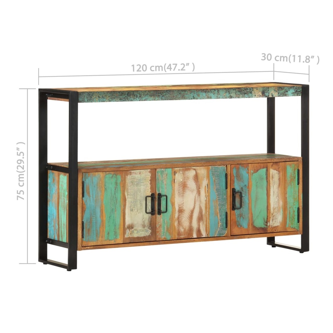 Sophistiqué et élégant, ce buffet en bois rappelle le charme vintage et le style industriel avec son cadre en acier enduit de poudre et son bois de récupération massif. Il sera certainement un supplément distinctif à votre maison. Cette table d'appoint est faite de bois de récupération solide provenant des solives, des planchers et des poutres de soutènement d'anciens bâtiments démolis et peut être composée de différents types de bois comme la pinède, le teck, le hêtre, le chêne, le cèdre, le bois de manguier, l'acacia, etc. Cela signifie que le bois de récupération conserve les caractéristiques de ces différents types de bois. Le bois de récupération est déjà vieilli, érodé et séché, donc il ne rétrécit ni se plie. Le savoir-faire exquis et les grains de bois esthétiquement attrayants rendent chaque pièce de meuble unique et légèrement différente l'une de l'autre. Chaque étape du processus est réalisée avec le plus grand soin, que ce soit le polissage, la peinture ou le laquage. Le dessus de table offre une surface stable et sécurisée sur laquelle vous pouvez placer vos boissons, un panier de fruits ou un vase, ainsi que d’autres objets décoratifs. En outre, elle est équipée de 3 portes et d'1 étagère, offrant un espace suffisant pour stocker des petits objets tels que des clés, des bloc-notes et d'autres bibelots. Cet article est facile à assembler. Remarque importante : les couleurs varient d'un meuble à l'autre, rendant chacun de nos buffets unique. La livraison est aléatoire, ce qui garantit l'exclusivité et l'individualité de votre produit.