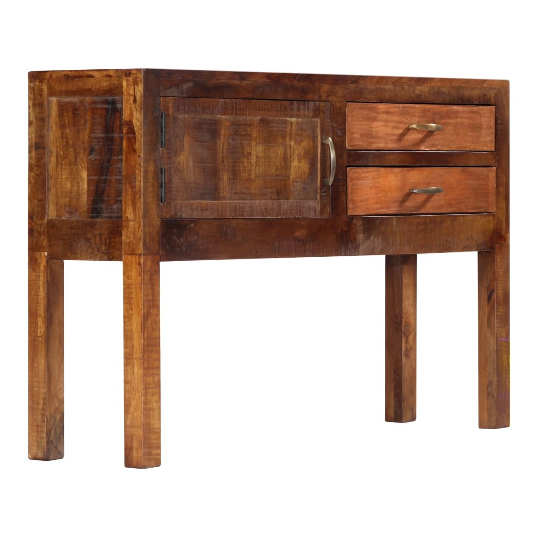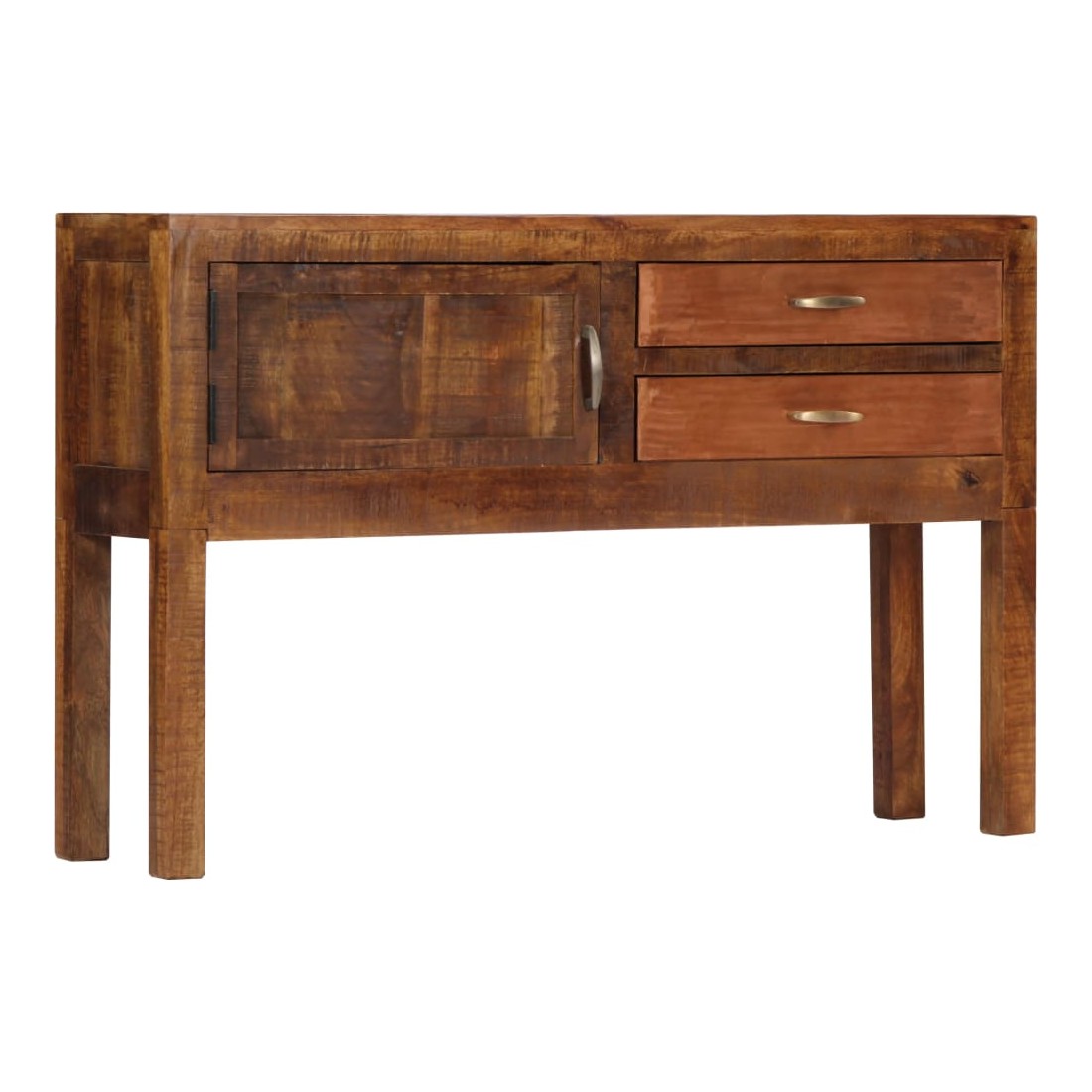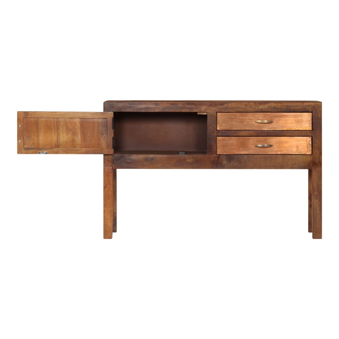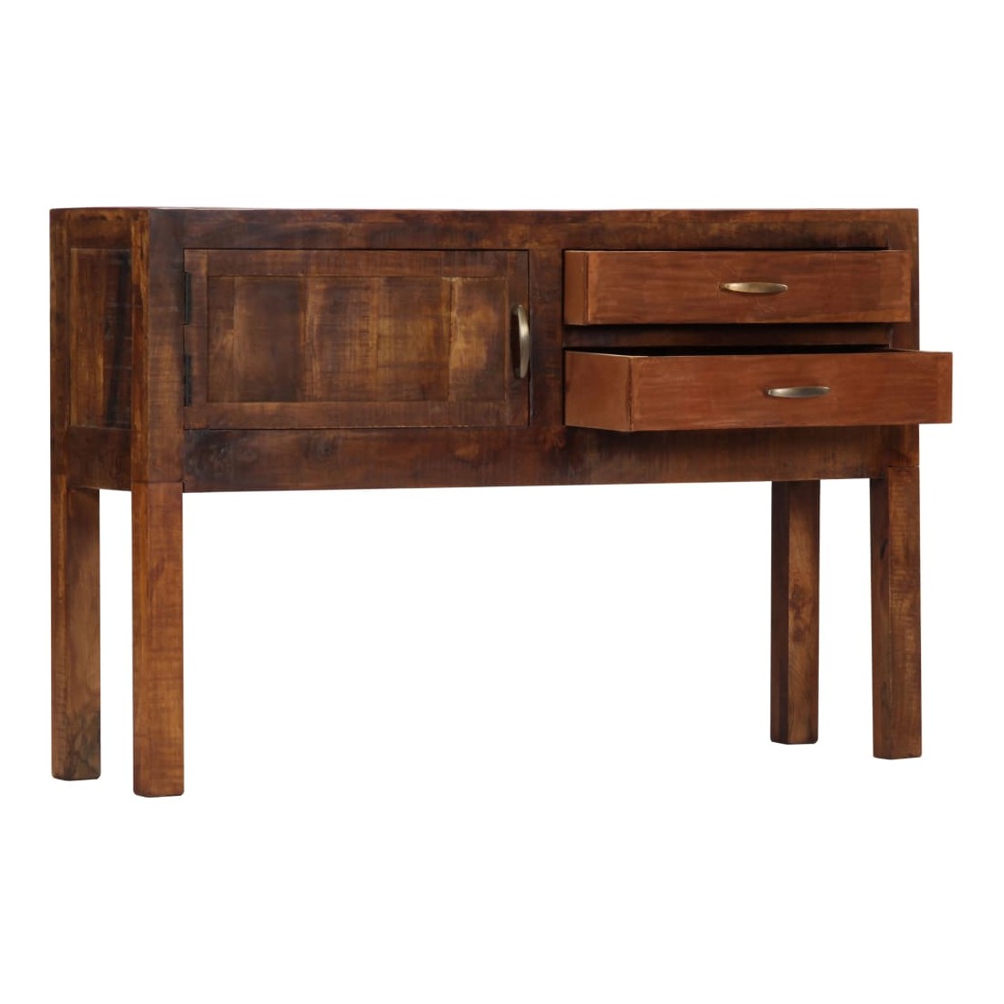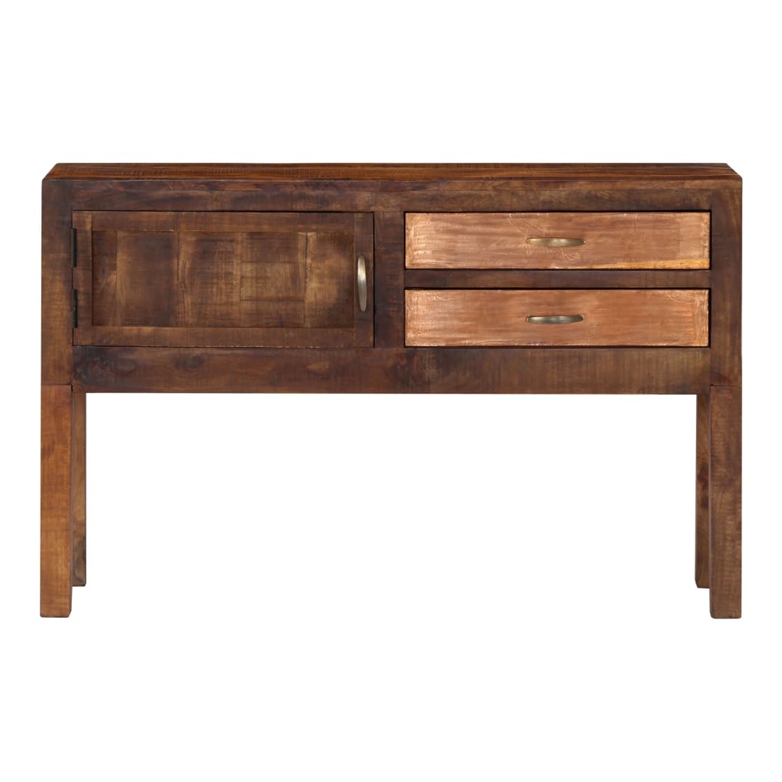Ce buffet dégage un charme intemporel qui sera un supplément accrocheur à votre décoration intérieure. Cette armoire vintage est fabriquée en bois de manguier solide, un bois dur à grains denses. Le bois brut de manguier a non seulement la force de supporter le poids, mais résiste également à l'usure du temps. En conséquence, cette table d'appoint est extrêmement stable, durable et accrocheuse. Le savoir-faire exquis et les grains de bois élégants rendent chaque meuble distinctif et légèrement différent l'un de l'autre. De plus, cette armoire en bois solide dispose de 2 tiroirs et d'1 armoire avec porte, offrant un espace de stockage pour vos vêtements, livres, ainsi que divers autres articles. Remarque importante : Les couleurs et le grain du bois peuvent varier d'une pièce à l'autre, ce qui rend chaque table d'entrée unique. La livraison est aléatoire, ce qui garantit l'exclusivité et l'individualité de votre produit.