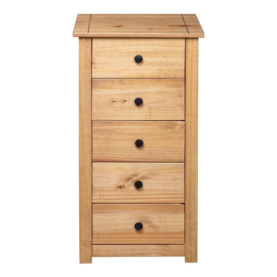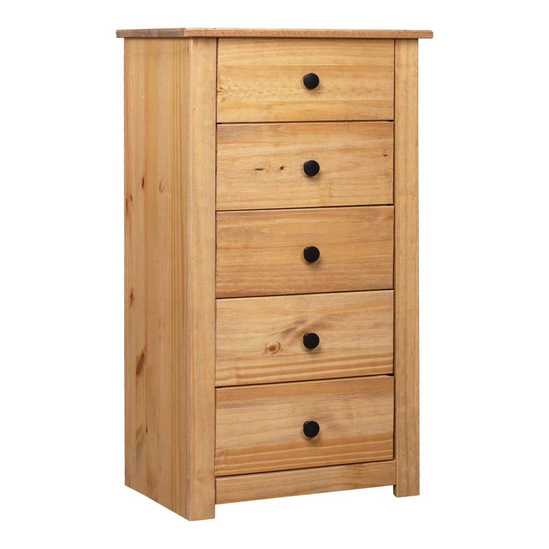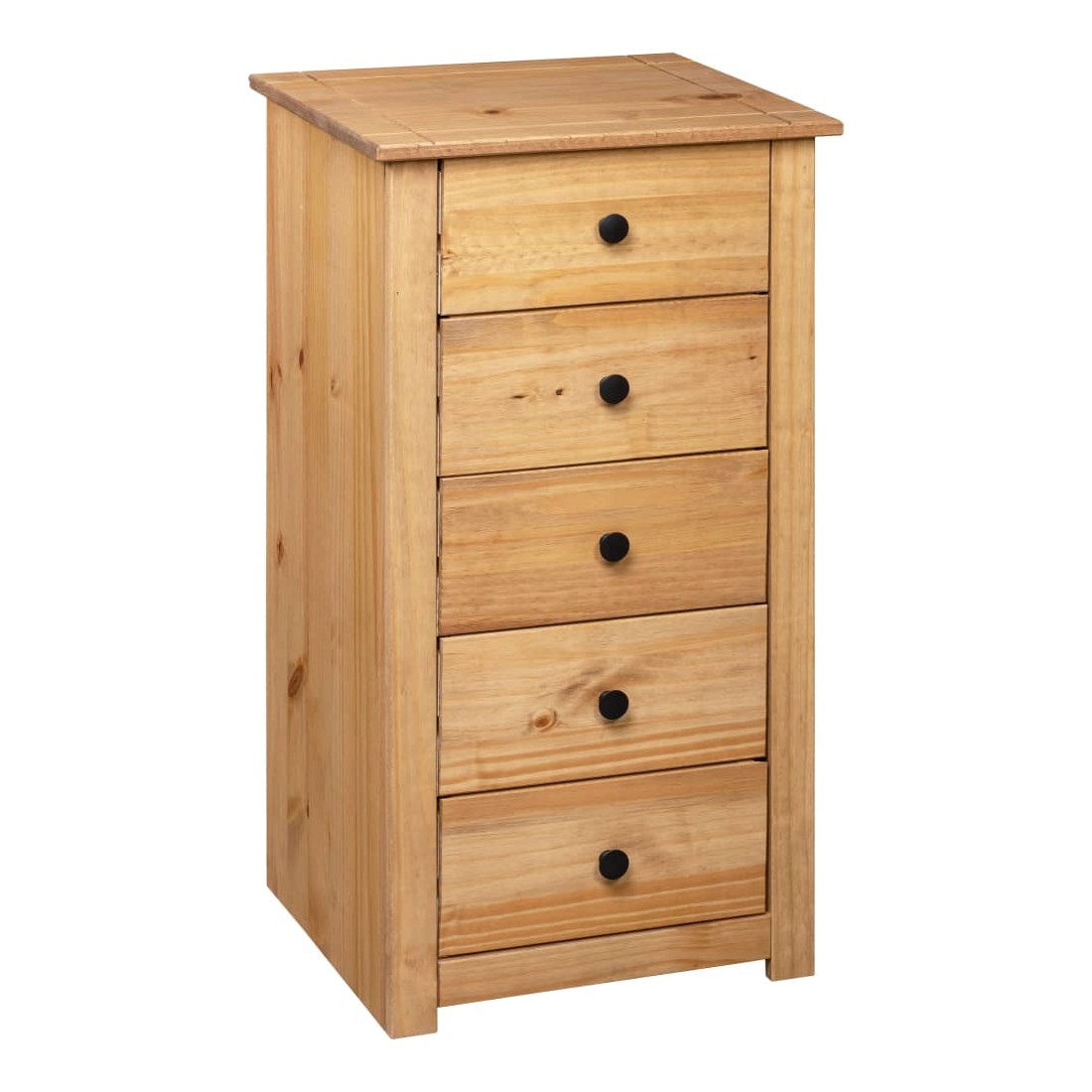 Faites un excellent supplément à votre chambre à coucher, salon ou bureau avec notre buffet en pin massif ! Il peut également être utilisé comme support de téléphone à côté de votre canapé ! Fabriquée en bois de pin massif, cette armoire à tiroirs Panama est extrêmement durable et robuste. Le buffet offre un grand espace de rangement avec 5 tiroirs. De plus, le dessus robuste est parfait pour exposer des objets décoratifs, des cadres photo et des plantes en pot. Il est facile à essuyer avec un chiffon sec. Le support de téléphone est facile à assembler.