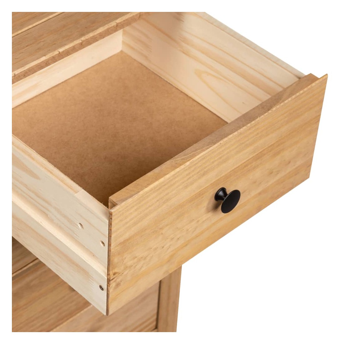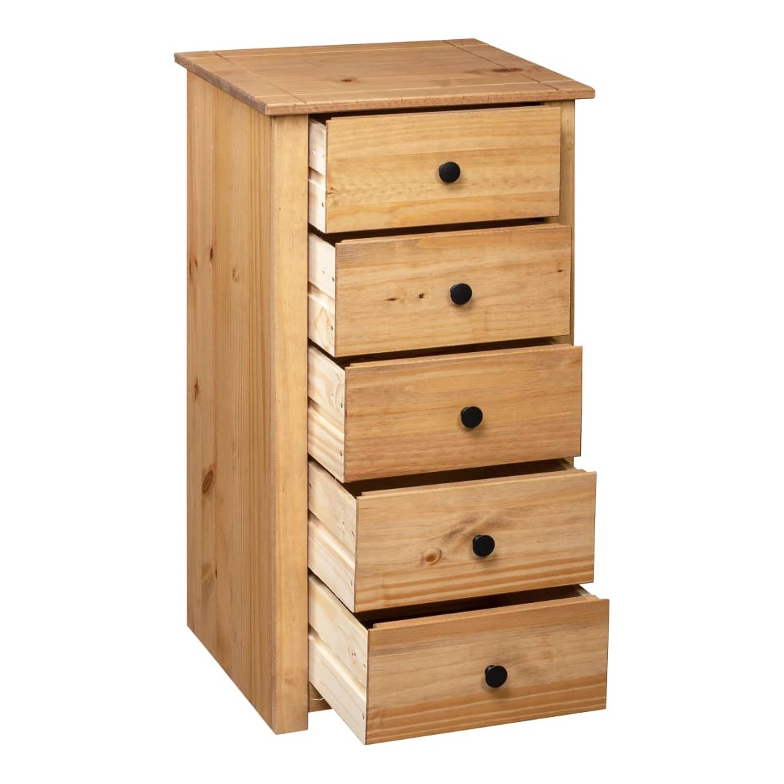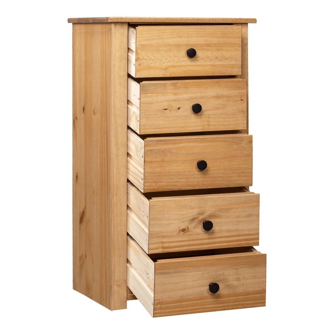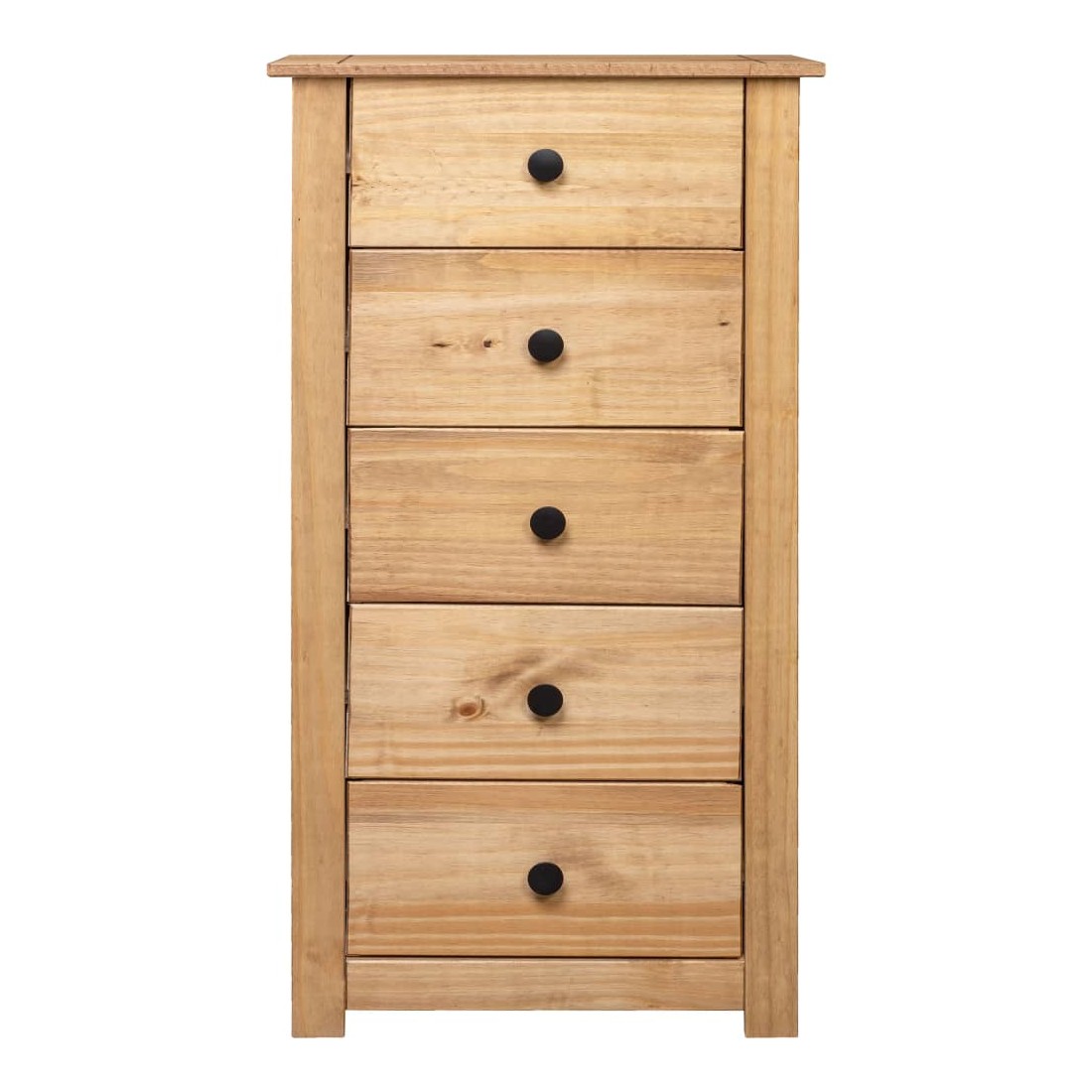 Faites un excellent supplément à votre chambre à coucher, salon ou bureau avec notre buffet en pin massif ! Il peut également être utilisé comme support de téléphone à côté de votre canapé ! Fabriquée en bois de pin massif, cette armoire à tiroirs Panama est extrêmement durable et robuste. Le buffet offre un grand espace de rangement avec 5 tiroirs. De plus, le dessus robuste est parfait pour exposer des objets décoratifs, des cadres photo et des plantes en pot. Il est facile à essuyer avec un chiffon sec. Le support de téléphone est facile à assembler.