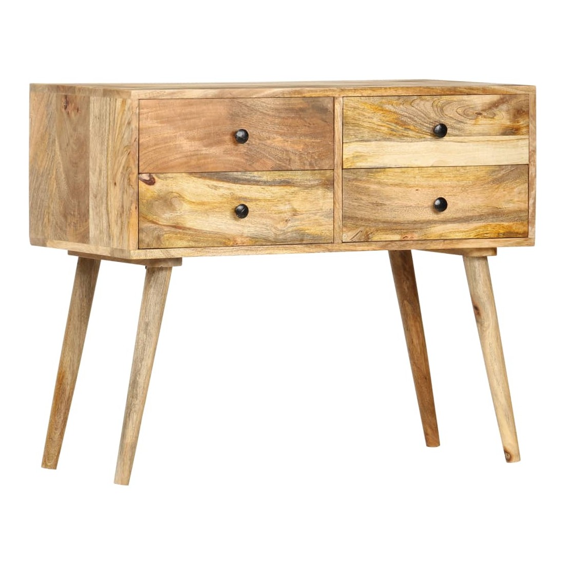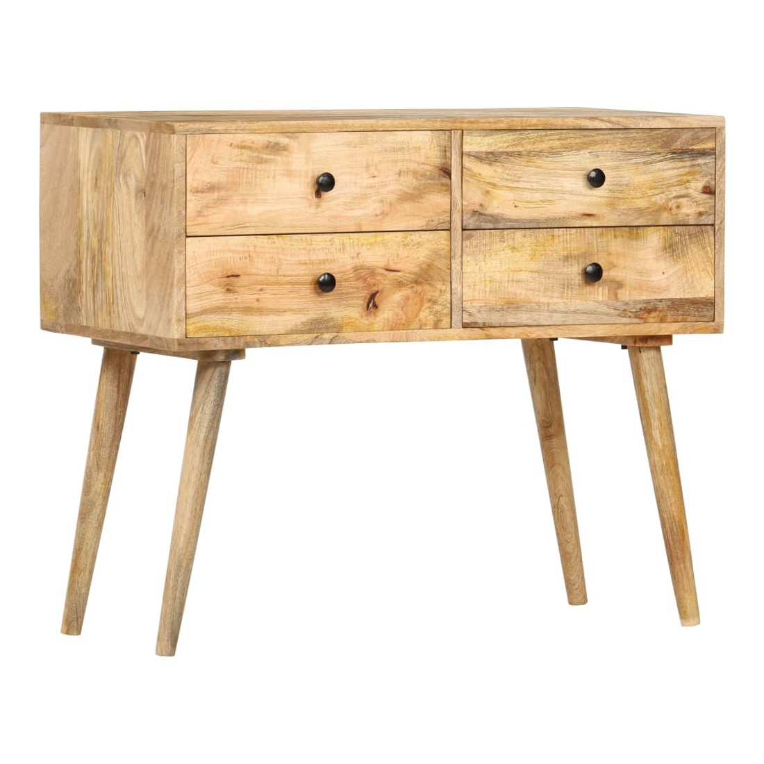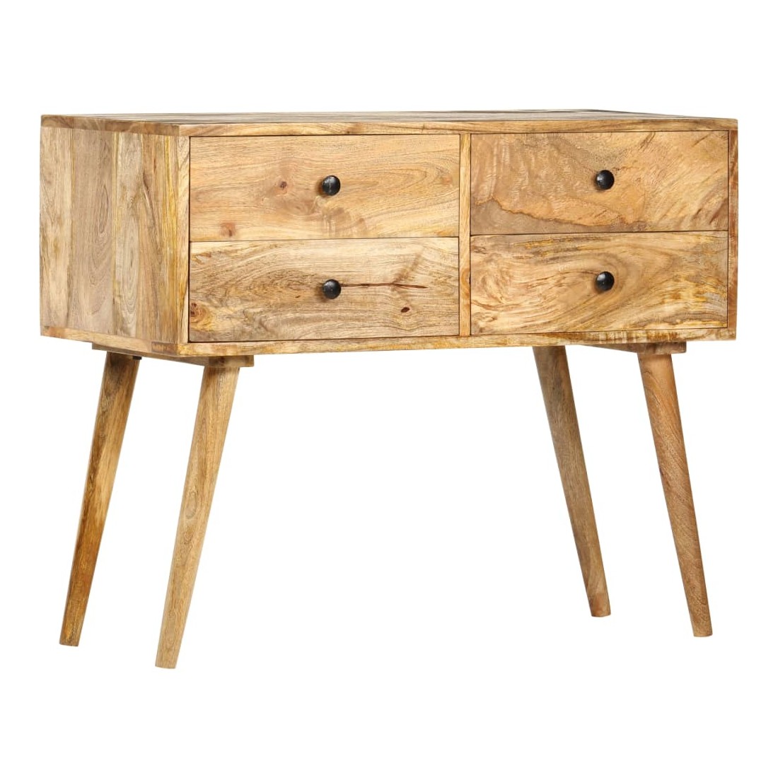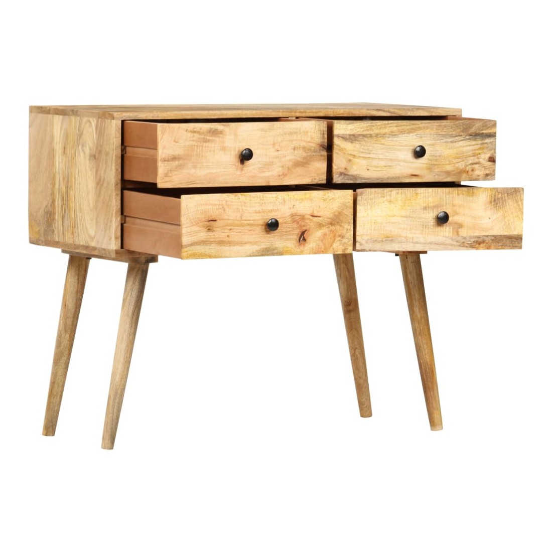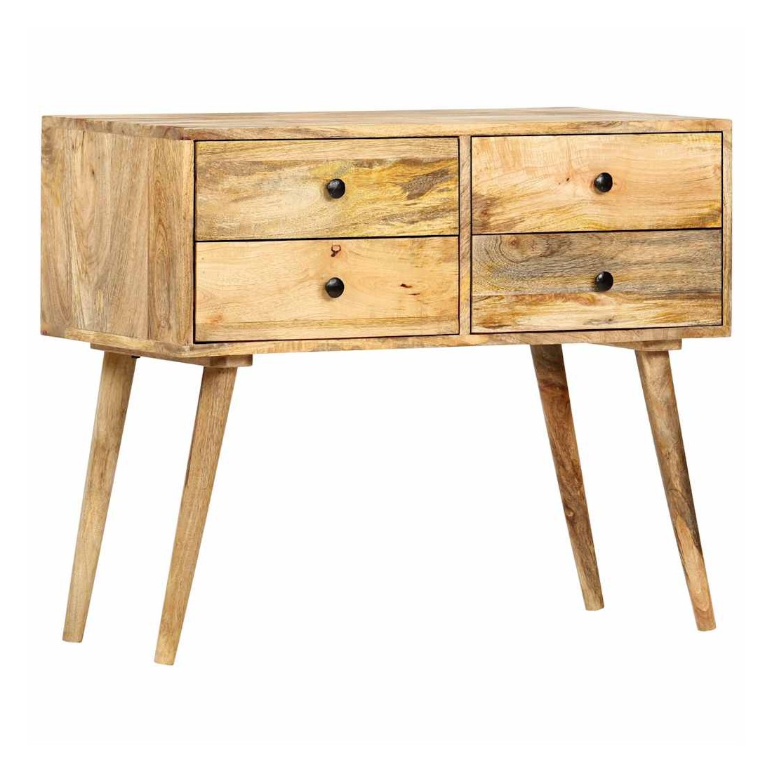 Ce buffet dégage un charme intemporel qui sera un supplément accrocheur à votre décoration intérieure. Cette armoire vintage est fabriquée en bois de manguier solide, un bois dur à grains denses. Le bois brut de manguier a non seulement la force de supporter le poids, mais résiste également à l'usure du temps. En conséquence, cette table d'appoint est extrêmement stable, durable et accrocheuse. Le savoir-faire exquis et les grains de bois élégants rendent chaque meuble distinctif et légèrement différent l'un de l'autre. De plus, cette armoire en bois solide dispose de 4 tiroirs, offrant un espace de stockage pour vos revues, livres, ainsi que divers autres articles. Remarque importante : Les couleurs et le grain du bois peuvent varier d'une pièce à l'autre, ce qui rend chaque table d'e
