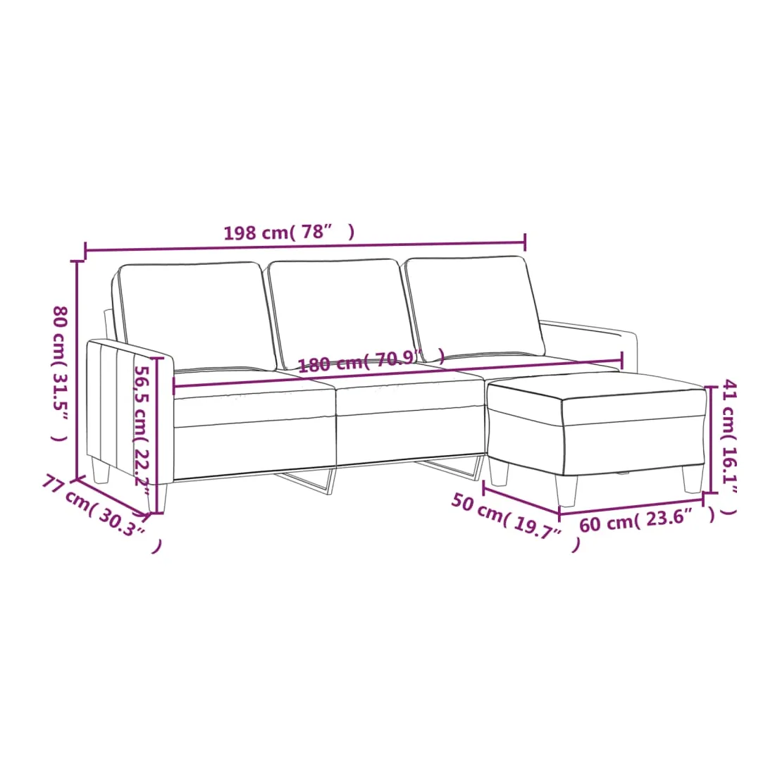 Ce canapé à 3 places avec repose-pieds est un excellent endroit pour discuter, lire, regarder la télévision ou simplement vous détendre. Il est destiné à être un point central dans votre maison. Tissu durable : le tissu présente un aspect simple et épuré tout en restant respirant et durable.Structure robuste et stable : la structure en contreplaqué et en métal du canapé avec repose-pieds assure robustesse et stabilité.Expérience d'assise confortable : le fauteuil est très confortable avec les sièges, les accoudoirs et les coussins de dossier bien rembourrés.Repose-pied polyvalent : ce repose-pied convient pour reposer vos pieds lorsque vous êtes allongé dans un canapé ou un fauteuil inclinable, ou pour vous offrir un siège supplémentaire dans votre pièce. De plus, le design simple et la taille compacte le rendent idéal pour presque tous vos espaces de vie.Design accrocheur : doté d'un design simple mais moderne, ce canapé avec repose-pied est destiné à attirer l'attention dans votre pièce.