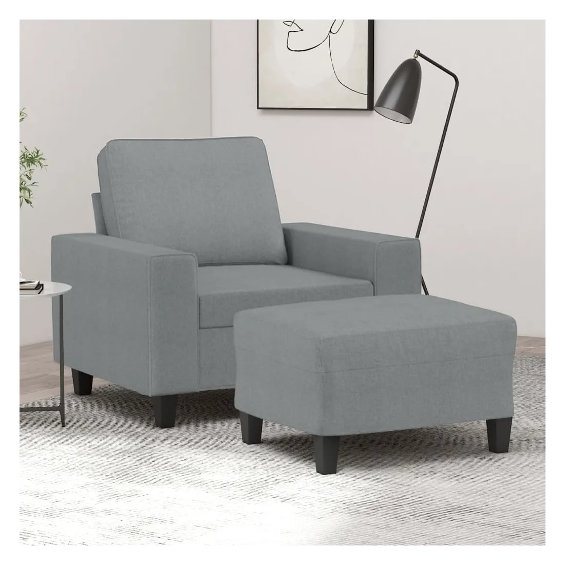 Ce fauteuil avec repose-pied est un excellent endroit pour discuter, lire, regarder la télévision ou simplement vous détendre. Il est destiné à être un point central de votre maison. Tissu durable : le tissu présente un aspect simple et épuré tout en restant respirant et durable.Structure robuste et stable : la structure en contreplaqué et en métal du canapé avec repose-pieds assure robustesse et stabilité.Expérience d'assise confortable : le fauteuil est très confortable avec le siège, les accoudoirs et le coussin de dossier bien rembourrés.Repose-pied polyvalent : ce repose-pied convient pour reposer vos pieds lorsque vous êtes allongé dans un canapé ou un fauteuil inclinable, ou pour vous offrir un siège supplémentaire dans votre pièce. De plus, le design simple et la taille compacte le rendent idéal pour presque tous vos espaces de vie.Design accrocheur : doté d'un design simple mais moderne, ce canapé avec repose-pied est destiné à attirer l'attention dans votre pièce.