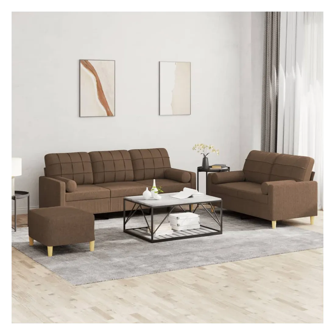 Cet ensemble de canapés est un excellent endroit pour discuter, lire, regarder la télévision ou simplement vous détendre. Il est destiné à être un point central de votre maison. Tissu durable : le tissu présente un aspect simple et épuré tout en restant respirant et durable.Structure robuste et stable : la structure en contreplaqué et en métal du canapé assure robustesse et stabilité.Expérience d'assise confortable : le canapé est très confortable avec le siège, les accoudoirs et les oreillers de dossier bien rembourrés.Oreillers cylindriques pratiques : ces oreillers cylindriques non seulement embellissent votre décor, mais ils peuvent également apporter un confort supplémentaire lorsque vous êtes assis ou allongé.Pouf polyvalent : ce repose-pied convient pour reposer vos pieds lorsque vous êtes allongé dans un canapé, ou pour vous offrir un siège supplémentaire dans votre pièce. De plus, le design simple et la taille compacte le rendent idéal pour presque tous vos espaces de vie.
