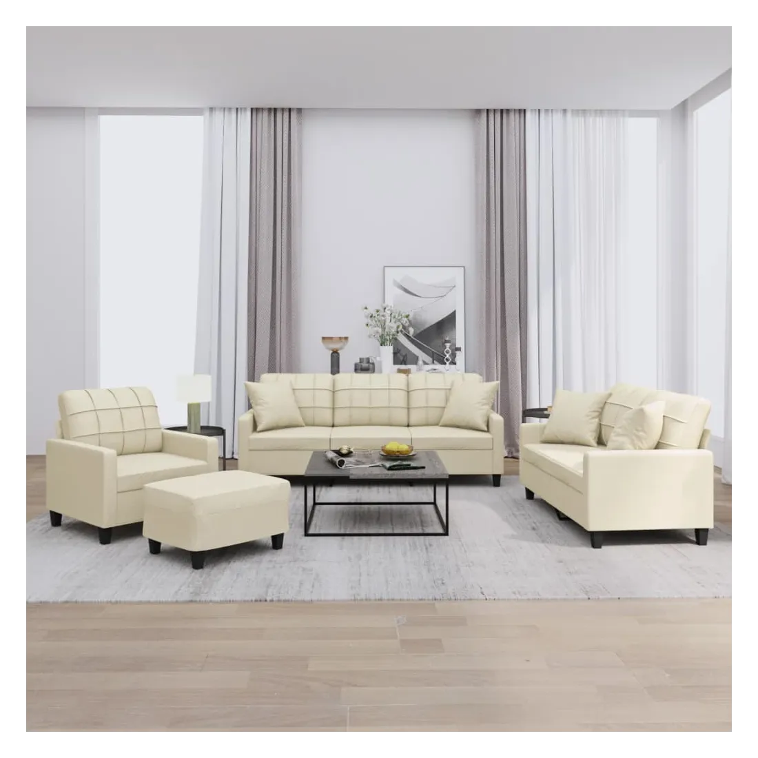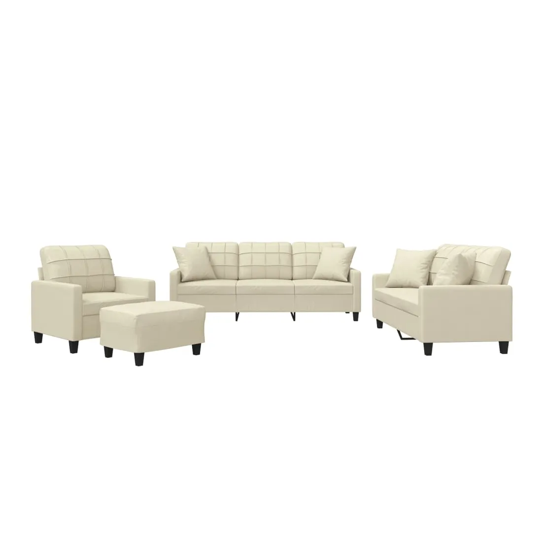 Cet ensemble de canapés est un excellent endroit pour discuter, lire, regarder la télévision ou simplement vous détendre. Il est destiné à être un point central de votre maison. Similicuir durable : le similicuir de qualité supérieure est un matériau très durable. Il est résistant aux taches, ce qui le rend facile à nettoyer avec un chiffon humide. La surface lisse donne également un aspect luxueux et la beauté du cuir véritable.Structure robuste et stable : la structure en contreplaqué et en métal du canapé assure robustesse et stabilité.Expérience d'assise confortable : le canapé est très confortable avec le siège, les accoudoirs et les oreillers de dossier bien rembourrés.Oreillers de canapé pratiques : ces oreillers décoratifs carrés non seulement embellissent votre décor, mais ils peuvent également apporter un confort supplémentaire lorsque vous êtes assis ou allongé.Pouf polyvalent : ce repose-pied convient pour reposer vos pieds lorsque vous êtes allongé dans un canapé, ou pour vous offrir un siège supplémentaire dans votre pièce. De plus, le design simple et la taille compacte le rendent idéal pour presque tous vos espaces de vie.