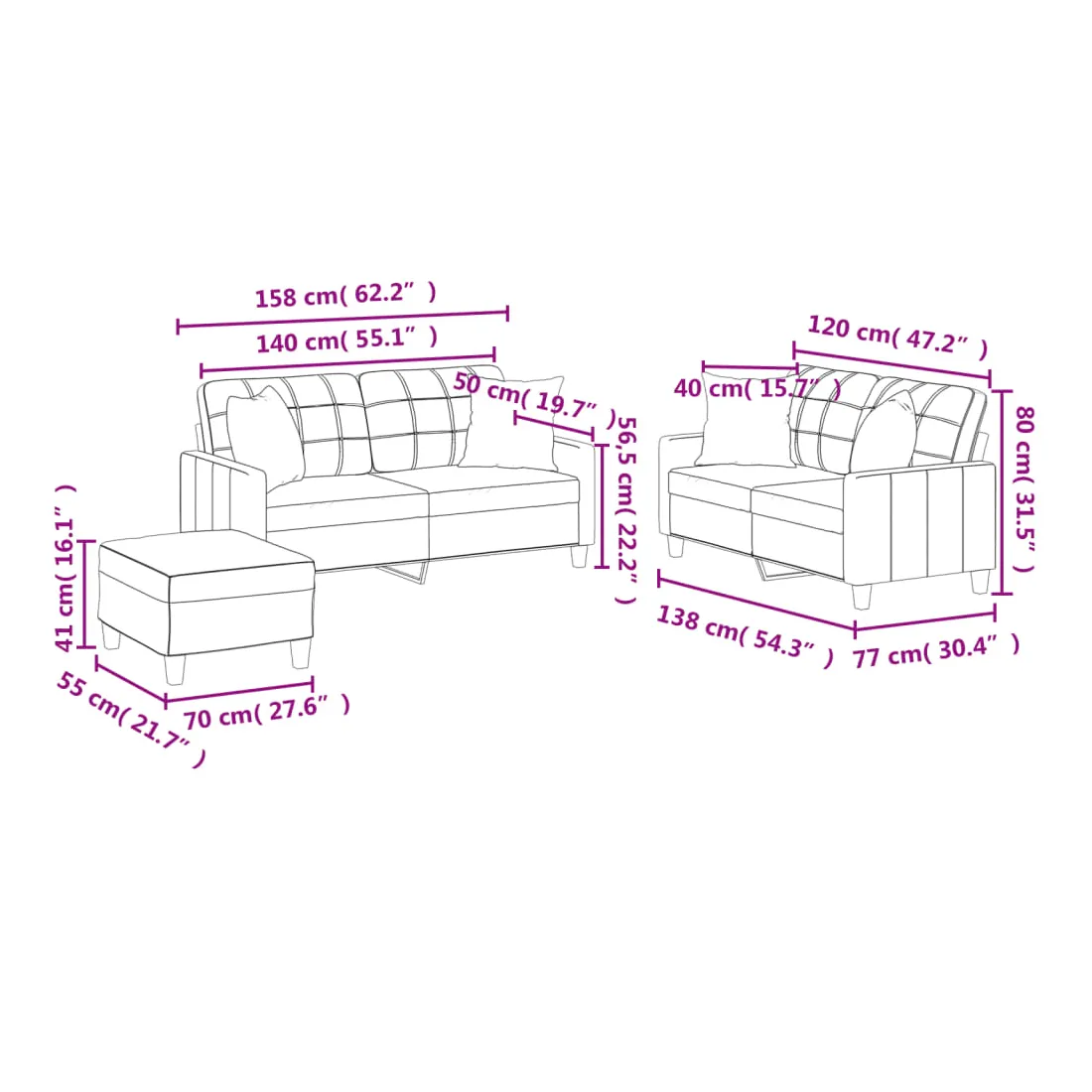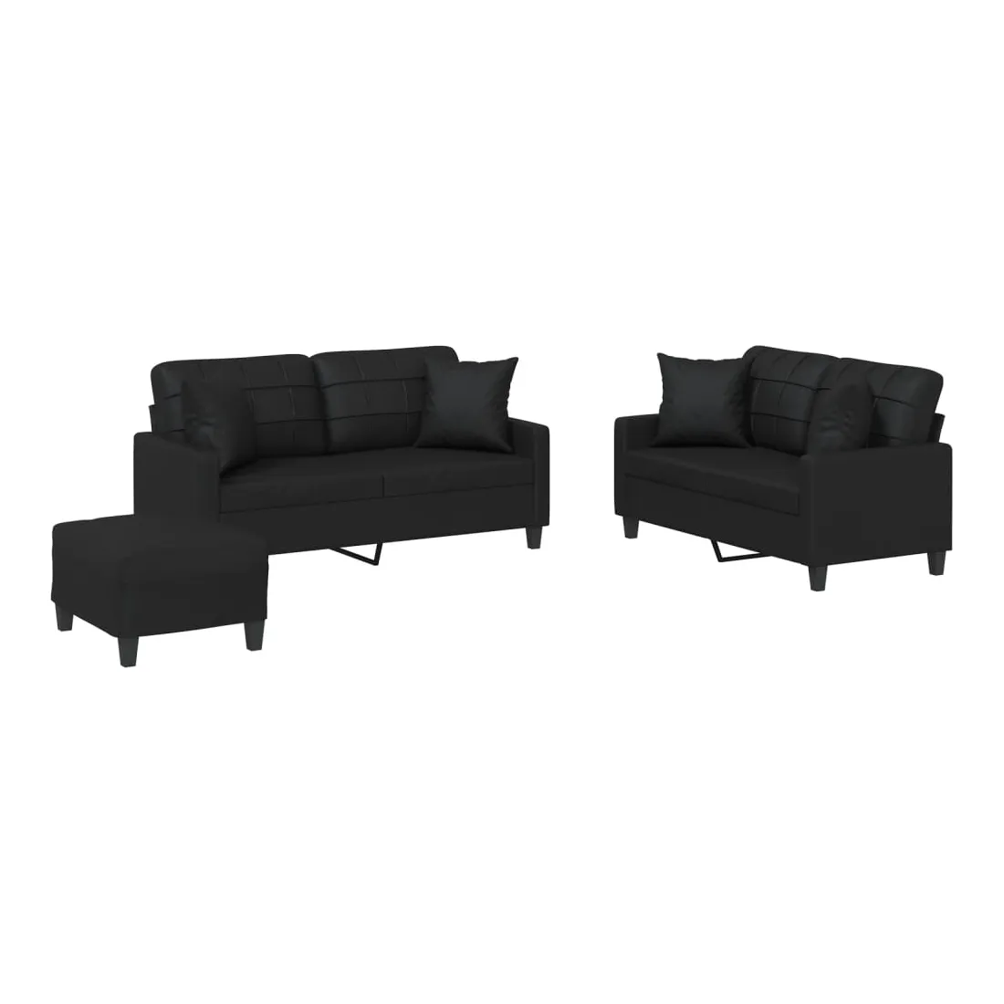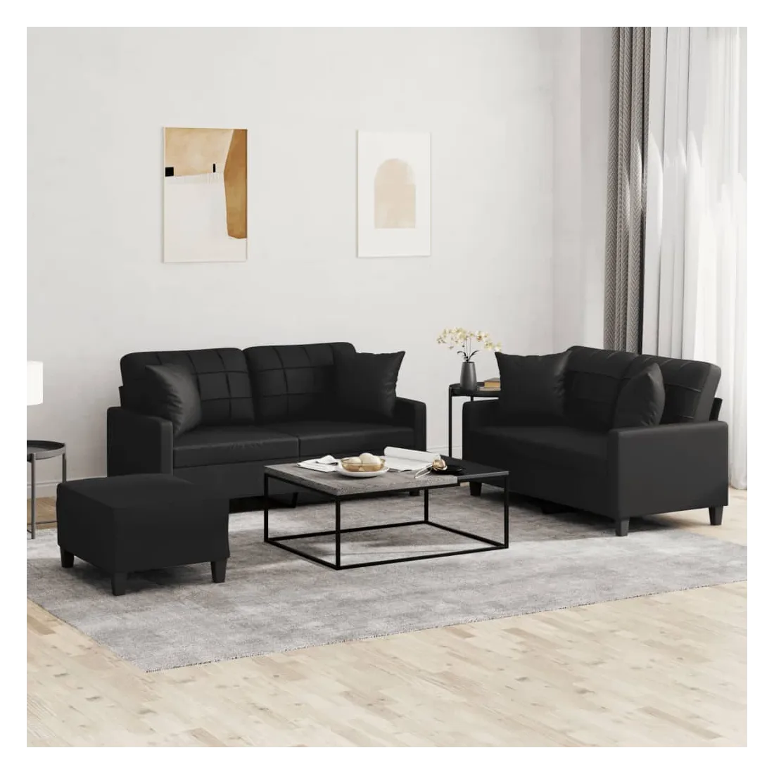 Cet ensemble de canapés est un excellent endroit pour discuter, lire, regarder la télévision ou simplement vous détendre. Il est destiné à être un point central de votre maison. Similicuir durable : le similicuir de qualité supérieure est un matériau très durable. Il est résistant aux taches, ce qui le rend facile à nettoyer avec un chiffon humide. La surface lisse donne également un aspect luxueux et la beauté du cuir véritable.Structure robuste et stable : la structure en contreplaqué et en métal du canapé assure robustesse et stabilité.Expérience d'assise confortable : le canapé est très confortable avec le siège, les accoudoirs et les oreillers de dossier bien rembourrés.Oreillers de canapé pratiques : ces oreillers décoratifs carrés non seulement embellissent votre décor, mais ils peuvent également apporter un confort supplémentaire lorsque vous êtes assis ou allongé.Pouf polyvalent : ce repose-pied convient pour reposer vos pieds lorsque vous êtes allongé dans un canapé, ou pour vous offrir un siège supplémentaire dans votre pièce. De plus, le design simple et la taille compacte le rendent idéal pour presque tous vos espaces de vie.