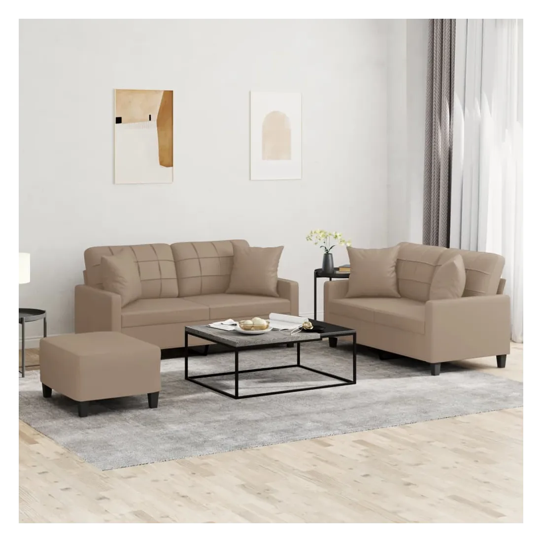 Cet ensemble de canapés est un excellent endroit pour discuter, lire, regarder la télévision ou simplement vous détendre. Il est destiné à être un point central de votre maison. Similicuir durable : le similicuir de qualité supérieure est un matériau très durable. Il est résistant aux taches, ce qui le rend facile à nettoyer avec un chiffon humide. La surface lisse donne également un aspect luxueux et la beauté du cuir véritable.Structure robuste et stable : la structure en contreplaqué et en métal du canapé assure robustesse et stabilité.Expérience d'assise confortable : le canapé est très confortable avec le siège, les accoudoirs et les oreillers de dossier bien rembourrés.Oreillers de canapé pratiques : ces oreillers décoratifs carrés non seulement embellissent votre décor, mais ils peuvent également apporter un confort supplémentaire lorsque vous êtes assis ou allongé.Pouf polyvalent : ce repose-pied convient pour reposer vos pieds lorsque vous êtes allongé dans un canapé, ou pour vous offrir un siège supplémentaire dans votre pièce. De plus, le design simple et la taille compacte le rendent idéal pour presque tous vos espaces de vie.