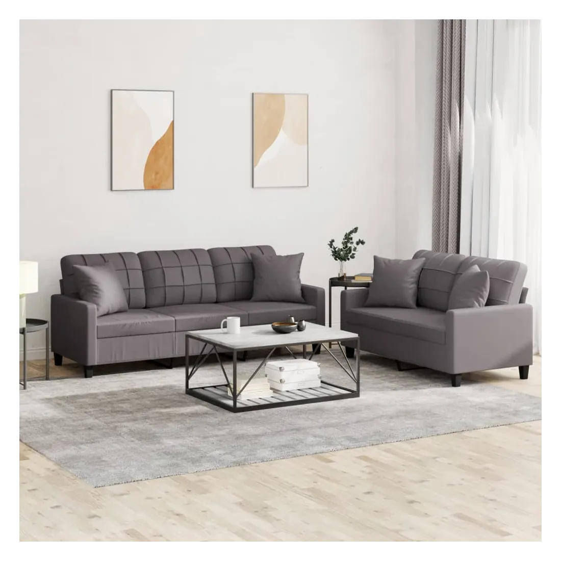 Cet ensemble de canapés est un excellent endroit pour discuter, lire, regarder la télévision ou simplement vous détendre. Il est destiné à être un point central de votre maison. Similicuir durable : le similicuir de qualité supérieure est un matériau très durable. Il est résistant aux taches, ce qui le rend facile à nettoyer avec un chiffon humide. La surface lisse donne également un aspect luxueux et la beauté du cuir véritable.Structure robuste et stable : la structure en contreplaqué et en métal du canapé assure robustesse et stabilité.Expérience d'assise confortable : le canapé est très confortable avec le siège, les accoudoirs et les oreillers de dossier bien rembourrés.Oreillers de canapé pratiques : ces oreillers décoratifs carrés non seulement embellissent votre décor, mais ils peuvent également apporter un confort supplémentaire lorsque vous êtes assis ou allongé.