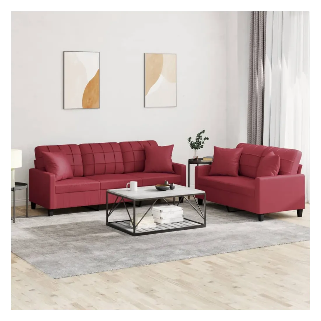 Cet ensemble de canapés est un excellent endroit pour discuter, lire, regarder la télévision ou simplement vous détendre. Il est destiné à être un point central de votre maison. Similicuir durable : le similicuir de qualité supérieure est un matériau très durable. Il est résistant aux taches, ce qui le rend facile à nettoyer avec un chiffon humide. La surface lisse donne également un aspect luxueux et la beauté du cuir véritable.Structure robuste et stable : la structure en contreplaqué et en métal du canapé assure robustesse et stabilité.Expérience d'assise confortable : le canapé est très confortable avec le siège, les accoudoirs et les oreillers de dossier bien rembourrés.Oreillers de canapé pratiques : ces oreillers décoratifs carrés non seulement embellissent votre décor, mais ils peuvent également apporter un confort supplémentaire lorsque vous êtes assis ou allongé.