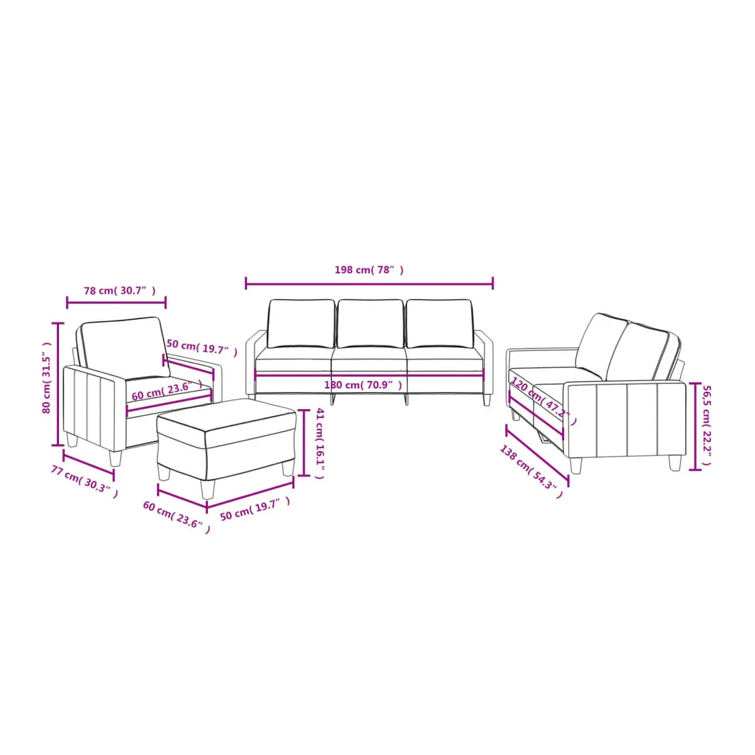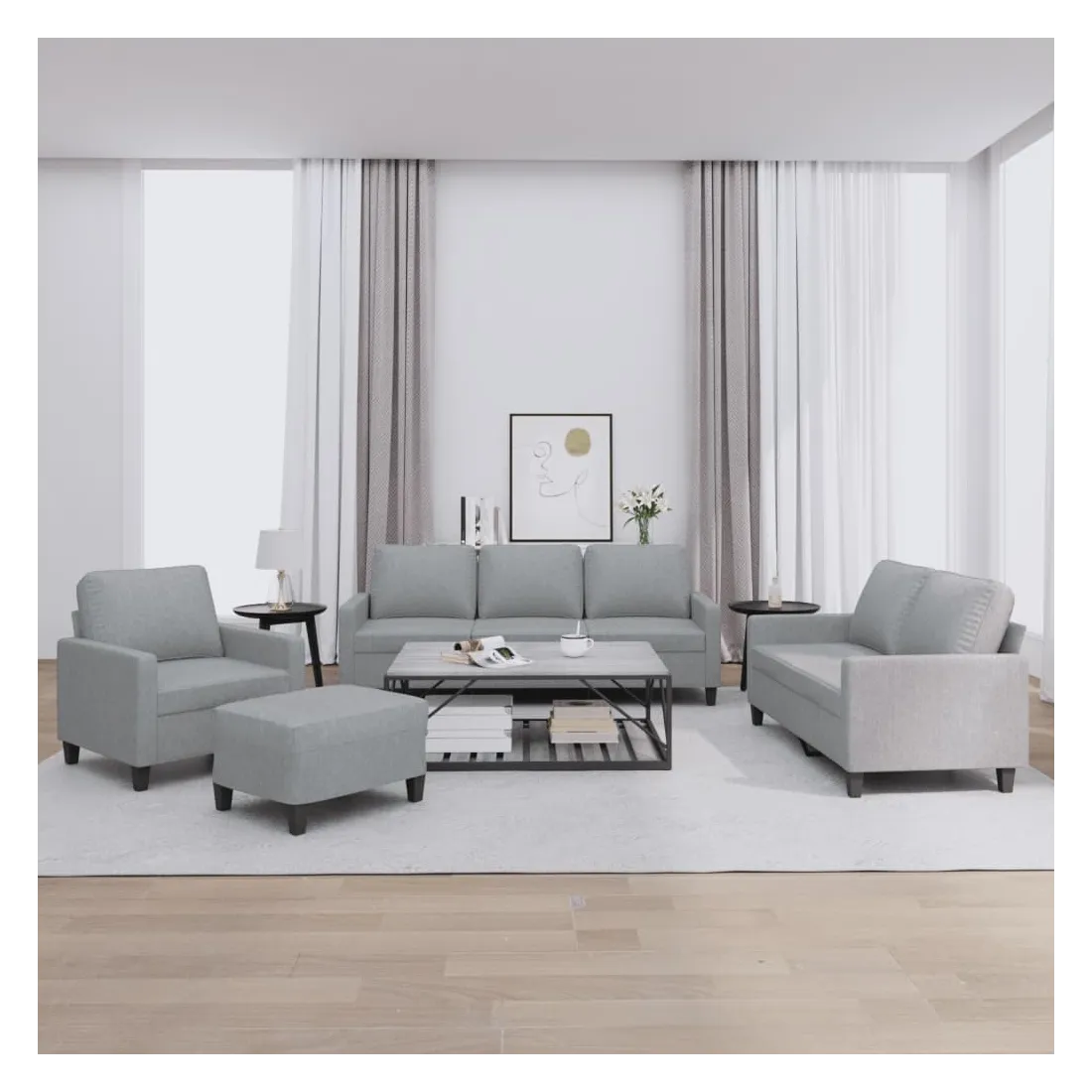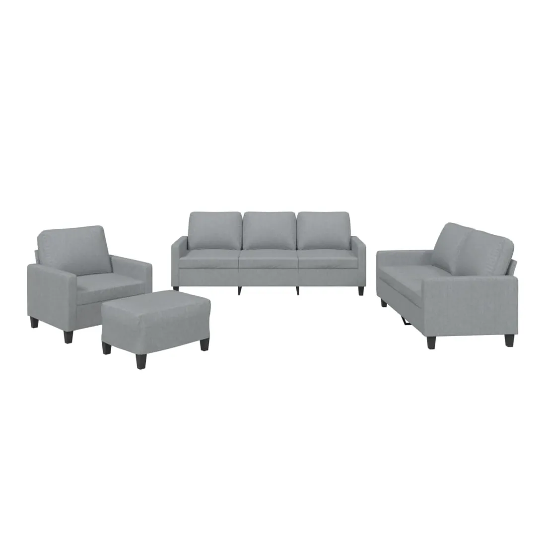 Cet ensemble de canapés est un excellent endroit pour discuter, lire, regarder la télévision ou simplement vous détendre. Il est destiné à être un point central de votre maison. Tissu durable : le tissu présente un aspect simple et épuré tout en restant respirant et durable.Structure robuste et stable : la structure en contreplaqué et en métal du canapé assure robustesse et stabilité.Expérience d'assise confortable : le canapé est très confortable avec le siège, les accoudoirs et les oreillers de dossier bien rembourrés.Pouf polyvalent : ce repose-pied convient pour reposer vos pieds lorsque vous êtes allongé dans un canapé, ou pour vous offrir un siège supplémentaire dans votre pièce. De plus, le design simple et la taille compacte le rendent idéal pour presque tous vos espaces de vie.