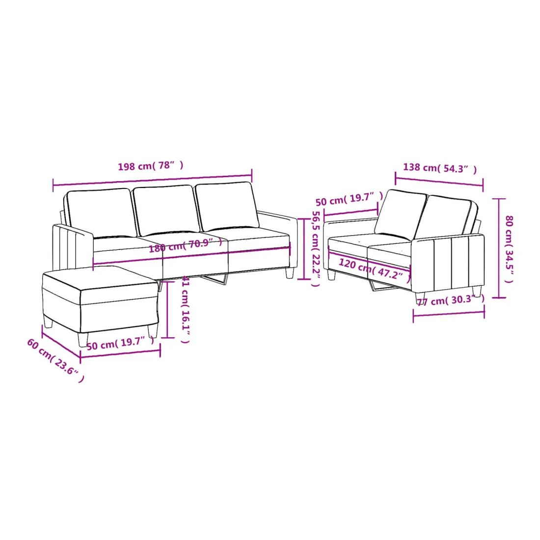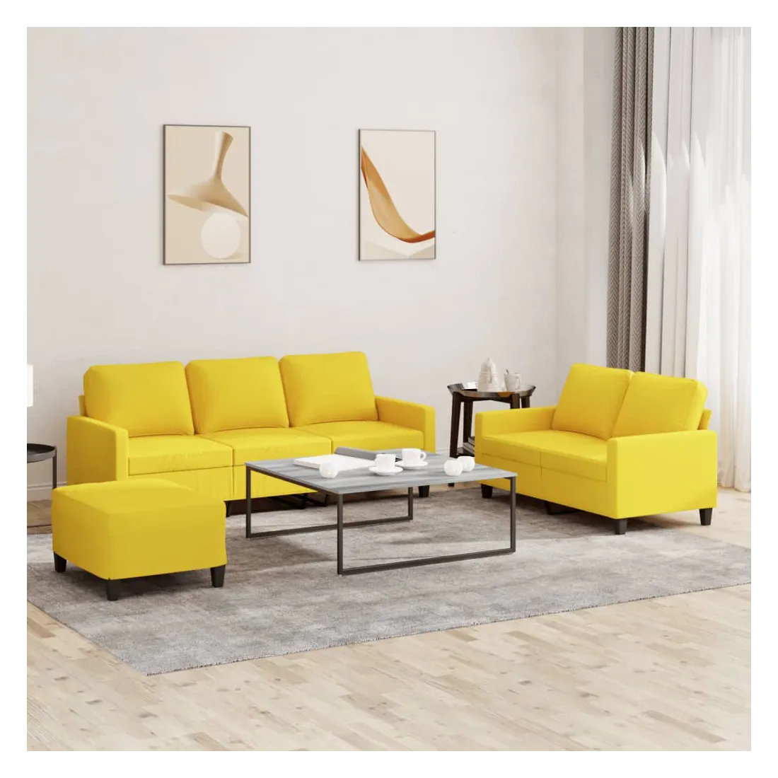 Cet ensemble de canapés est un excellent endroit pour discuter, lire, regarder la télévision ou simplement vous détendre. Il est destiné à être un point central de votre maison. Tissu durable : le tissu présente un aspect simple et épuré tout en restant respirant et durable.Structure robuste et stable : la structure en contreplaqué et en métal du canapé assure robustesse et stabilité.Expérience d'assise confortable : le canapé est très confortable grâce au siège et aux accoudoirs épais et rembourrés.Pouf polyvalent : ce repose-pied convient pour reposer vos pieds lorsque vous êtes allongé dans un canapé, ou pour vous offrir un siège supplémentaire dans votre pièce. De plus, le design simple et la taille compacte le rendent idéal pour presque tous vos espaces de vie.