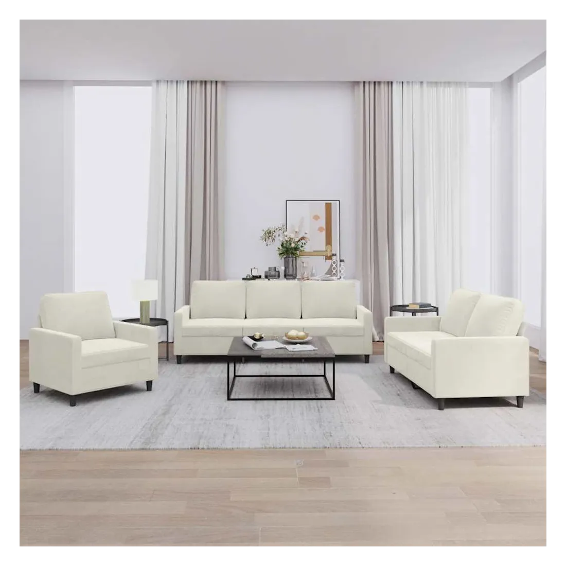 Cet ensemble de canapés est un excellent endroit pour discuter, lire, regarder la télévision ou simplement vous détendre. Il est destiné à être un point central de votre maison. Velours doux : le velours est un tissu doux et confortable, agréable au toucher.Structure robuste et stable : la structure en contreplaqué et en métal du canapé assure robustesse et stabilité.Expérience d'assise confortable : le canapé est très confortable grâce au siège et aux accoudoirs épais et rembourrés.