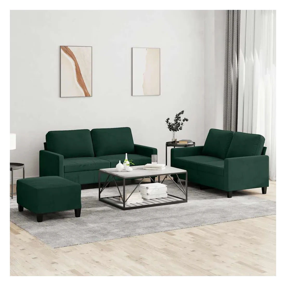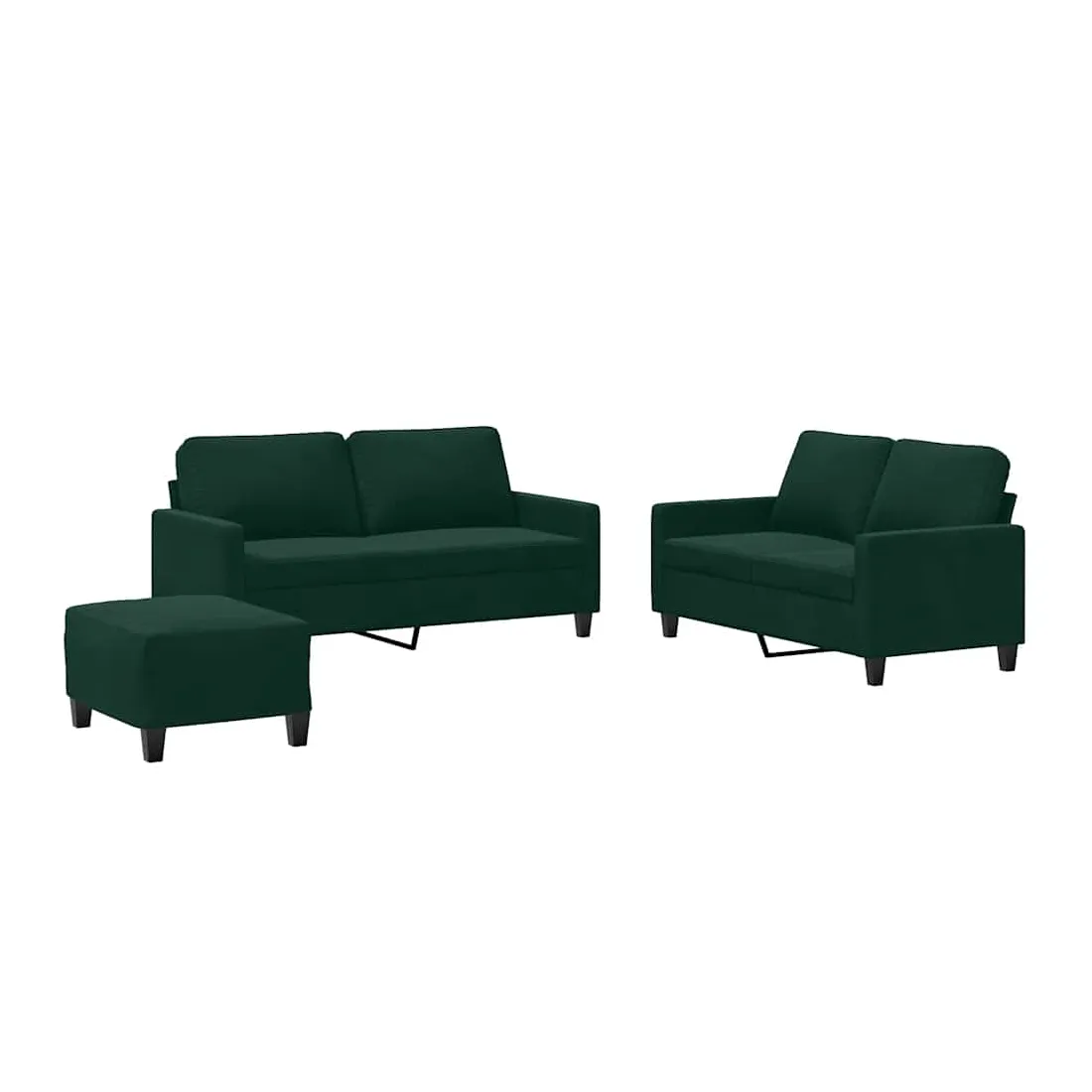 Cet ensemble de canapés est un excellent endroit pour discuter, lire, regarder la télévision ou simplement vous détendre. Il est destiné à être un point central de votre maison. Velours doux : le velours est un tissu doux et confortable, agréable au toucher.Structure robuste et stable : la structure en contreplaqué et en métal du canapé assure robustesse et stabilité.Expérience d'assise confortable : le canapé est très confortable grâce au siège et aux accoudoirs épais et rembourrés.Pouf polyvalent : ce repose-pied convient pour reposer vos pieds lorsque vous êtes allongé dans un canapé, ou pour vous offrir un siège supplémentaire dans votre pièce. De plus, le design simple et la taille compacte le rendent idéal pour presque tous vos espaces de vie.