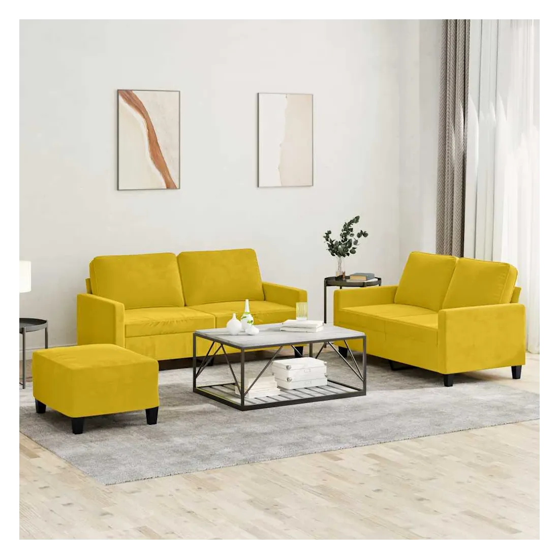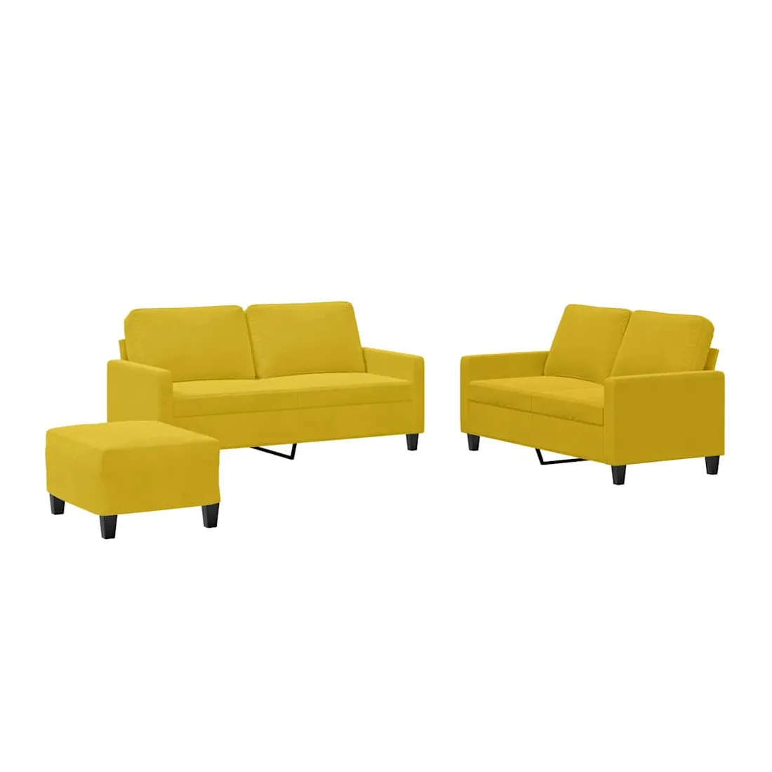 Cet ensemble de canapés est un excellent endroit pour discuter, lire, regarder la télévision ou simplement vous détendre. Il est destiné à être un point central de votre maison. Velours doux : le velours est un tissu doux et confortable, agréable au toucher.Structure robuste et stable : la structure en contreplaqué et en métal du canapé assure robustesse et stabilité.Expérience d'assise confortable : le canapé est très confortable grâce au siège et aux accoudoirs épais et rembourrés.Pouf polyvalent : ce repose-pied convient pour reposer vos pieds lorsque vous êtes allongé dans un canapé, ou pour vous offrir un siège supplémentaire dans votre pièce. De plus, le design simple et la taille compacte le rendent idéal pour presque tous vos espaces de vie.