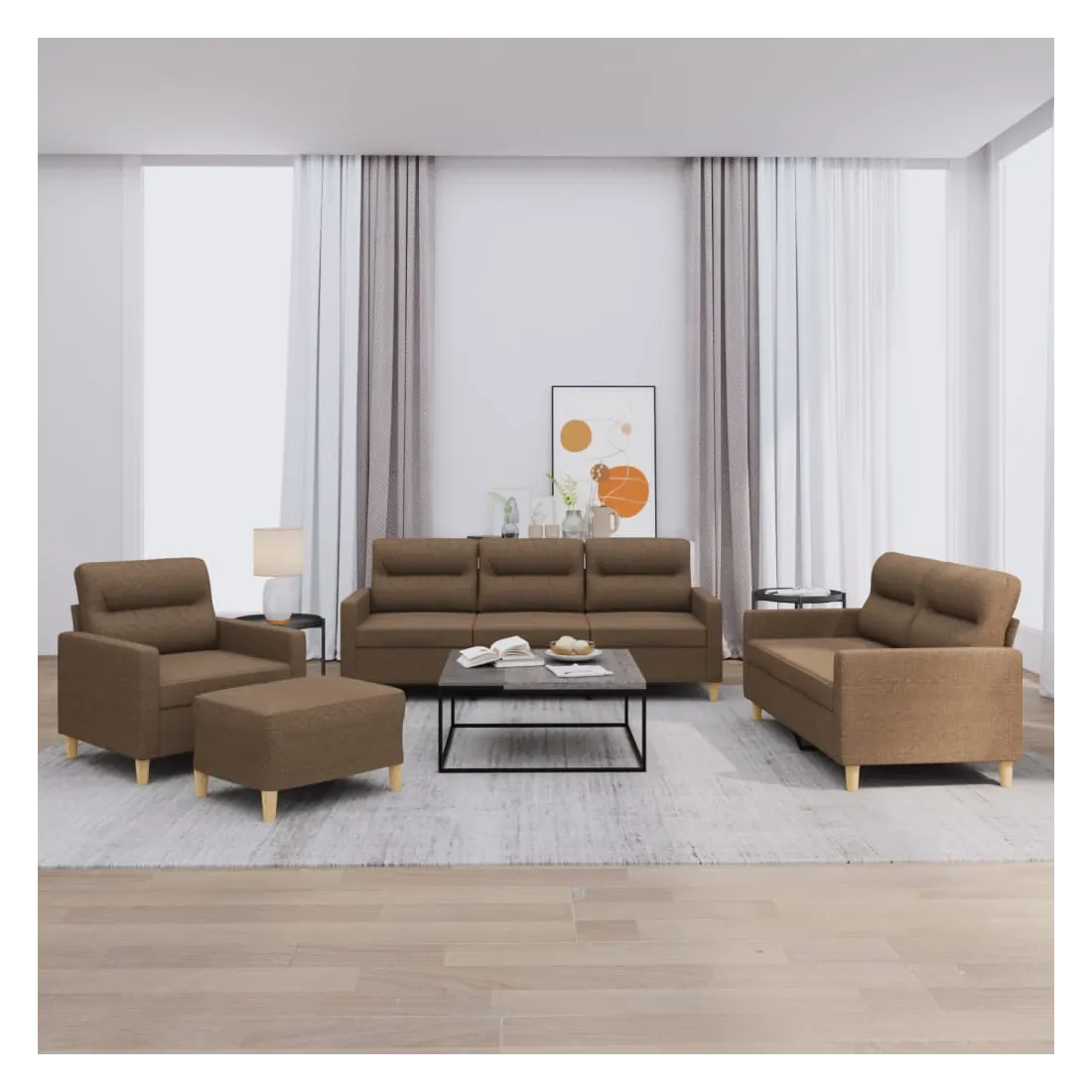 Cet ensemble de canapés est un excellent endroit pour discuter, lire, regarder la télévision ou simplement vous détendre. Il est destiné à être un point central de votre maison. Tissu durable : le tissu présente un aspect simple et épuré tout en restant respirant et durable.Structure robuste et stable : la structure en contreplaqué et en métal du canapé assure robustesse et stabilité.Expérience d'assise confortable : le canapé est très confortable grâce au siège et aux accoudoirs épais et rembourrés.Pouf polyvalent : ce repose-pied convient pour reposer vos pieds lorsque vous êtes allongé dans un canapé, ou pour vous offrir un siège supplémentaire dans votre pièce. De plus, le design simple et la taille compacte le rendent idéal pour presque tous vos espaces de vie.