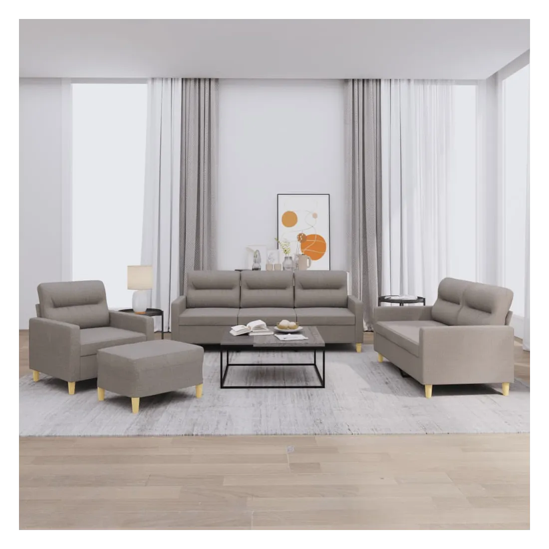 Cet ensemble de canapés est un excellent endroit pour discuter, lire, regarder la télévision ou simplement vous détendre. Il est destiné à être un point central de votre maison. Tissu durable : le tissu présente un aspect simple et épuré tout en restant respirant et durable.Structure robuste et stable : la structure en contreplaqué et en métal du canapé assure robustesse et stabilité.Expérience d'assise confortable : le canapé est très confortable grâce au siège et aux accoudoirs épais et rembourrés.Pouf polyvalent : ce repose-pied convient pour reposer vos pieds lorsque vous êtes allongé dans un canapé, ou pour vous offrir un siège supplémentaire dans votre pièce. De plus, le design simple et la taille compacte le rendent idéal pour presque tous vos espaces de vie.