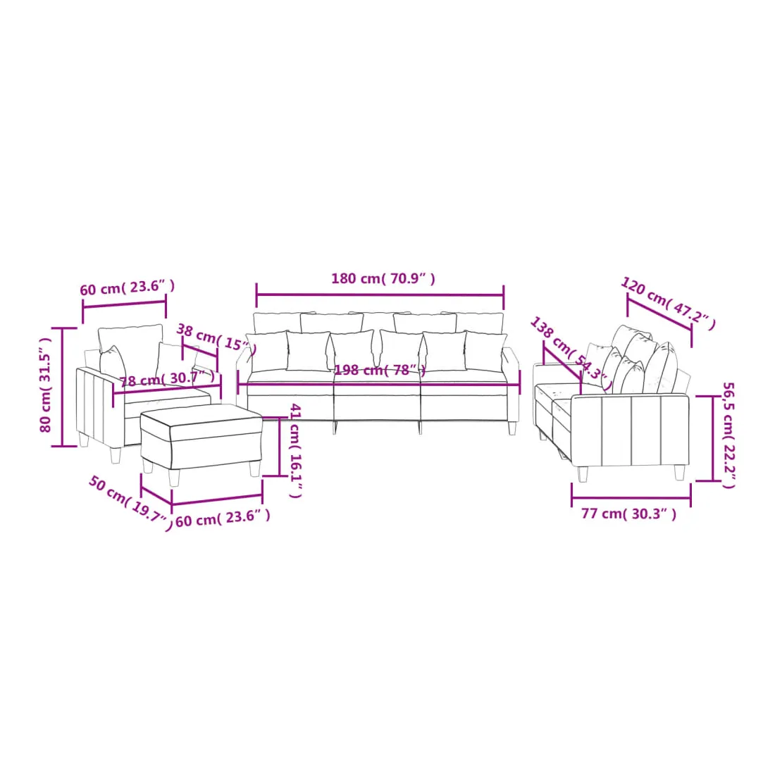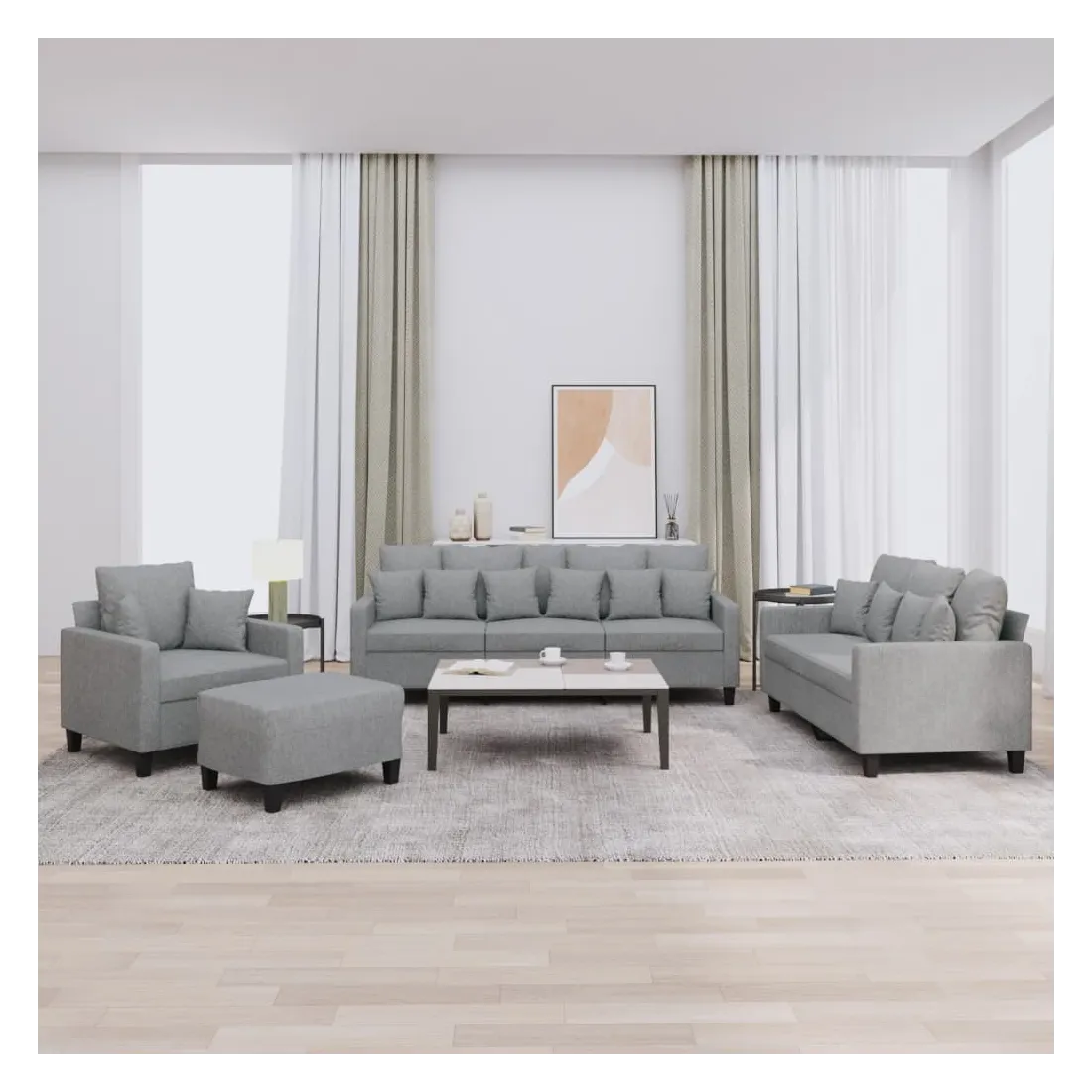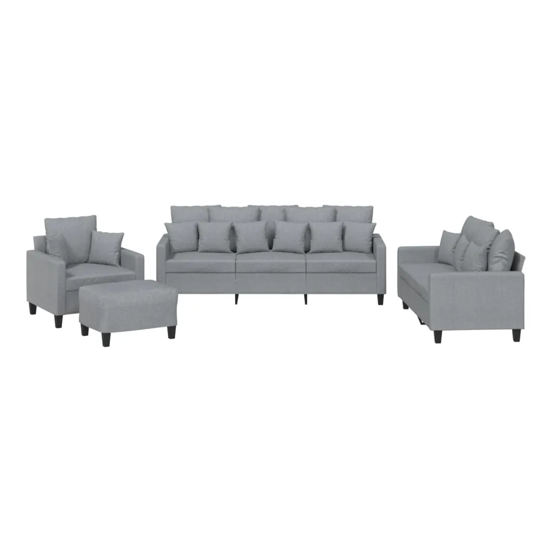 Cet ensemble de canapés est un excellent endroit pour discuter, lire, regarder la télévision ou simplement vous détendre. Il est destiné à être un point central de votre maison. Tissu durable : le tissu présente un aspect simple et épuré tout en restant respirant et durable.Structure robuste et stable : la structure en contreplaqué et en métal du canapé assure robustesse et stabilité.Expérience d'assise confortable : le canapé est très confortable avec le siège, les accoudoirs et les oreillers de dossier bien rembourrés.Oreillers de canapé pratiques : ces oreillers décoratifs carrés non seulement embellissent votre décor, mais ils peuvent également apporter un confort supplémentaire lorsque vous êtes assis ou allongé.Pouf polyvalent : ce repose-pied convient pour reposer vos pieds lorsque vous êtes allongé dans un canapé, ou pour vous offrir un siège supplémentaire dans votre pièce. De plus, le design simple et la taille compacte le rendent idéal pour presque tous vos espaces de vie.