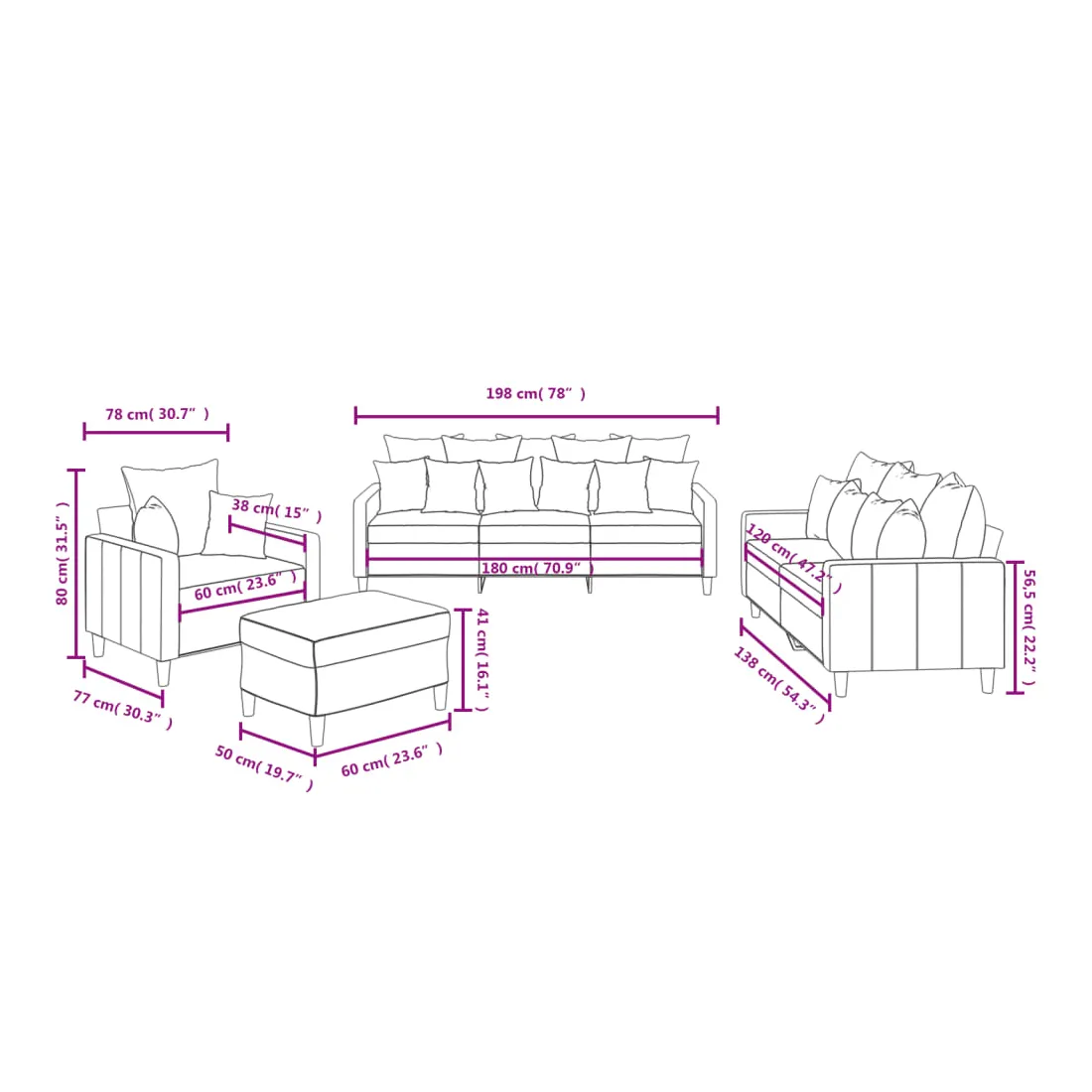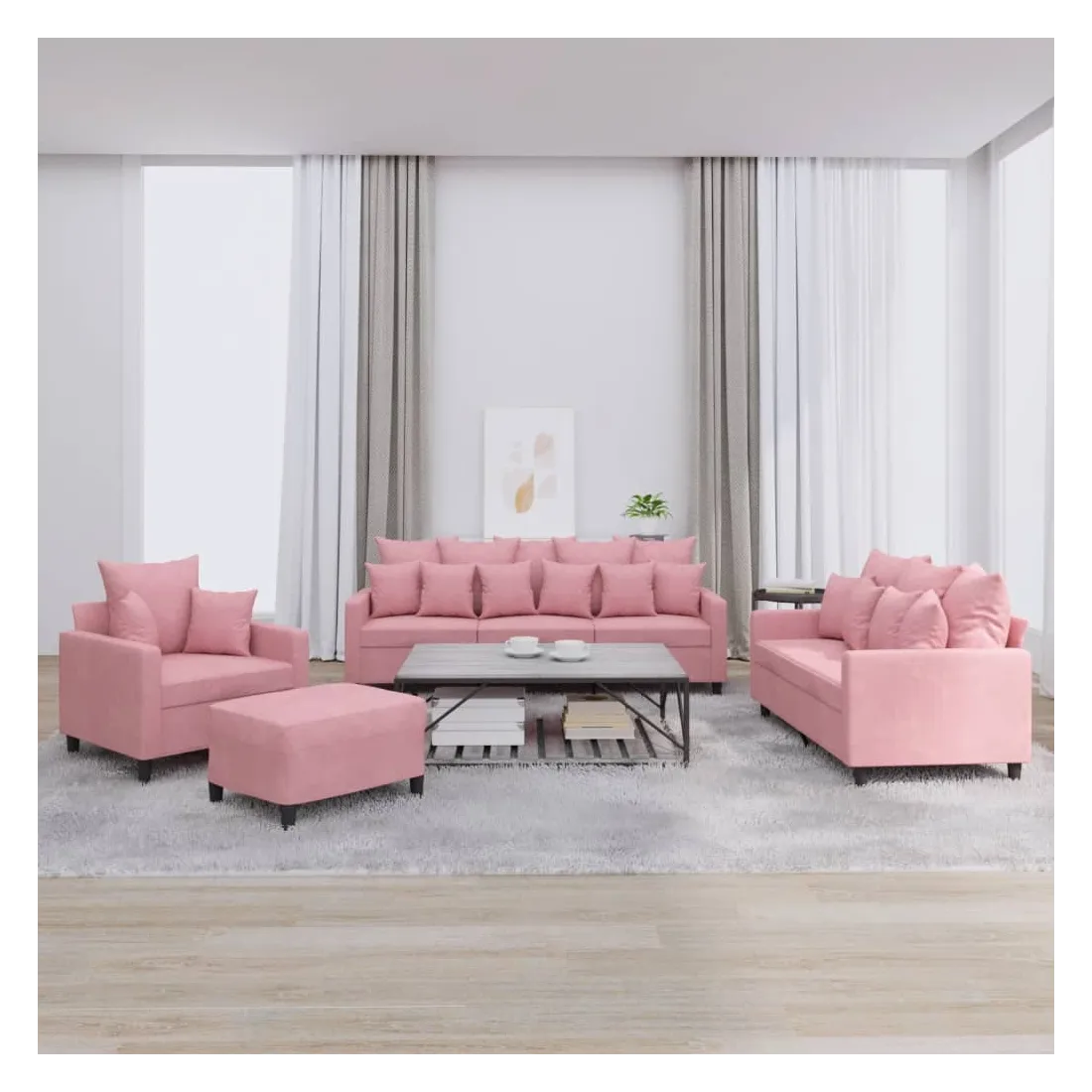 Cet ensemble de canapés est un excellent endroit pour discuter, lire, regarder la télévision ou simplement vous détendre. Il est destiné à être un point central de votre maison. Velours doux : le velours est un tissu doux et confortable, agréable au toucher.Structure robuste et stable : la structure en contreplaqué et en métal du canapé assure robustesse et stabilité. Expérience d'assise confortable : le canapé est très confortable avec le siège, les accoudoirs et les oreillers de dossier bien rembourrés.Pouf polyvalent : ce repose-pied convient pour reposer vos pieds lorsque vous êtes allongé dans un canapé ou pour vous offrir un siège supplémentaire dans votre pièce. De plus, le design simple et la taille compacte le rendent idéal pour presque tous vos espaces de vie.