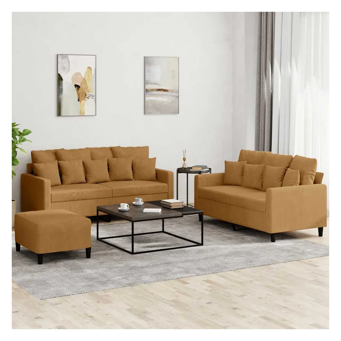 Cet ensemble de canapés est un excellent endroit pour discuter, lire, regarder la télévision ou simplement vous détendre. Il est destiné à être un point central de votre maison. Velours doux : le velours est un tissu doux et confortable, agréable au toucher.Structure robuste et stable : la structure en contreplaqué et en métal du canapé assure robustesse et stabilité. Expérience d'assise confortable : le canapé est très confortable avec le siège, les accoudoirs et les oreillers de dossier bien rembourrés.Pouf polyvalent : ce repose-pied convient pour reposer vos pieds lorsque vous êtes allongé dans un canapé ou pour vous offrir un siège supplémentaire dans votre pièce. De plus, le design simple et la taille compacte le rendent idéal pour presque tous vos espaces de vie.