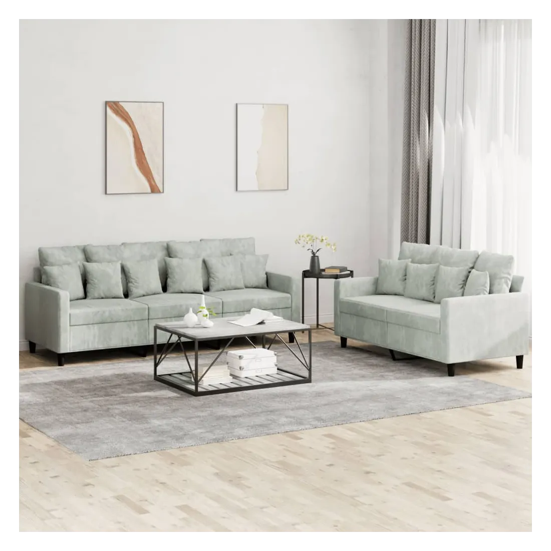 Cet ensemble de canapés est un excellent endroit pour discuter, lire, regarder la télévision ou simplement vous détendre. Il est destiné à être un point central de votre maison. Velours doux : le velours est un tissu doux et confortable, agréable au toucher. Structure robuste et stable : la structure en contreplaqué et en métal du canapé assure robustesse et stabilité. Expérience d'assise confortable : le canapé est très confortable avec le siège, les accoudoirs et les oreillers de dossier bien rembourrés.