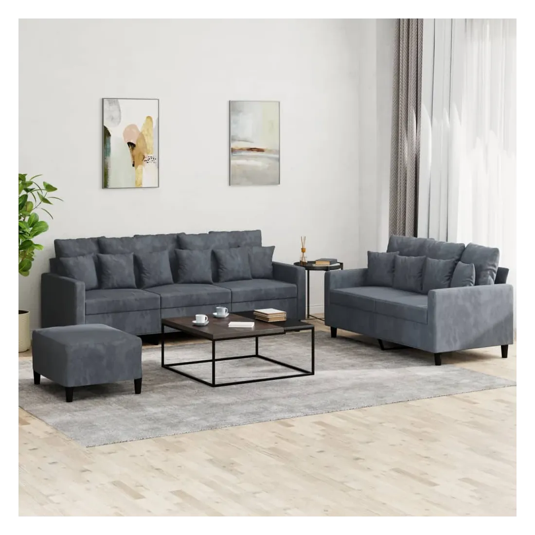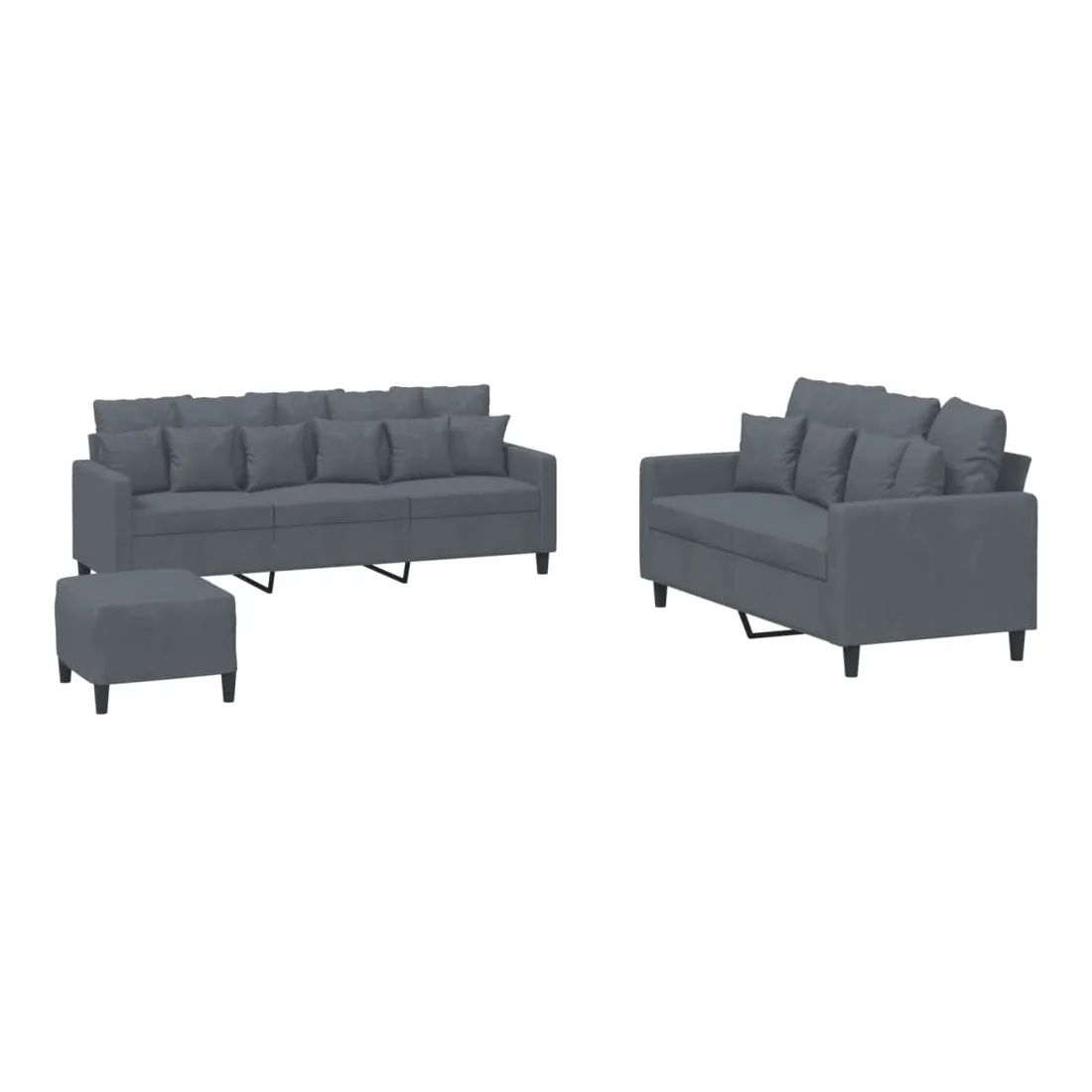 Cet ensemble de canapés est un excellent endroit pour discuter, lire, regarder la télévision ou simplement vous détendre. Il est destiné à être un point central de votre maison. Velours doux : le velours est un tissu doux et confortable, agréable au toucher.Structure robuste et stable : la structure en contreplaqué et en métal du canapé assure robustesse et stabilité. Expérience d'assise confortable : le canapé est très confortable avec le siège, les accoudoirs et les oreillers de dossier bien rembourrés.Pouf polyvalent : ce repose-pied convient pour reposer vos pieds lorsque vous êtes allongé dans un canapé ou pour vous offrir un siège supplémentaire dans votre pièce. De plus, le design simple et la taille compacte le rendent idéal pour presque tous vos espaces de vie.