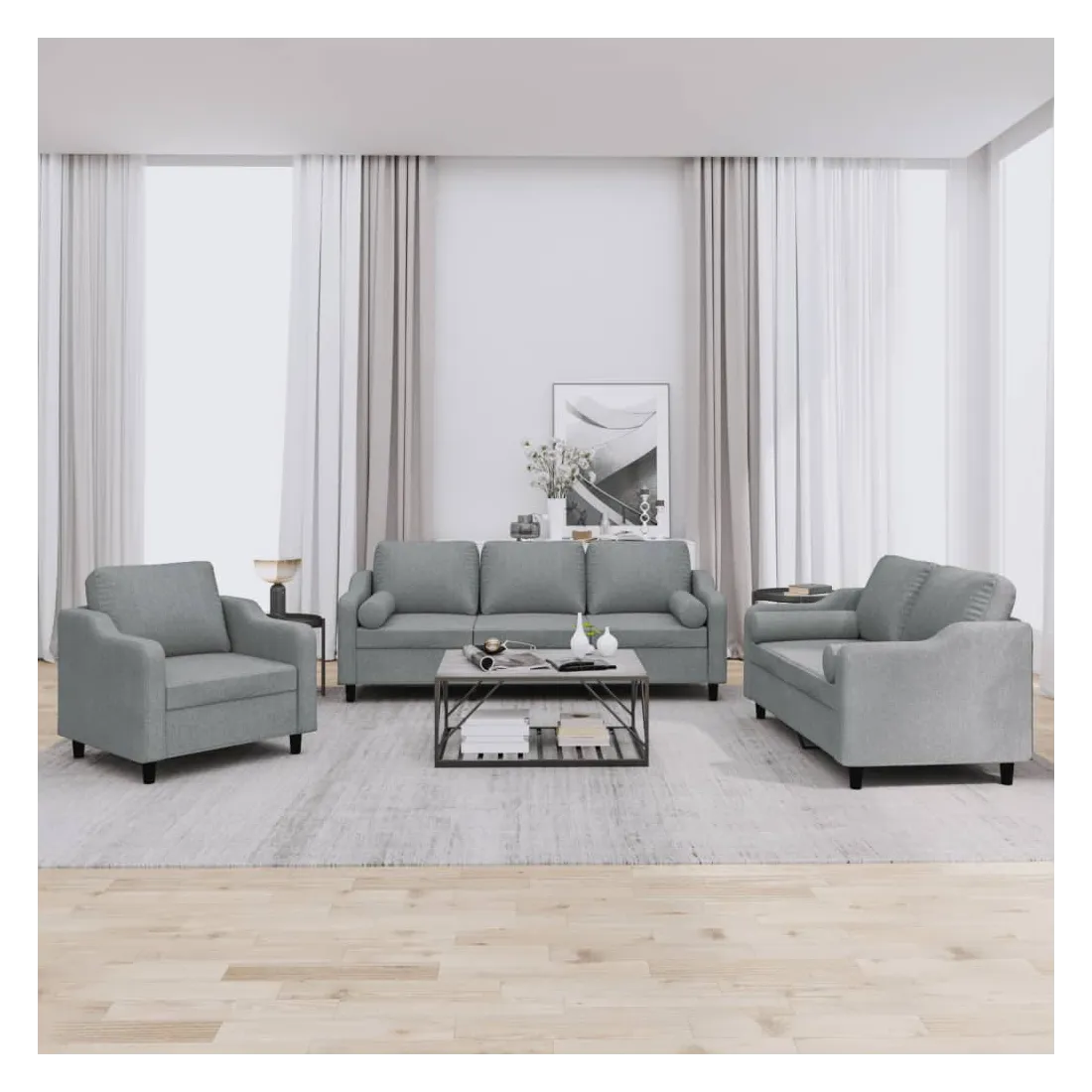 Cet ensemble de canapés est un excellent endroit pour discuter, lire, regarder la télévision ou simplement vous détendre. Il est destiné à être un point central de votre maison. Tissu durable : le tissu présente un aspect simple et épuré tout en restant respirant et durable.Structure robuste et stable : la structure en contreplaqué et en métal du canapé assure robustesse et stabilité. Expérience d'assise confortable : le canapé est très confortable avec le siège, les accoudoirs et les oreillers de dossier bien rembourrés. Oreillers cylindriques pratiques : ces oreillers cylindriques non seulement embellissent votre décor mais ils peuvent également apporter un confort supplémentaire lorsque vous êtes assis ou allongé.