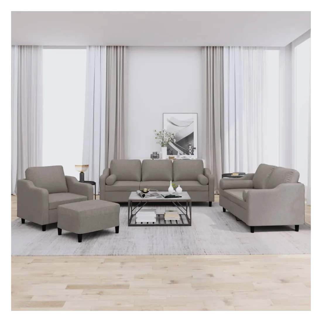 Cet ensemble de canapés est un excellent endroit pour discuter, lire, regarder la télévision ou simplement vous détendre. Il est destiné à être un point central de votre maison. Tissu durable : le tissu présente un aspect simple et épuré tout en restant respirant et durable.Structure robuste et stable : la structure en contreplaqué et en métal du canapé assure robustesse et stabilité. Expérience d'assise confortable : le canapé est très confortable avec le siège, les accoudoirs et les oreillers de dossier bien rembourrés. Oreillers cylindriques pratiques : ces oreillers cylindriques non seulement embellissent votre décor mais ils peuvent également apporter un confort supplémentaire lorsque vous êtes assis ou allongé. Pouf polyvalent : ce repose-pied convient pour reposer vos pieds lorsque vous êtes allongé dans un canapé ou pour vous offrir un siège supplémentaire dans votre pièce. De plus, le design simple et la taille compacte le rendent idéal pour presque tous vos espaces de vie.
