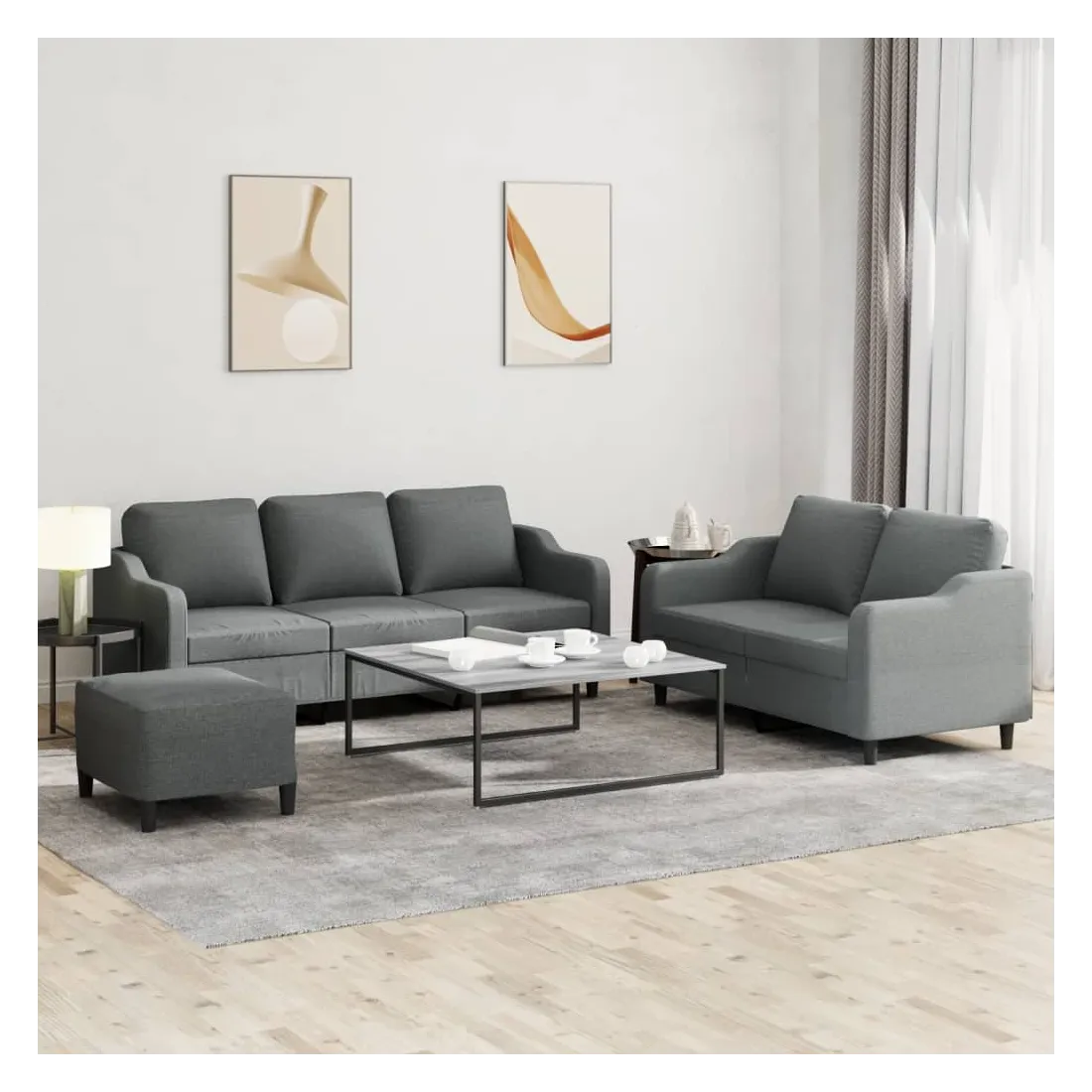 Cet ensemble de canapés est un excellent endroit pour discuter, lire, regarder la télévision ou simplement vous détendre. Il est destiné à être un point central de votre maison. Tissu durable : le tissu présente un aspect simple et épuré tout en restant respirant et durable.Structure robuste et stable : la structure en contreplaqué et en métal du canapé assure robustesse et stabilité. Expérience d'assise confortable : le canapé est très confortable avec le siège, les accoudoirs et les oreillers de dossier bien rembourrés. Pouf polyvalent : ce repose-pied convient pour reposer vos pieds lorsque vous êtes allongé dans un canapé ou pour vous offrir un siège supplémentaire dans votre pièce. De plus, le design simple et la taille compacte le rendent idéal pour presque tous vos espaces de vie.