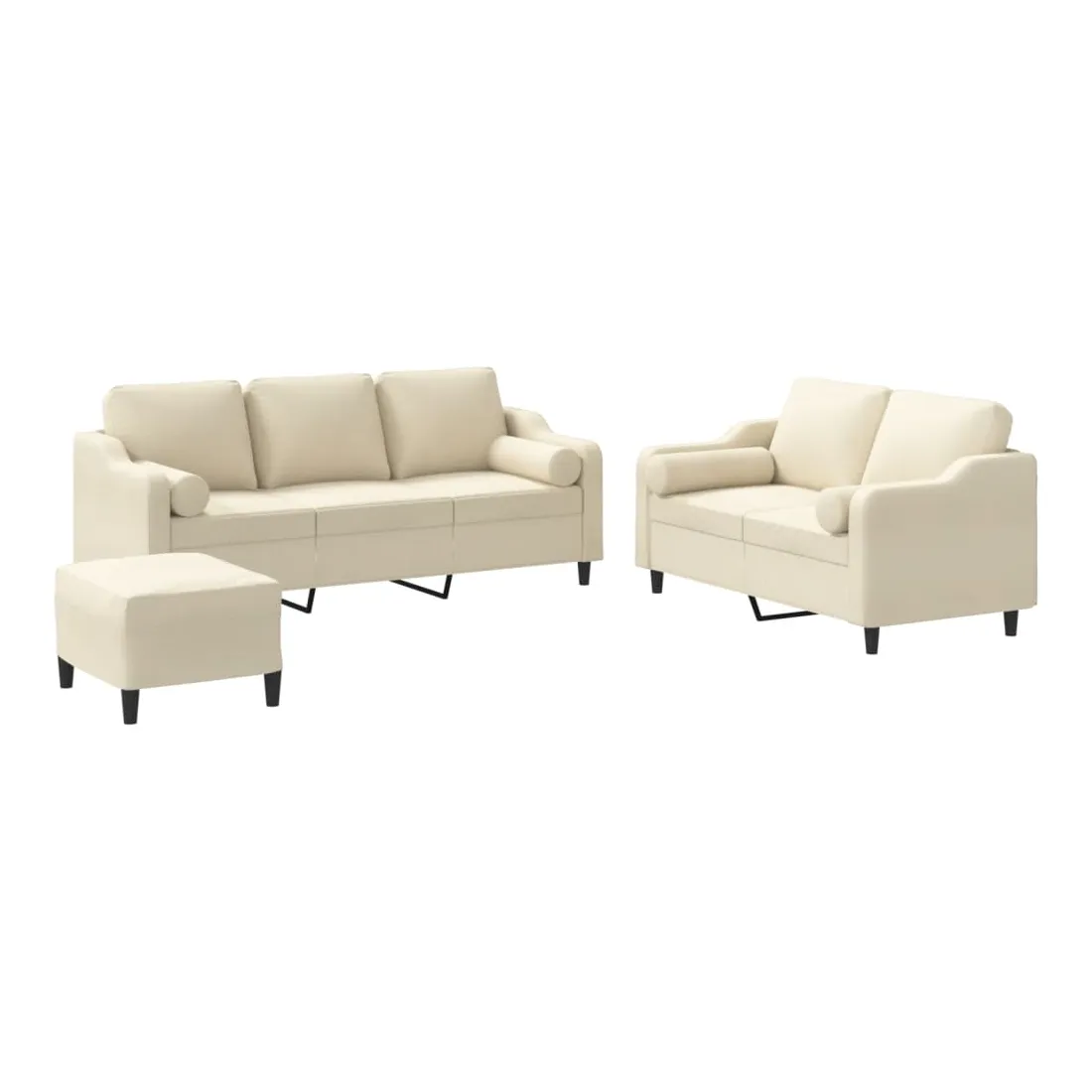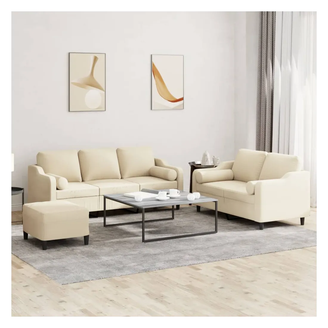Cet ensemble de canapés est un excellent endroit pour discuter, lire, regarder la télévision ou simplement vous détendre. Il est destiné à être un point central de votre maison. Tissu durable : le tissu présente un aspect simple et épuré tout en restant respirant et durable.Structure robuste et stable : la structure en contreplaqué et en métal du canapé assure robustesse et stabilité. Expérience d'assise confortable : le canapé est très confortable avec le siège, les accoudoirs et les oreillers de dossier bien rembourrés. Oreillers cylindriques pratiques : ces oreillers cylindriques non seulement embellissent votre décor mais ils peuvent également apporter un confort supplémentaire lorsque vous êtes assis ou allongé. Pouf polyvalent : ce repose-pied convient pour reposer vos pieds lorsque vous êtes allongé dans un canapé ou pour vous offrir un siège supplémentaire dans votre pièce. De plus, le design simple et la taille compacte le rendent idéal pour presque tous vos espaces de vie.