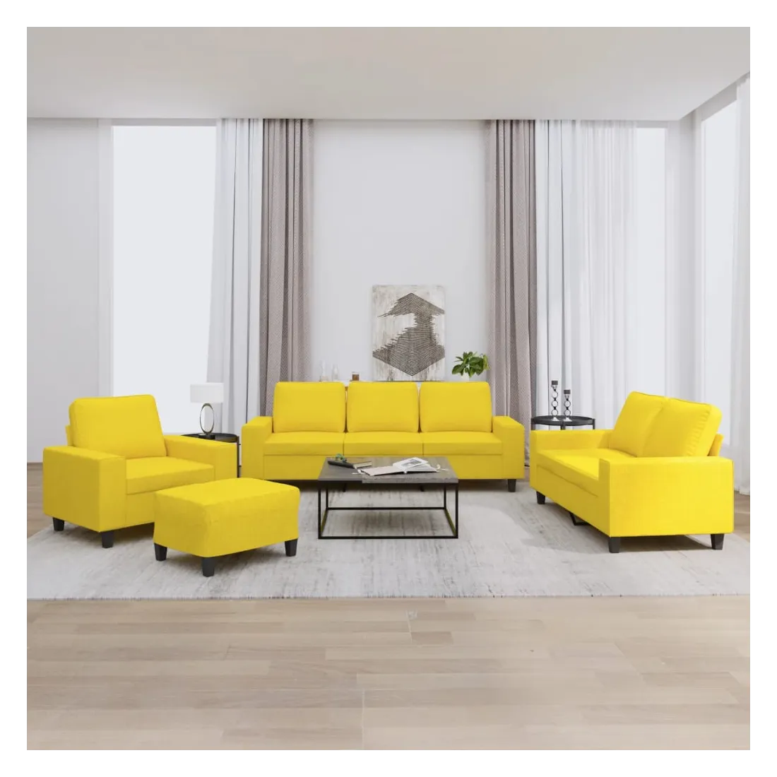 Cet ensemble de canapés est un excellent endroit pour discuter, lire, regarder la télévision ou simplement vous détendre. Il est destiné à être un point central de votre maison. Tissu durable : le tissu présente un aspect simple et épuré tout en restant respirant et durable.Structure robuste et stable : la structure en contreplaqué et en métal du canapé assure robustesse et stabilité.Expérience d'assise confortable : le canapé est très confortable avec le siège, les accoudoirs et les oreillers de dossier bien rembourrés.Pouf polyvalent : ce repose-pied convient pour reposer vos pieds lorsque vous êtes allongé dans un canapé ou pour vous offrir un siège supplémentaire dans votre pièce. De plus, le design simple et la taille compacte le rendent idéal pour presque tous vos espaces de vie.