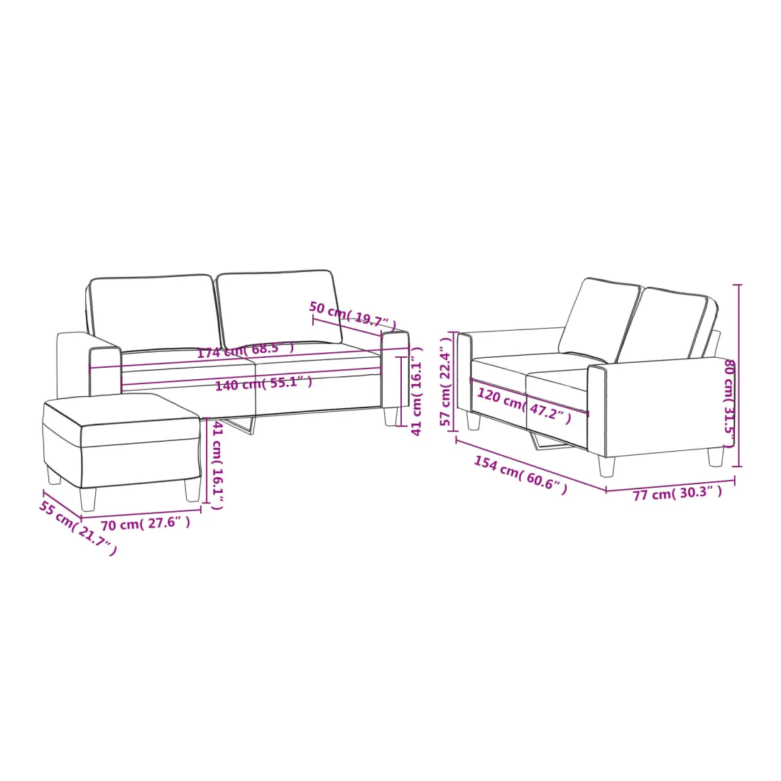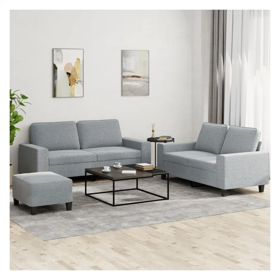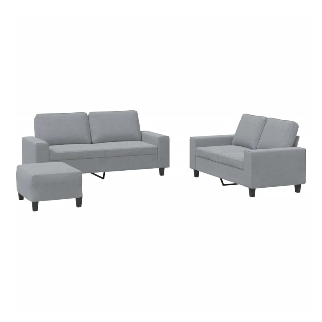 Cet ensemble de canapés est un excellent endroit pour discuter, lire, regarder la télévision ou simplement vous détendre. Il est destiné à être un point central de votre maison. Tissu durable : le tissu présente un aspect simple et épuré tout en restant respirant et durable.Structure robuste et stable : la structure en contreplaqué et en métal du canapé assure robustesse et stabilité.Expérience d'assise confortable : le canapé est très confortable avec le siège, les accoudoirs et les oreillers de dossier bien rembourrés.Pouf polyvalent : ce repose-pied convient pour reposer vos pieds lorsque vous êtes allongé dans un canapé ou pour vous offrir un siège supplémentaire dans votre pièce. De plus, le design simple et la taille compacte le rendent idéal pour presque tous vos espaces de vie.