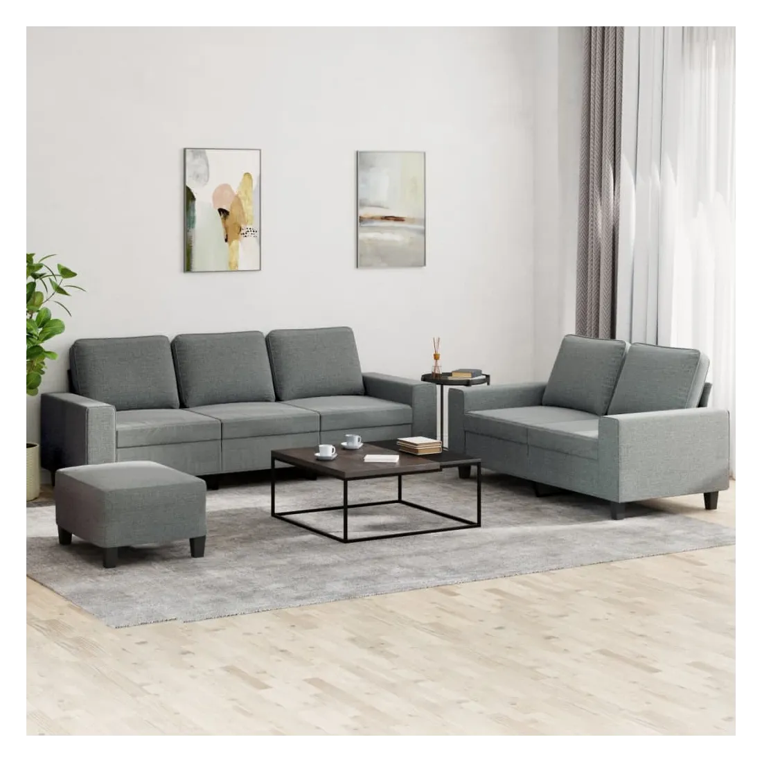 Cet ensemble de canapés est un excellent endroit pour discuter, lire, regarder la télévision ou simplement vous détendre. Il est destiné à être un point central de votre maison. Tissu durable : le tissu présente un aspect simple et épuré tout en restant respirant et durable.Structure robuste et stable : la structure en contreplaqué et en métal du canapé assure robustesse et stabilité.Expérience d'assise confortable : le canapé est très confortable avec le siège, les accoudoirs et les oreillers de dossier bien rembourrés.Pouf polyvalent : ce repose-pied convient pour reposer vos pieds lorsque vous êtes allongé dans un canapé ou pour vous offrir un siège supplémentaire dans votre pièce. De plus, le design simple et la taille compacte le rendent idéal pour presque tous vos espaces de vie.