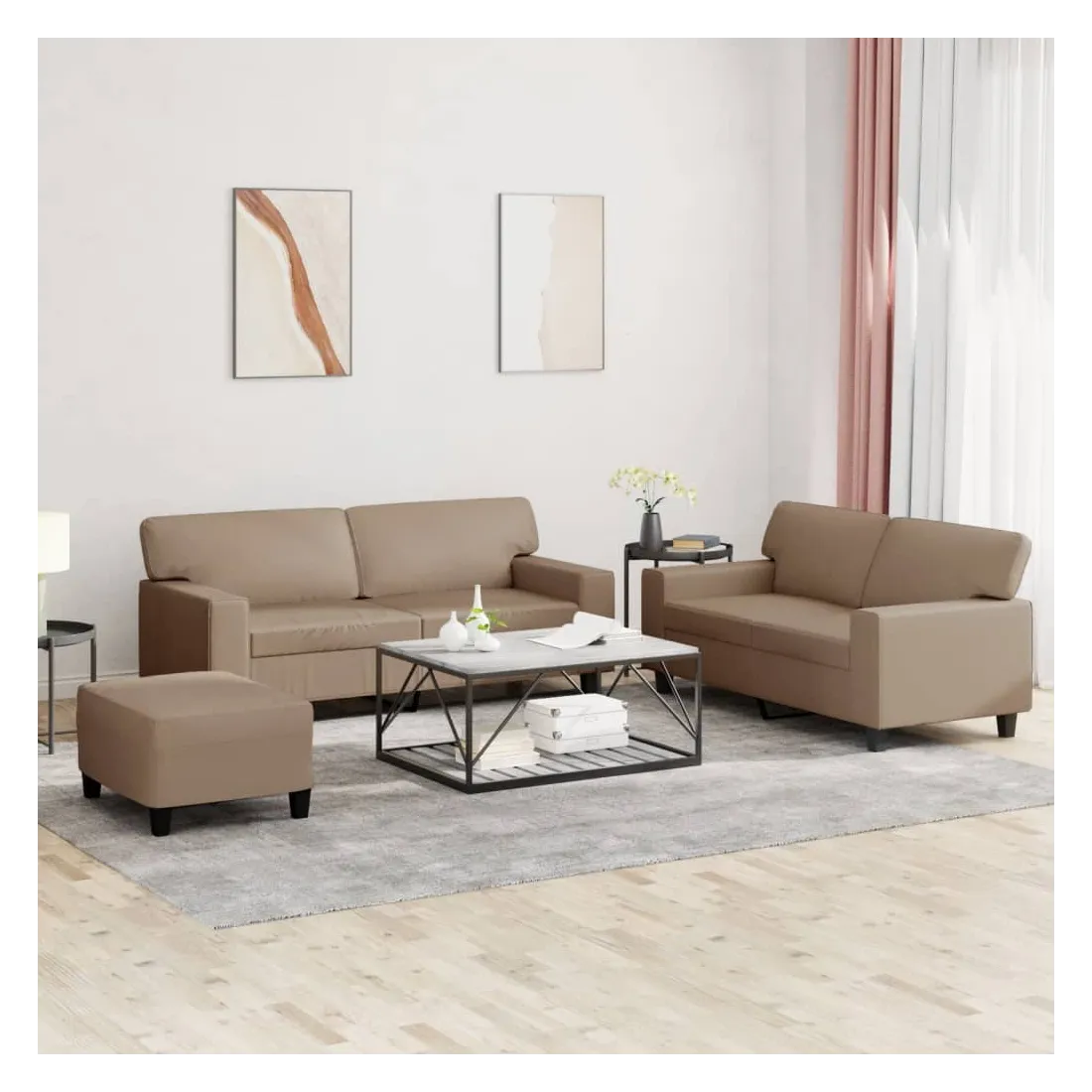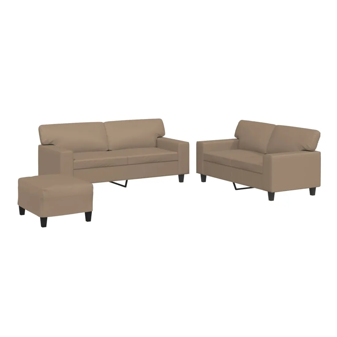 Cet ensemble de canapés est un excellent endroit pour discuter, lire, regarder la télévision ou simplement vous détendre. Il est destiné à être un point central de votre maison. Similicuir durable : le similicuir est un matériau très durable. Il est résistant aux taches, ce qui le rend facile à nettoyer avec un chiffon humide. La surface lisse donne également un aspect luxueux et la beauté du cuir véritable.Structure robuste et stable : la structure en contreplaqué et en métal du canapé assure robustesse et stabilité.Expérience d'assise confortable : le canapé est très confortable avec le siège, les accoudoirs et les oreillers de dossier bien rembourrés.Pouf polyvalent : ce repose-pied convient pour reposer vos pieds lorsque vous êtes allongé dans un canapé ou pour vous offrir un siège supplémentaire dans votre pièce. De plus, le design simple et la taille compacte le rendent idéal pour presque tous vos espaces de vie.