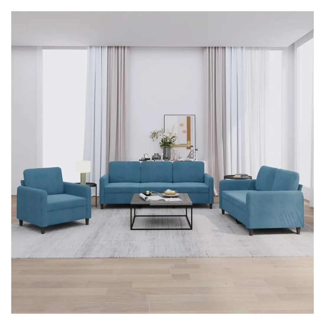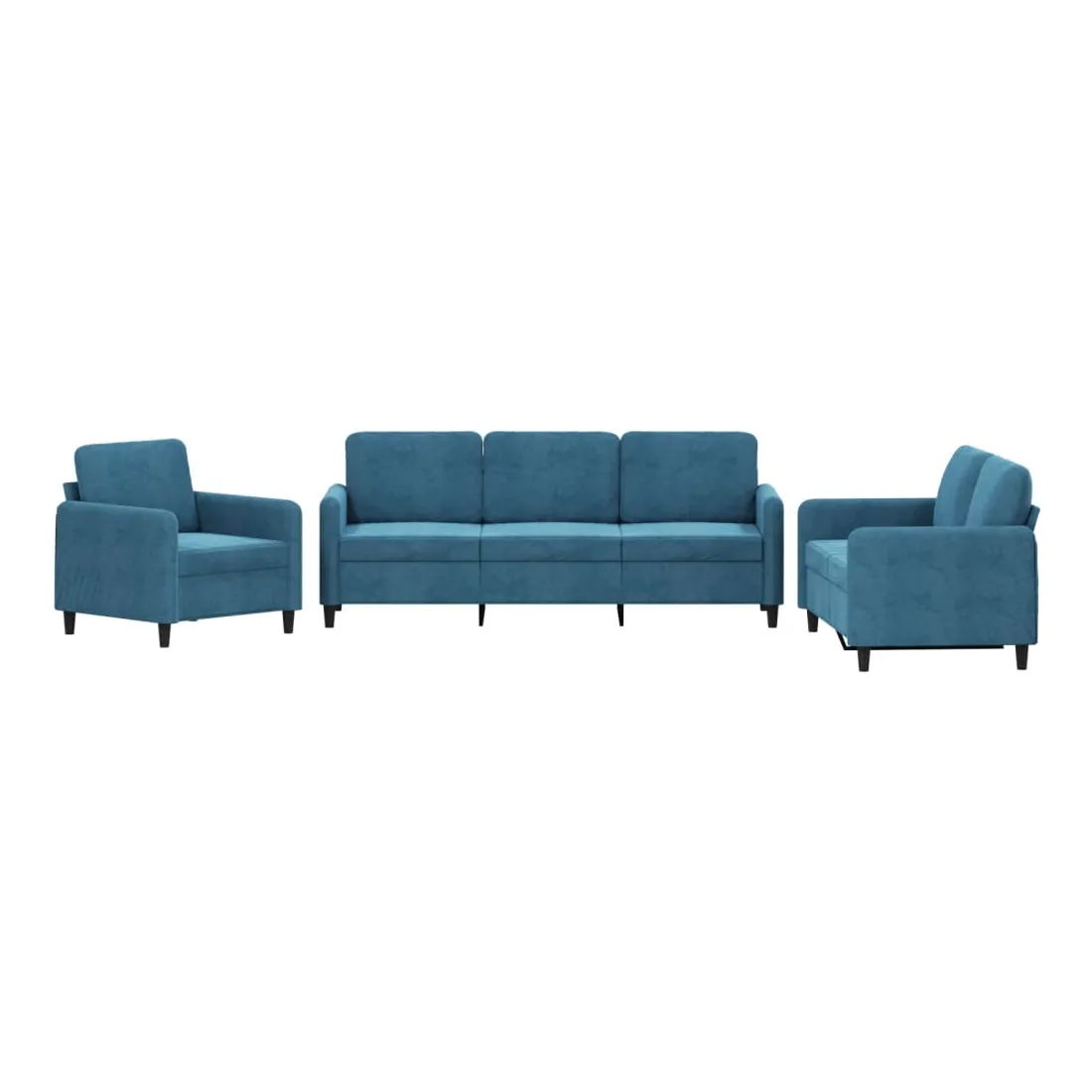 Cet ensemble de canapés est un excellent endroit pour discuter, lire, regarder la télévision ou simplement vous détendre. Il est destiné à être un point central de votre maison. Velours doux : le velours est un tissu doux et confortable, agréable au toucher.Structure robuste et stable : la structure en contreplaqué et en métal du canapé assure robustesse et stabilité.Expérience d'assise confortable : le canapé est très confortable avec le siège, les accoudoirs et les oreillers de dossier bien rembourrés.
