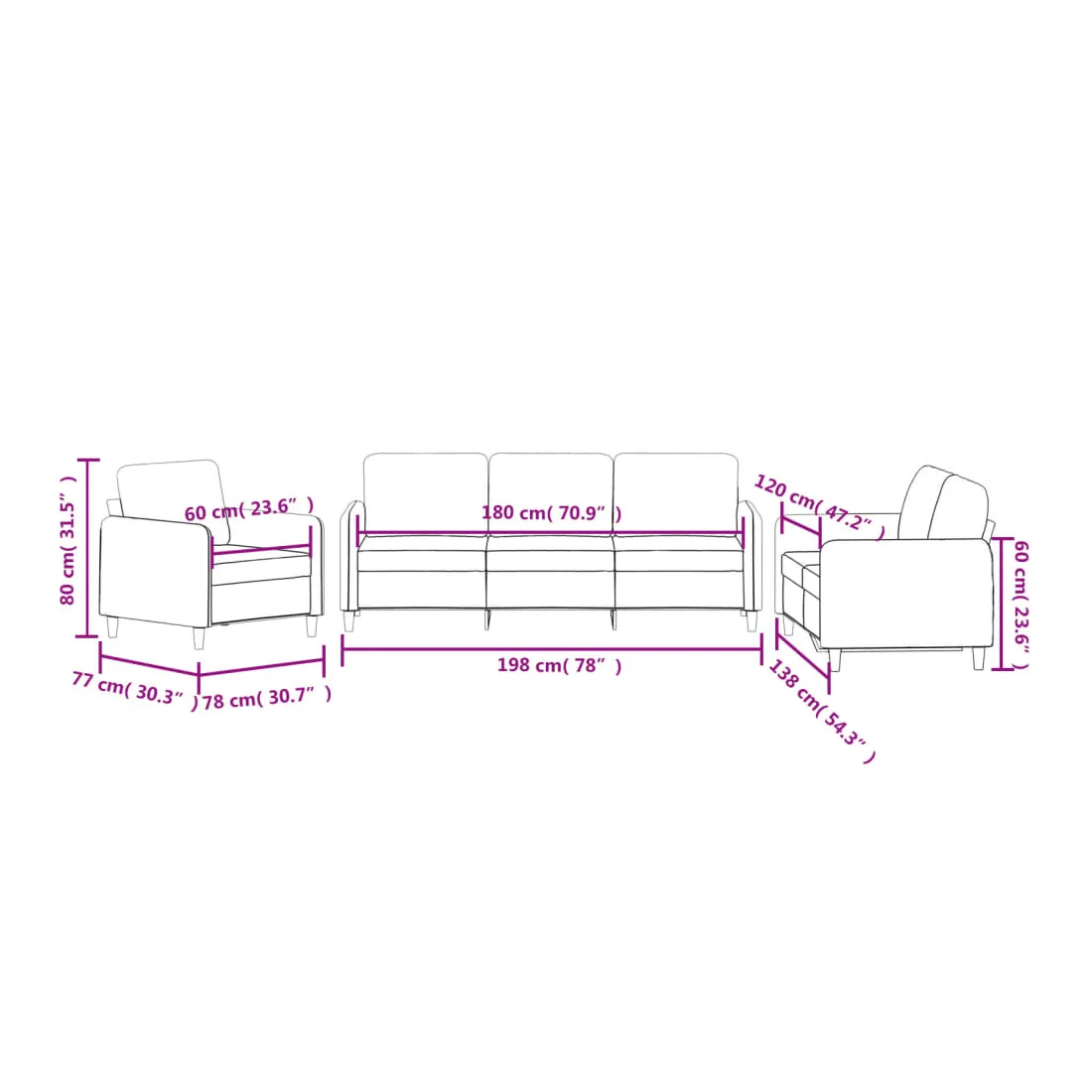 - Dimensions totales : 198 x 77 x 80 cm (l x P x H)