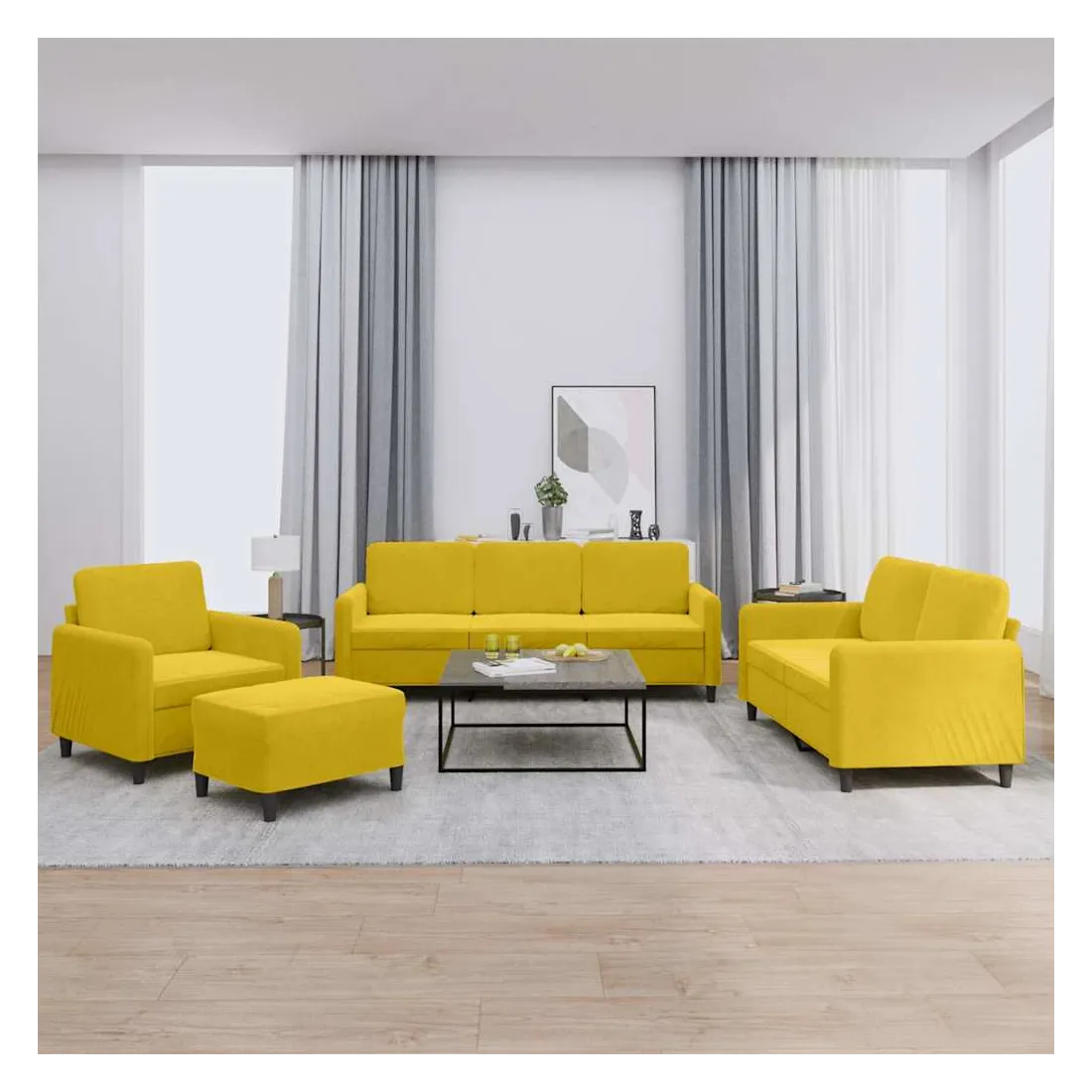 Cet ensemble de canapés est un excellent endroit pour discuter, lire, regarder la télévision ou simplement vous détendre. Il est destiné à être un point central de votre maison. Velours doux : le velours est un tissu doux et confortable, agréable au toucher.Structure robuste et stable : la structure en contreplaqué et en métal du canapé assure robustesse et stabilité.Expérience d'assise confortable : le canapé est très confortable avec le siège, les accoudoirs et les oreillers de dossier bien rembourrés.Pouf polyvalent : ce repose-pied convient pour reposer vos pieds lorsque vous êtes allongé dans un canapé ou pour vous offrir un siège supplémentaire dans votre pièce. De plus, le design simple et la taille compacte le rendent idéal pour presque tous vos espaces de vie.