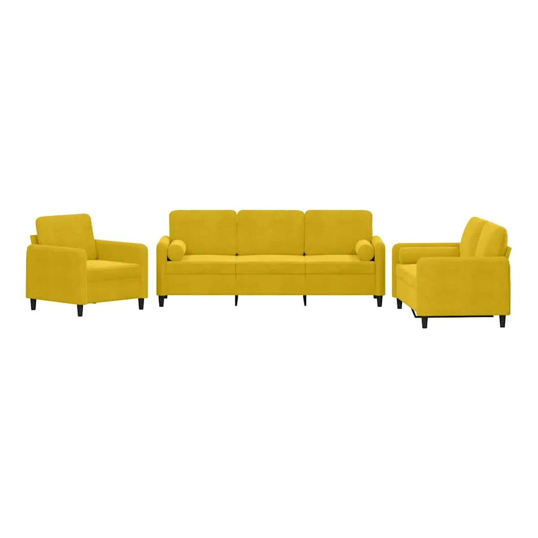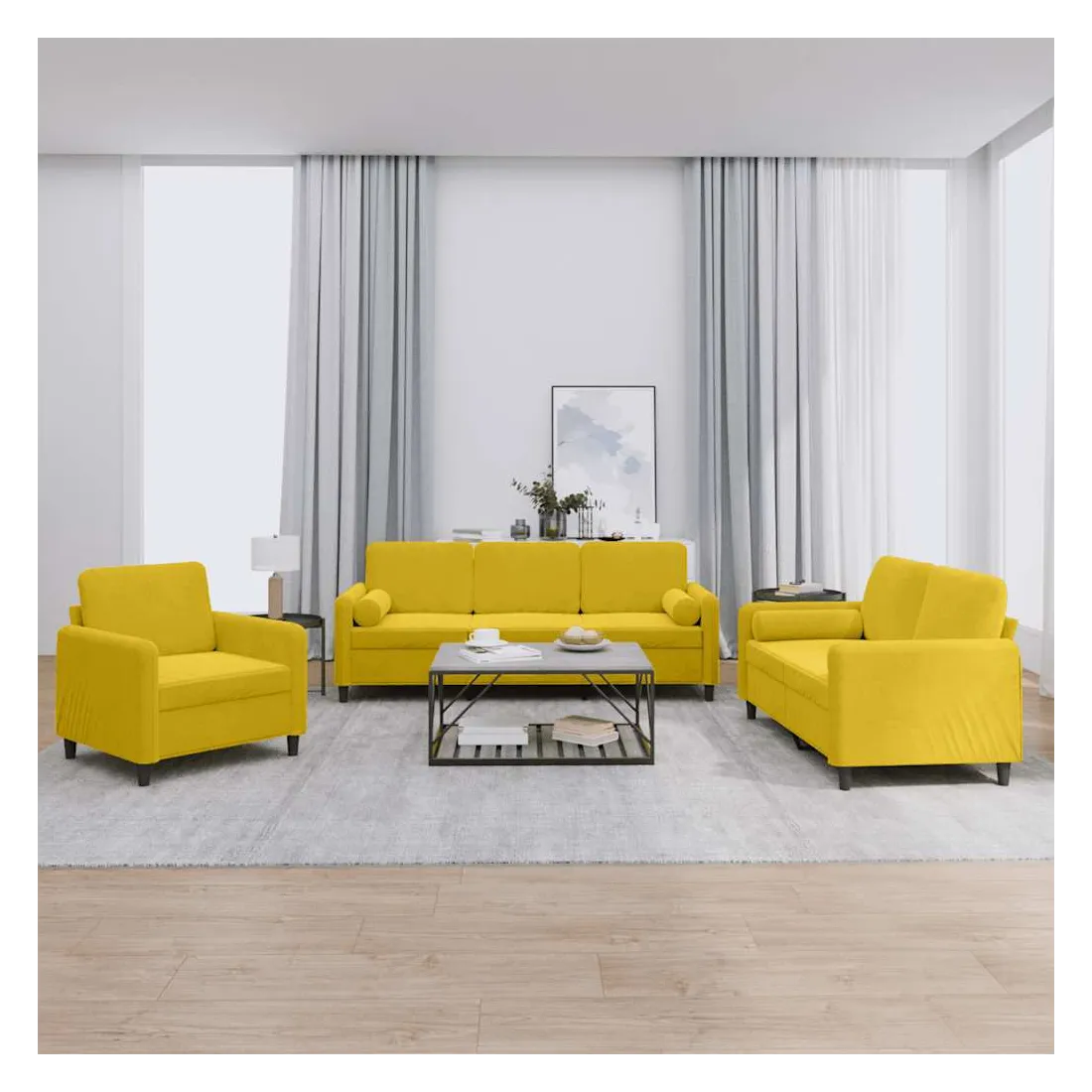 Cet ensemble de canapés est un excellent endroit pour discuter, lire, regarder la télévision ou simplement vous détendre. Il est destiné à être un point central de votre maison. Velours doux : le velours est un tissu doux et confortable, agréable au toucher.Structure robuste et stable : la structure en contreplaqué et en métal du canapé assure robustesse et stabilité.Expérience d'assise confortable : le canapé est très confortable avec le siège, les accoudoirs et les oreillers de dossier bien rembourrés.Oreillers cylindriques pratiques : ces oreillers cylindriques non seulement embellissent votre décor mais ils peuvent également apporter un confort supplémentaire lorsque vous êtes assis ou allongé.