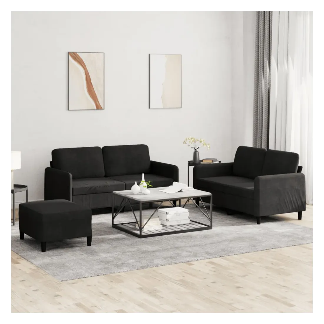 Cet ensemble de canapés est un excellent endroit pour discuter, lire, regarder la télévision ou simplement vous détendre. Il est destiné à être un point central de votre maison. Velours doux : le velours est un tissu doux et confortable, agréable au toucher.Structure robuste et stable : la structure en contreplaqué et en métal du canapé assure robustesse et stabilité.Expérience d'assise confortable : le canapé est très confortable avec le siège, les accoudoirs et les oreillers de dossier bien rembourrés.Pouf polyvalent : ce repose-pied convient pour reposer vos pieds lorsque vous êtes allongé dans un canapé ou pour vous offrir un siège supplémentaire dans votre pièce. De plus, le design simple et la taille compacte le rendent idéal pour presque tous vos espaces de vie.