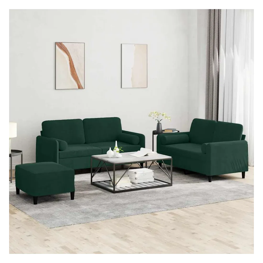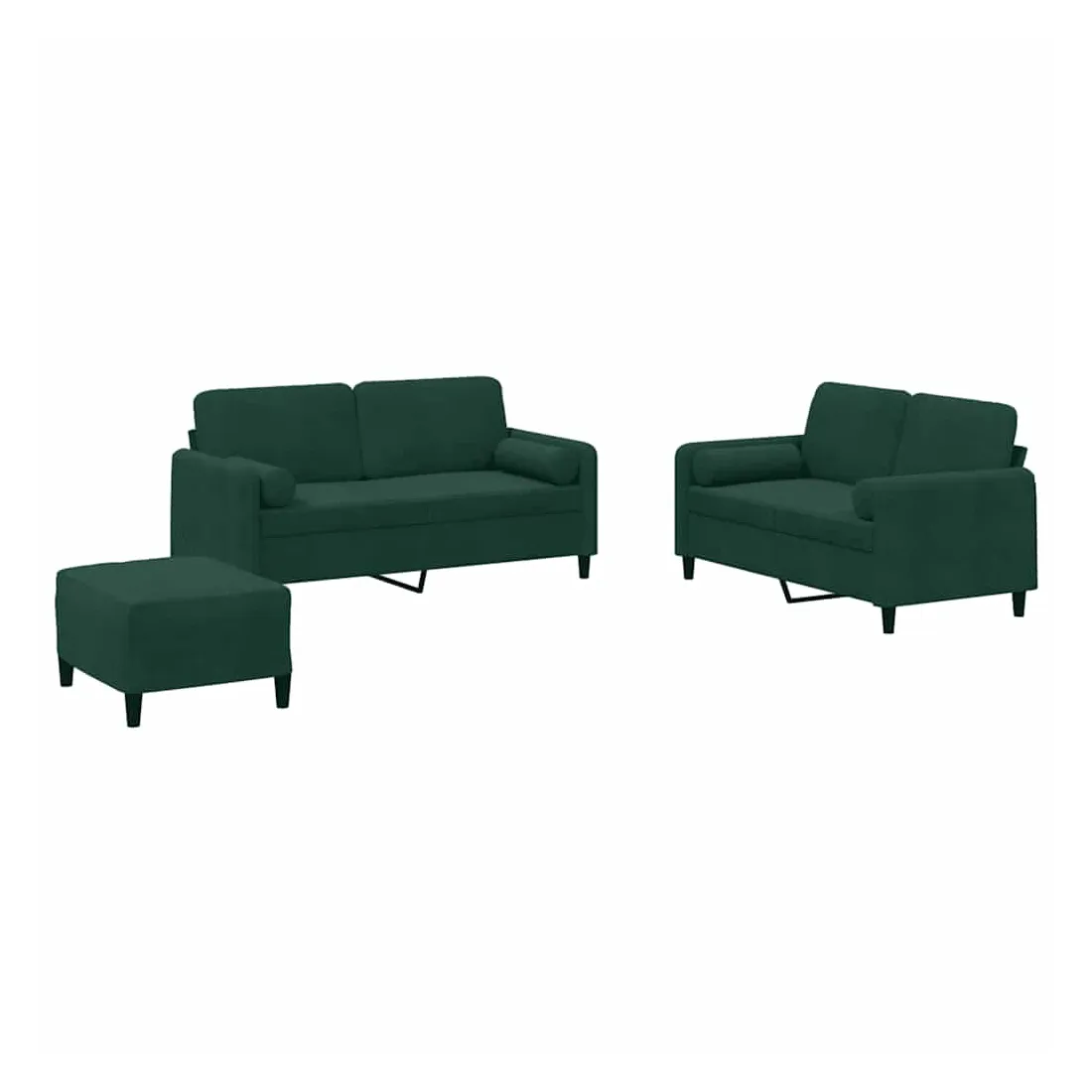Cet ensemble de canapés est un excellent endroit pour discuter, lire, regarder la télévision ou simplement vous détendre. Il est destiné à être un point central de votre maison. Velours doux : le velours est un tissu doux et confortable, agréable au toucher.Structure robuste et stable : la structure en contreplaqué et en métal du canapé assure robustesse et stabilité.Expérience d'assise confortable : le canapé est très confortable avec le siège, les accoudoirs et les oreillers de dossier bien rembourrés.Oreillers cylindriques pratiques : ces oreillers cylindriques non seulement embellissent votre décor mais ils peuvent également apporter un confort supplémentaire lorsque vous êtes assis ou allongé.Pouf polyvalent : ce repose-pied convient pour reposer vos pieds lorsque vous êtes allongé dans un canapé ou pour vous offrir un siège supplémentaire dans votre pièce. De plus, le design simple et la taille compacte le rendent idéal pour presque tous vos espaces de vie.