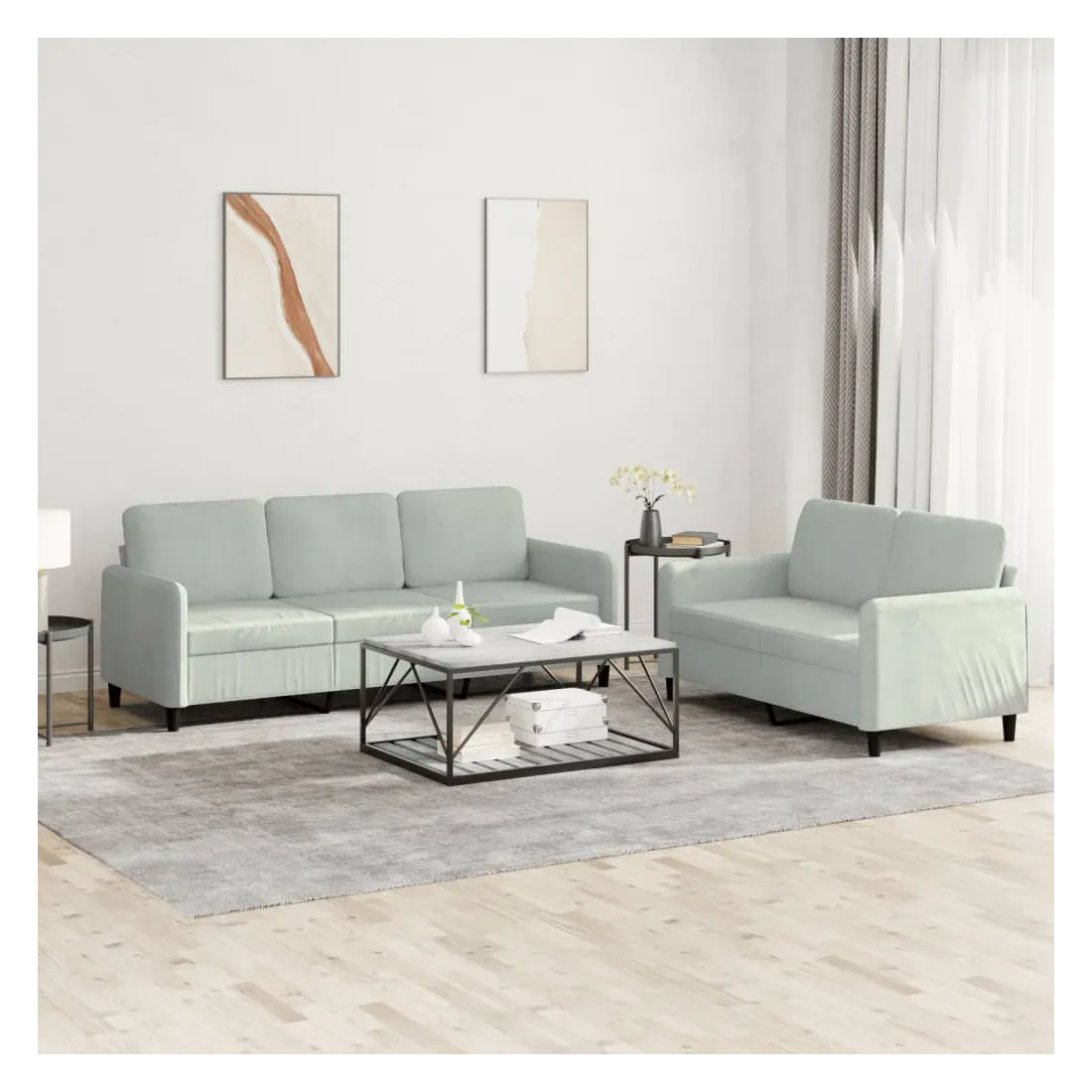 Cet ensemble de canapés est un excellent endroit pour discuter, lire, regarder la télévision ou simplement vous détendre. Il est destiné à être un point central de votre maison. Velours doux : le velours est un tissu doux et confortable, agréable au toucher. Structure robuste et stable : la structure en contreplaqué et en métal du canapé assure robustesse et stabilité. Expérience d'assise confortable : le canapé est très confortable avec le siège, les accoudoirs et les oreillers de dossier bien rembourrés.