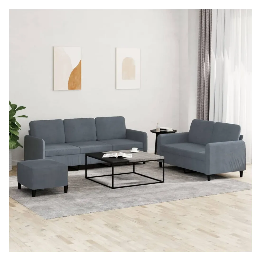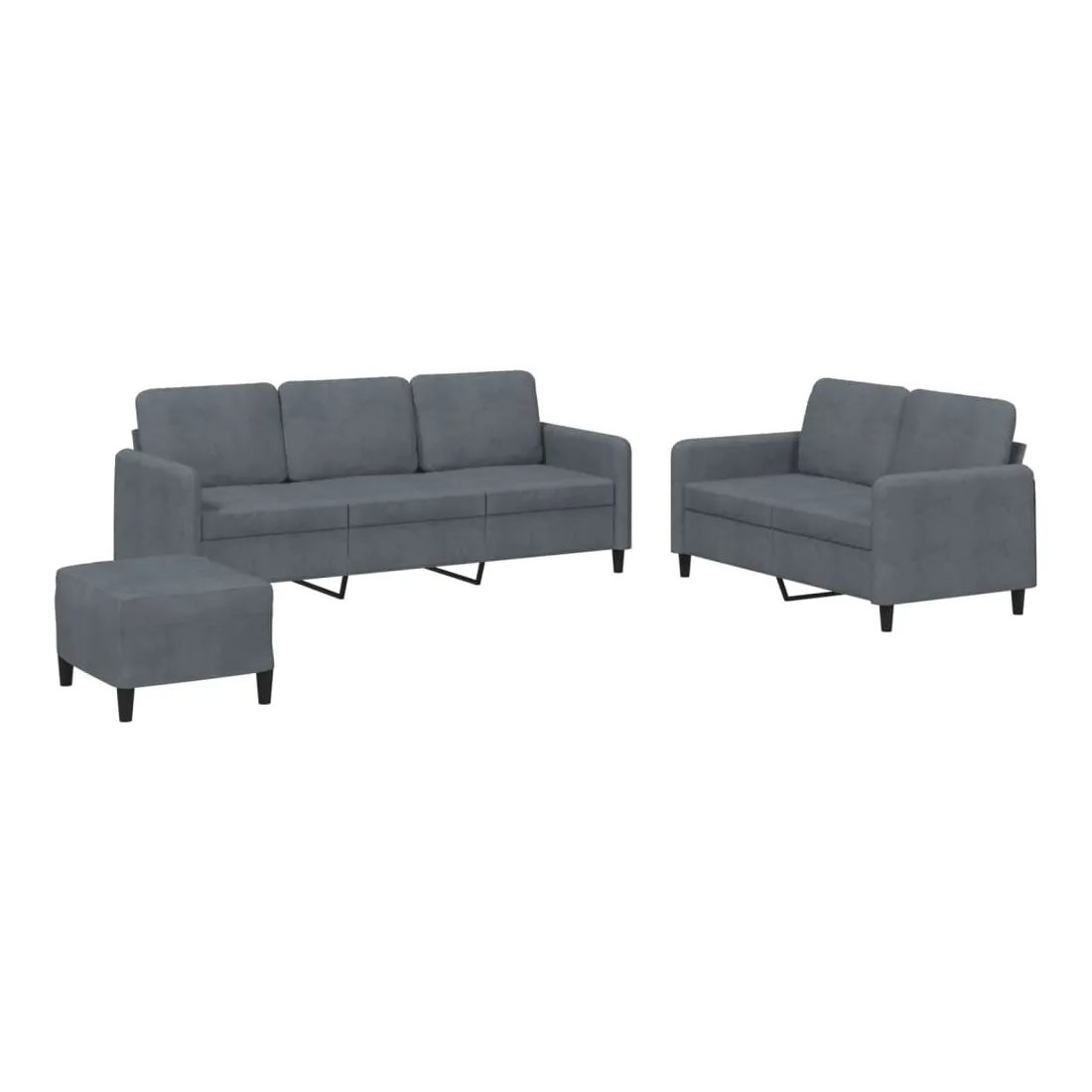 Cet ensemble de canapés est un excellent endroit pour discuter, lire, regarder la télévision ou simplement vous détendre. Il est destiné à être un point central de votre maison. Velours doux : le velours est un tissu doux et confortable, agréable au toucher.Structure robuste et stable : la structure en contreplaqué et en métal du canapé assure robustesse et stabilité.Expérience d'assise confortable : le canapé est très confortable avec le siège, les accoudoirs et les oreillers de dossier bien rembourrés.Pouf polyvalent : ce repose-pied convient pour reposer vos pieds lorsque vous êtes allongé dans un canapé ou pour vous offrir un siège supplémentaire dans votre pièce. De plus, le design simple et la taille compacte le rendent idéal pour presque tous vos espaces de vie.