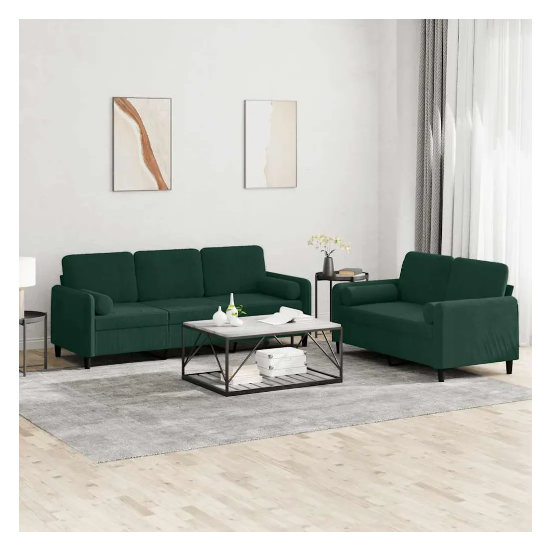Cet ensemble de canapés est un excellent endroit pour discuter, lire, regarder la télévision ou simplement vous détendre. Il est destiné à être un point central de votre maison. Velours doux : le velours est un tissu doux et confortable, agréable au toucher.Structure robuste et stable : la structure en contreplaqué et en métal du canapé assure robustesse et stabilité.Expérience d'assise confortable : le canapé est très confortable avec le siège, les accoudoirs et les oreillers de dossier bien rembourrés.Oreillers cylindriques pratiques : ces oreillers cylindriques non seulement embellissent votre décor mais ils peuvent également apporter un confort supplémentaire lorsque vous êtes assis ou allongé.
